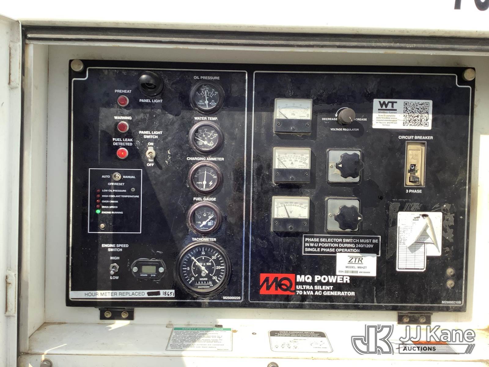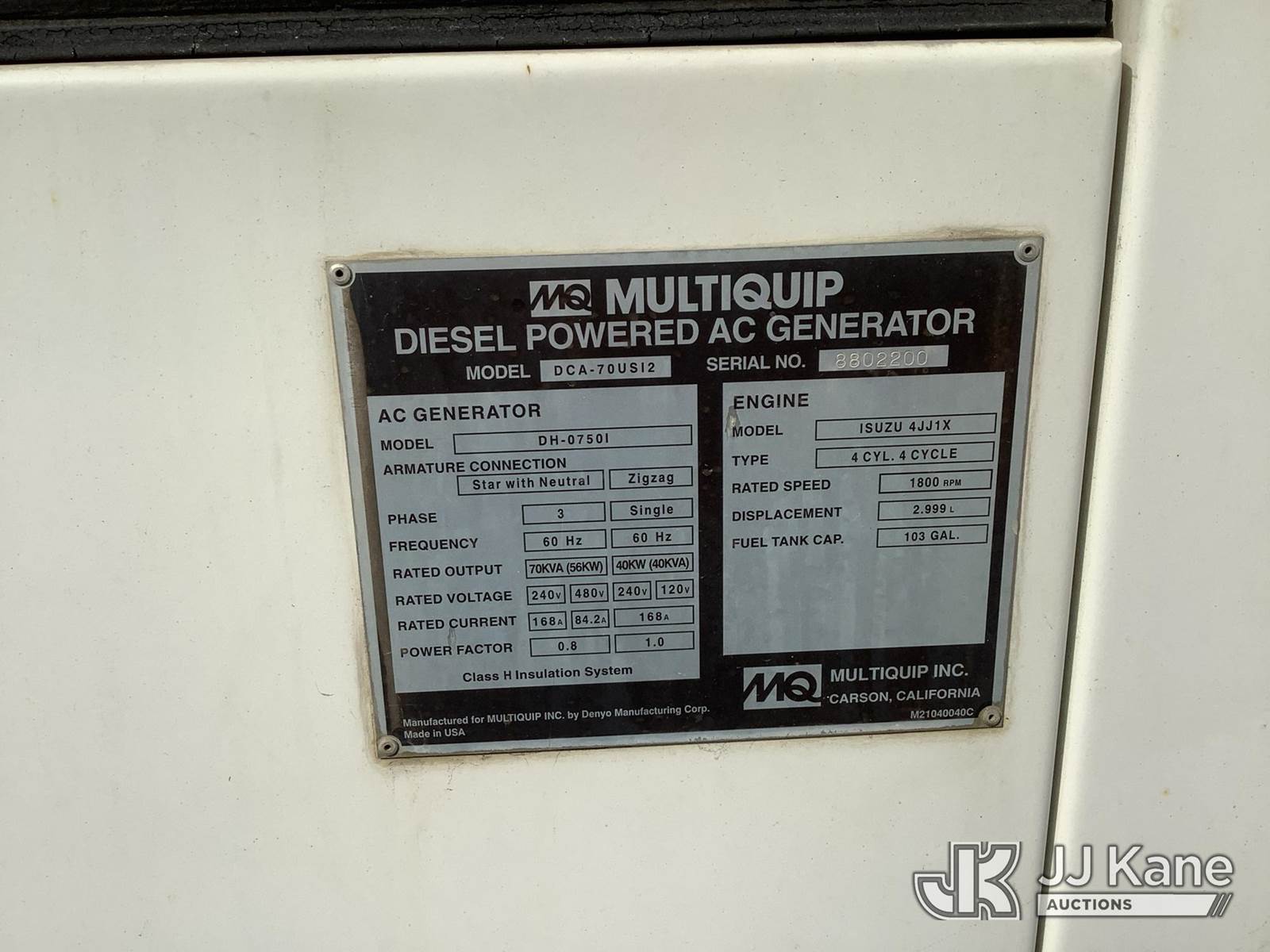 2012 MultiQuip DCA-70USI2 Generator, s/n 8802200, 4-cyl, Diesel, 3 Ph, 56KW, 208/480 Volt, 60HZ (No Title) (Runs & Produces Power, Houreter Inop) (Removal is by Appointment Only, Buyer MUST make a appointment prior to picking up, Buyer/Transporter Must have PAID IN FULL RELEASE. No onsite assistance available, Please Come prepared.) NOTE: This unit is being sold AS IS/WHERE IS via Timed Auction and is located in Harmans, MD. Inspection & preview days for this unit are by appointment only; please contact us at contact@jjkane.com or 84-Go-JJKane for more details. For pre-sale questions, please contact the on-site office @ (443) 557-0025 or Kevin.Waggoner@JJKane.com. (Buyer is responsible for removal. Assistance by consignor or JJ Kane Auctions is not assured.)