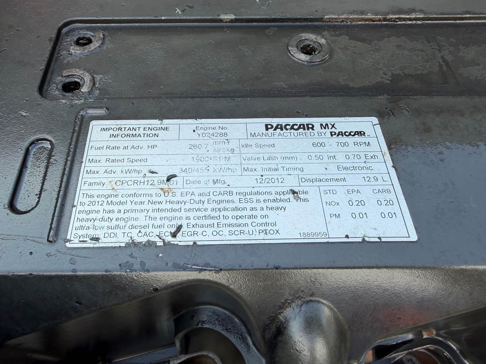 (GOOD USED/ RUN TESTED/ FULLY INSPECTED) 2012 Paccar MX-13 Diesel Engine (EPA10), Serial # Y024288, Engine Family # CPCRH12.9M01, Displacement 12.9L, 455 HP RATED @ 1900 RPM, TEST RUN WATCH VIDEO ON JJ REBUILDERS WEBSITE, Perfect Runner! Fully Inspected! Low Miles! Visit JJREBUILDERS for more information on this and any other diesel engine. Call 786-377-5210 for more information. REF INV # 006722