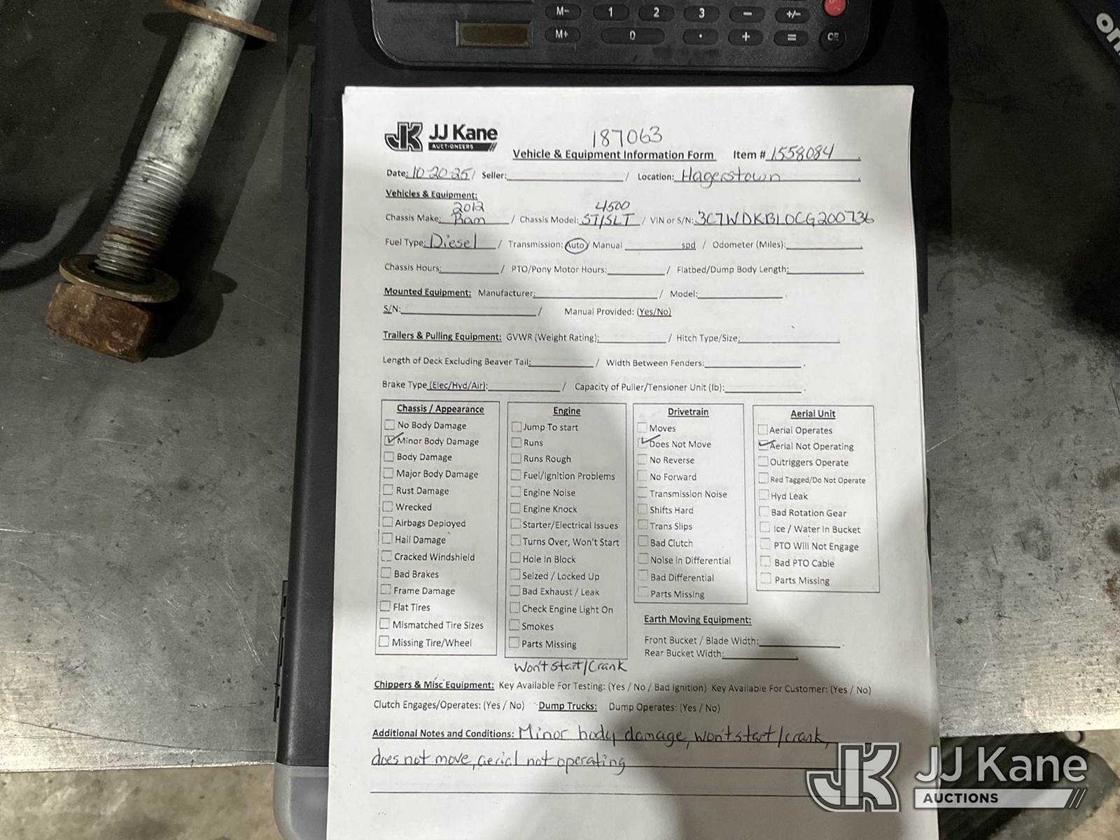Versalift TEL29N, 34 ft, Telescopic Bucket Truck with single-man bucket, mounted behind cab on 2012 Ram 4500 Service Truck, 6.7L L6 Diesel, Auto, A/C, True Mileage Unknown (Not Running, Condition Unknown, Removed, Upper Serial Plate, Body Damage) This is a Titled Item NOTE: This unit is being sold AS IS/WHERE IS via Timed Auction and is located in Hagerstown, MD. Inspection & preview days for this unit are by appointment only; please contact us at contact@jjkane.com or 84-Go-JJKane for more details. For pre-sale questions, please contact the on-site office @ (301) 895-7777 or Kevin.Waggoner@JJKane.com. (Missing manuals, See Auction Company for Manufacturers Information to obtain manuals) (Buyer is responsible for removal. Assistance by consignor or JJ Kane Auctioneers is not assured.)