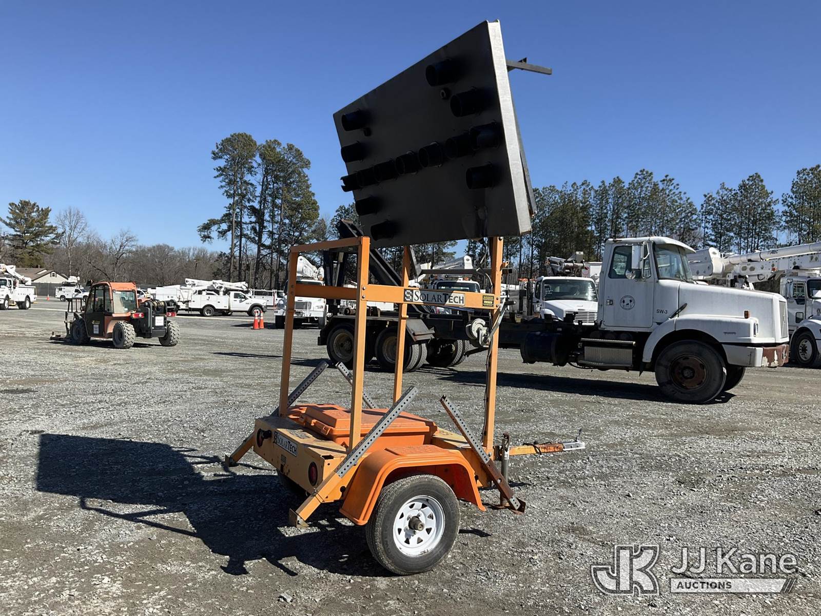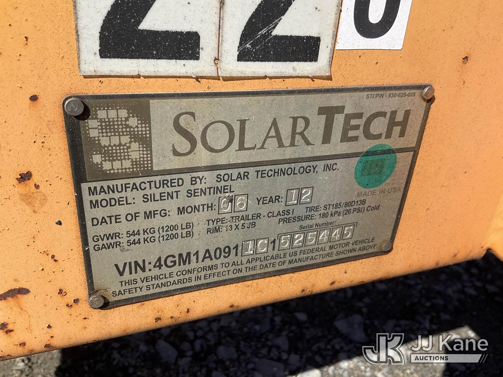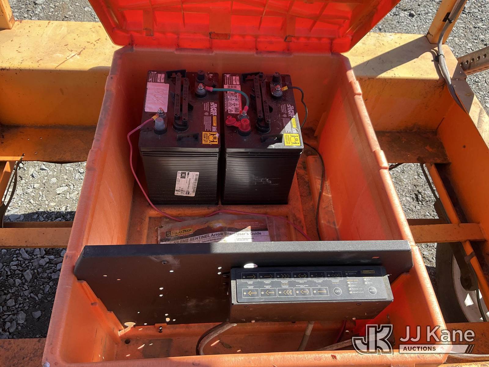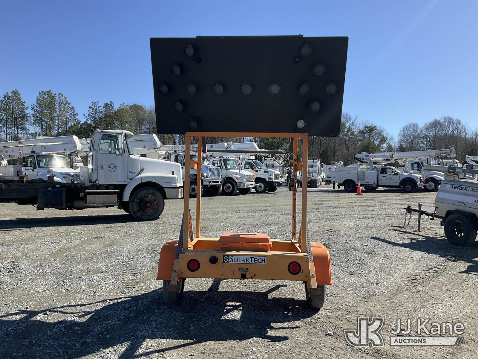 2012 Solar Tech Portable Arrow Board, s/n 4GM1A0911C1525445, Solar/Battery Powered, trailer mtd. (No Title) (Operates) NOTE: This unit is being sold AS IS/WHERE IS via Timed Auction and is located in China Grove, NC. Inspection & preview days for this unit are the 2 business days prior to the first day of items closing for this auction, item is located at 820 E NC Hwy 152 China Grove, NC 28023 and hours of operations are 8a-4p. For pre-sale questions, please contact Office Staff @ (704) 674-1113. (Buyer is responsible for removal. Assistance by consignor or JJ Kane Auctions is not assured.)