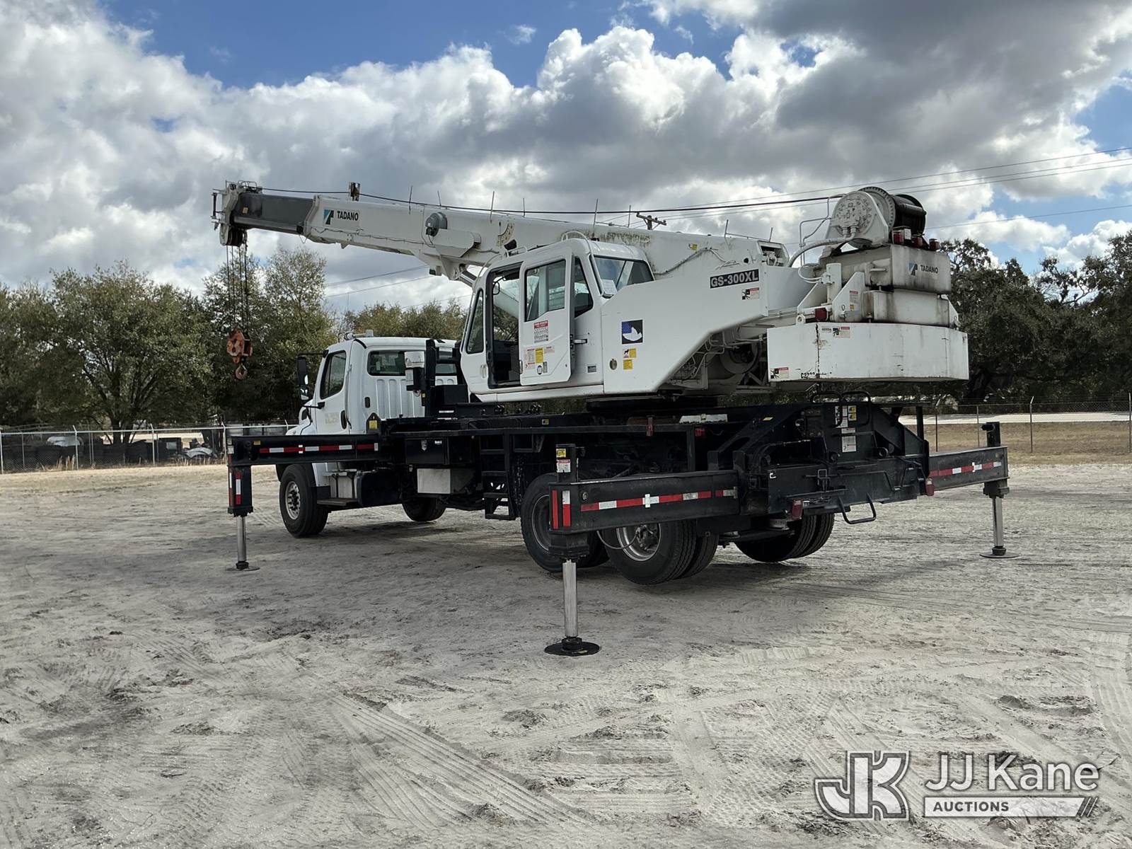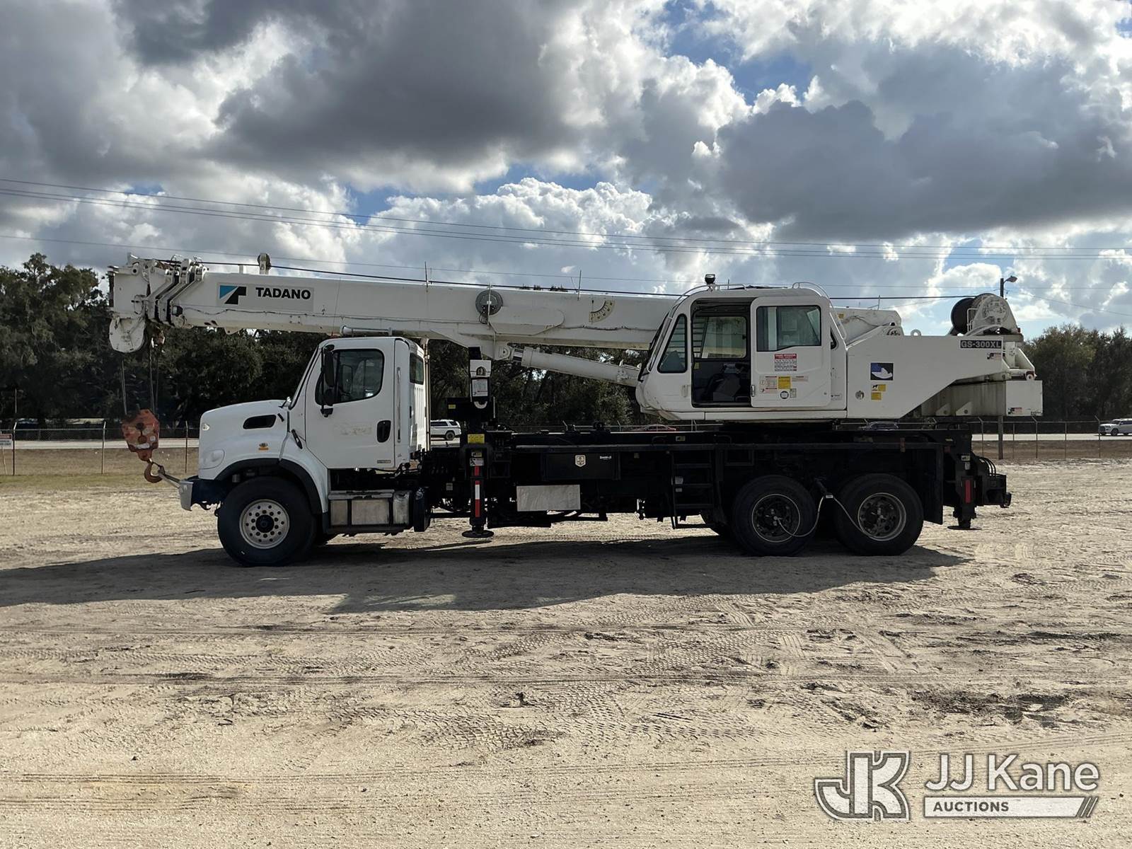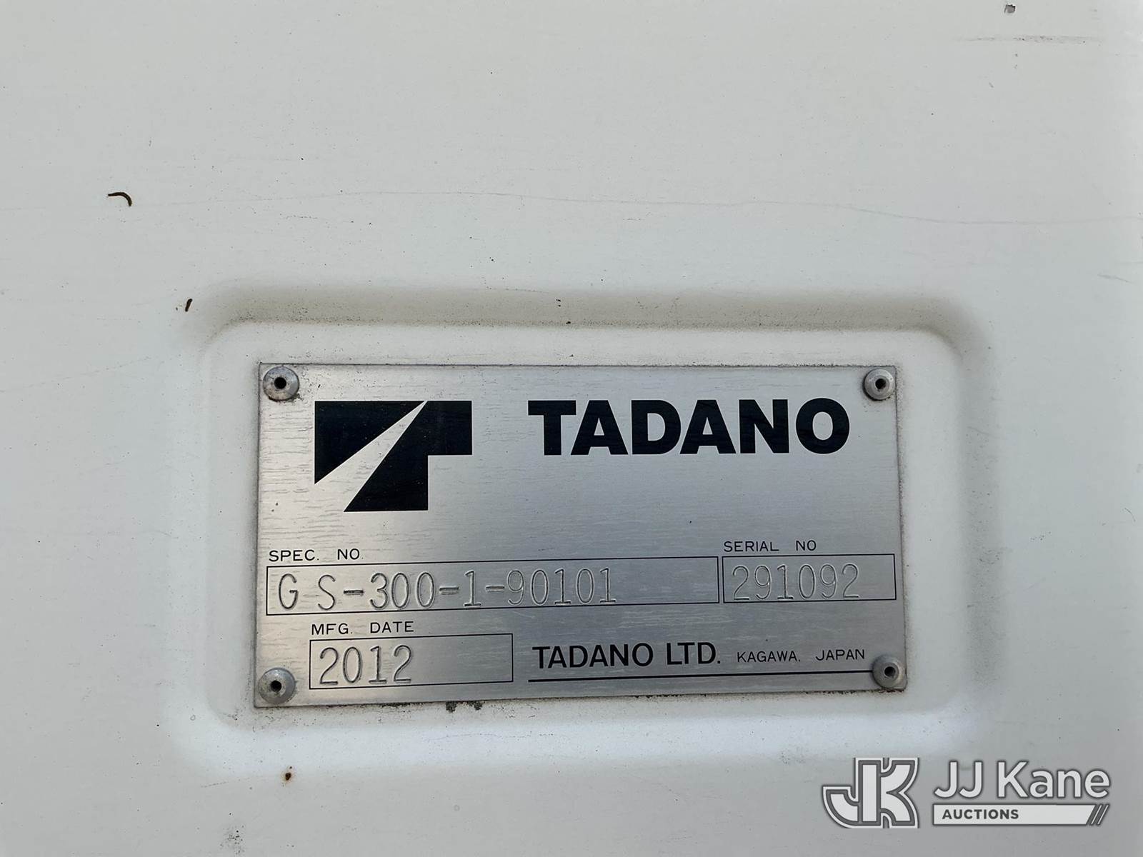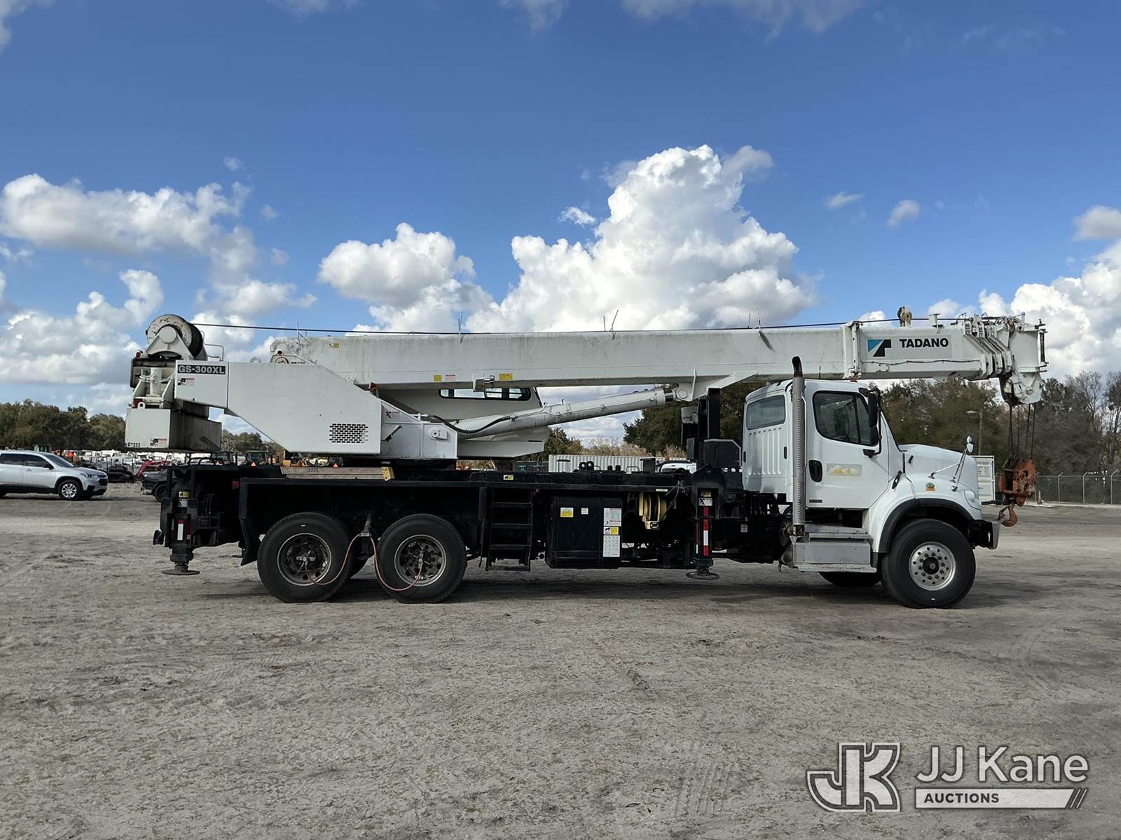 Tadano GS-300XL, 30-Ton Hydraulic Truck Crane s/n 291092, with 103 ft. sheave height, 32.8 ft. to 93.5 ft. of 4 section hyd boom, heel winch, hook block, anti two-block, Tadano LMI, enclosed riding console & 4 hyd out and down outriggers, rear mounted on 2012 Freightliner M2 106 Flatbed Truck, s/n 1FVHC3BS3CHBS4190, 8.3L L6 diesel, 6X4, 8-spd + Lo & Lo-Lo, A/C, with Tire Boss pressure system, (073520m miles) Electric Company Owned and Maintained. (Runs, Moves & Operates) (Radio Not Included) (exempt from odometer disclosure) (FL Residents Purchasing Titled Items – tax, title & registration fees will be collected at the maximum rate of $400.00 under 25,999 and $800.00 for Over 26,000 and $250.00 trailers – Proof of insurance is mandatory; Out of State Residents Purchasing Title Items – tax will be collected based upon your state rate) (Reads 9,385 hours) This is a Titled Item NOTE: This unit is being sold AS IS/WHERE IS via Timed Auction and is located in Thonotosassa, FL. Inspection & preview days for this unit are the 2 business days prior to the first day of items closing for this auction, item is located at 11720 N US 301 Thonotosassa, Fl 33592 and hours of operations are 8a-4p. For pre-sale questions, please contact Office Staff @ (813) 986-2485. (Manuals provided in cab) (Buyer is responsible for removal. Assistance by consignor or JJ Kane Auctions is not assured.)