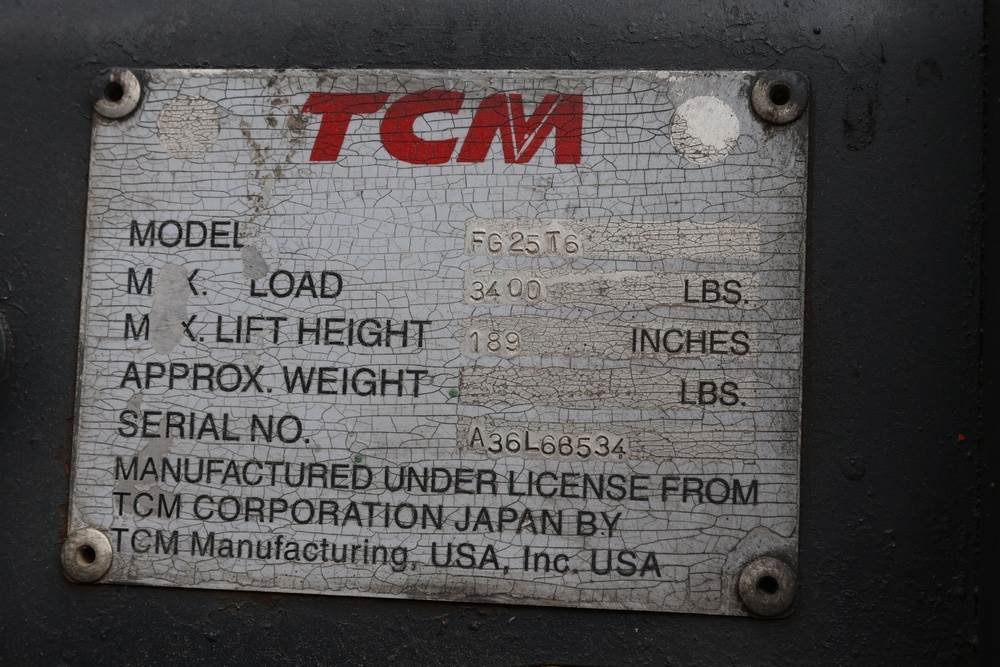 2012 TCM model FG25T6 Forklift 5000 pound PIN: A36L66534. Hour meter reading: 3641. Seller reports: Operates as intended. Seller ID # 524-19.