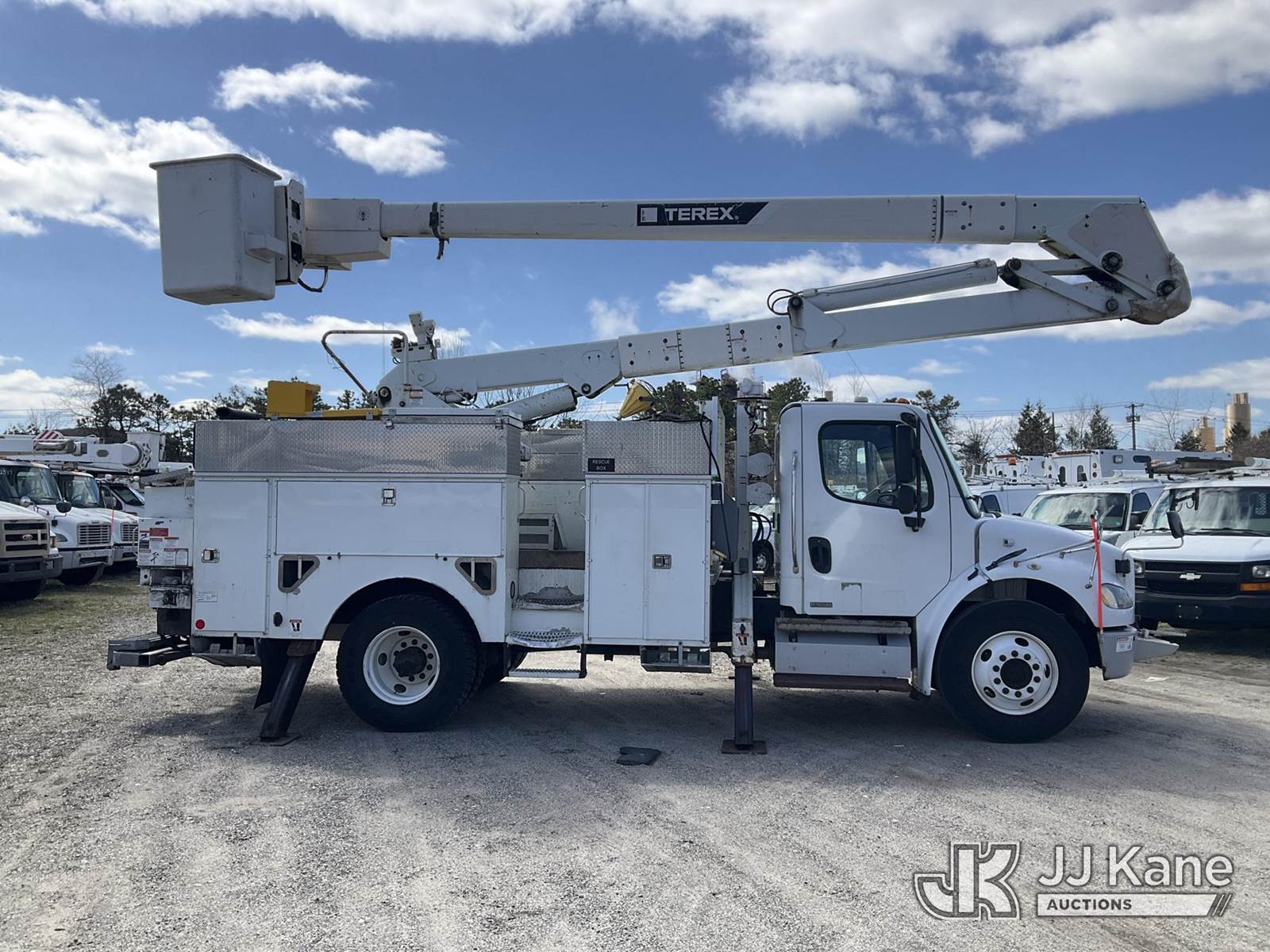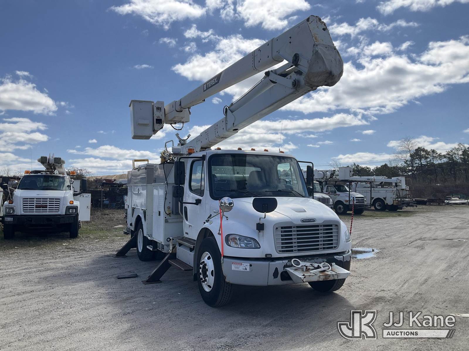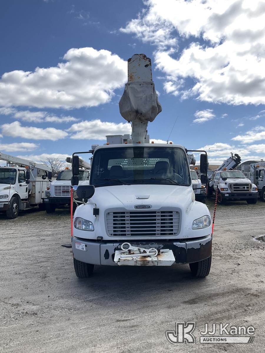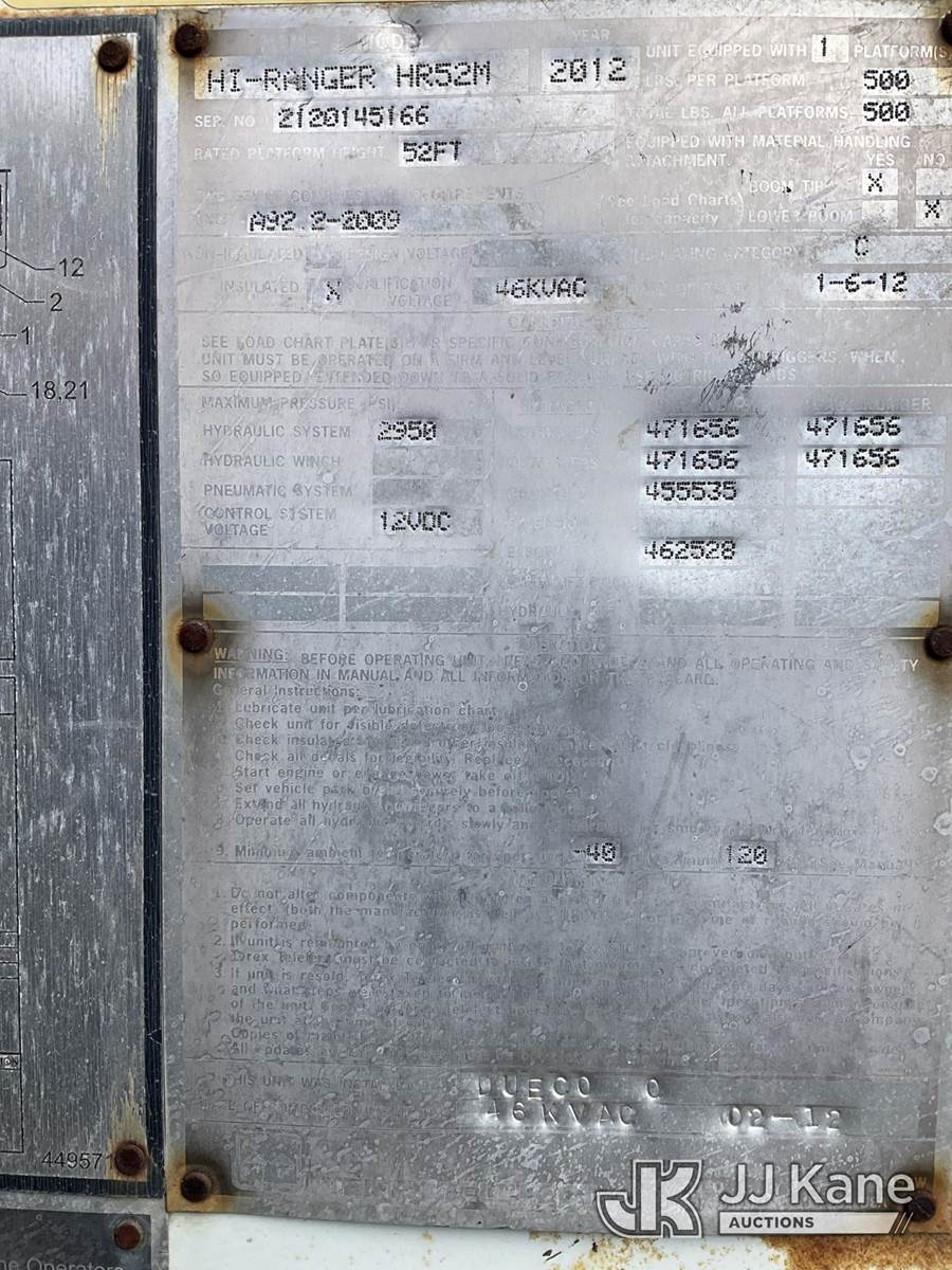 Terex/HiRanger HR52M, 57 ft, Material Handling Bucket Truck s/n 2120145166, with Single Man Bucket & 4 Outriggers , center mounted on 2012 Freightliner M2 106 Utility Truck, 6.7L diesel, Auto, A/C, (63,950 miles) (Runs & Moves & Upper Operates) (DEF Light On) (Removal is by Appointment Only, Buyer MUST make a appointment prior to picking up, Buyer/Transporter Must have PAID IN FULL RELEASE. No onsite assistance available, Please Come prepared.) This is a Titled Item NOTE: This unit is being sold AS IS/WHERE IS via Timed Auction and is located in Bellport, NY. Inspection & preview days for this unit are by appointment only; please contact us at contact@jjkane.com or 84-Go-JJKane for more details. (Missing manuals, See Auction Company for Manufacturers Information to obtain manuals) (Buyer is responsible for removal. Assistance by consignor or JJ Kane Auctions is not assured.)