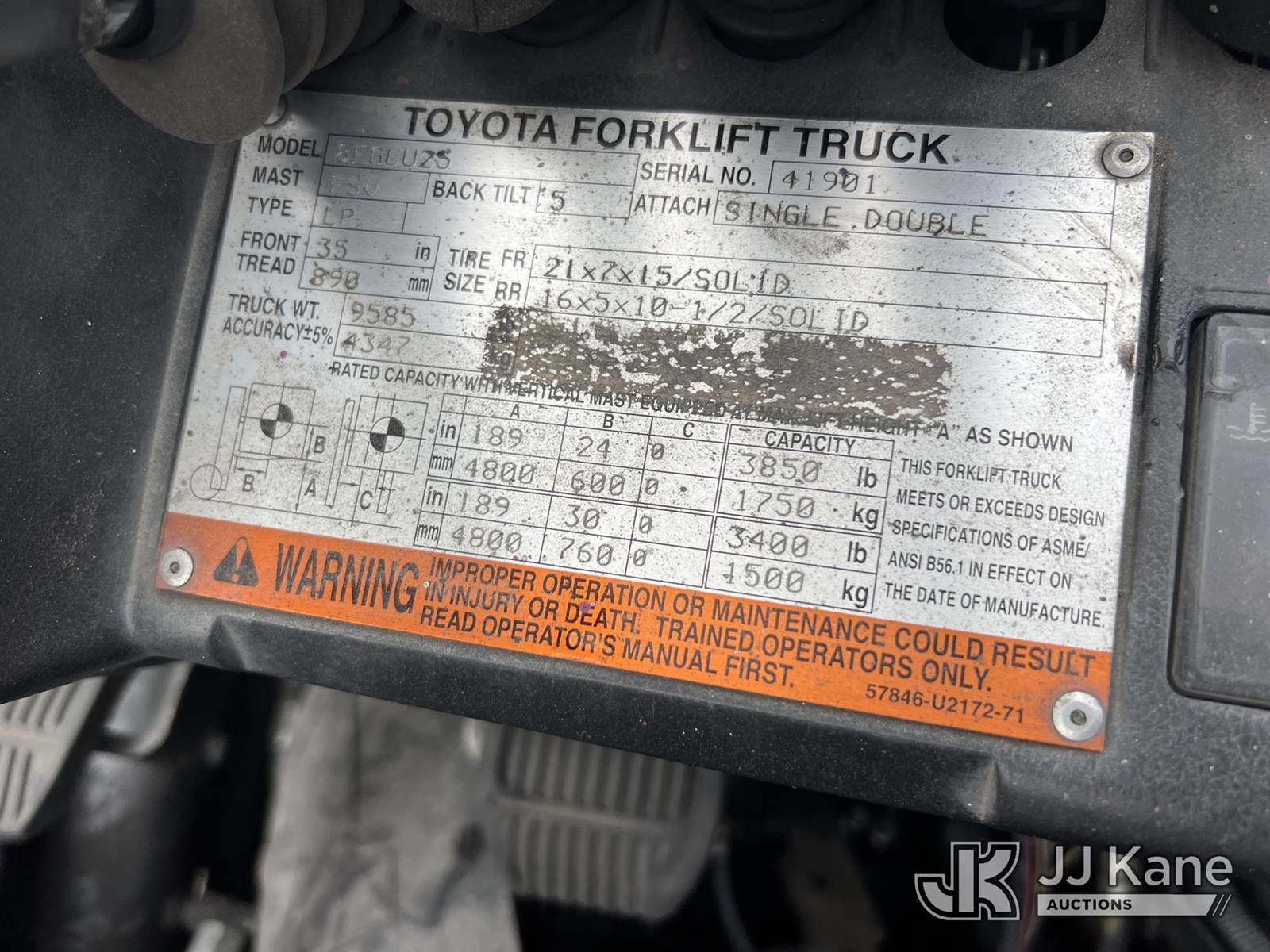 2012 Toyota 8FGCU25 Solid Tired Forklift, s/n 41901, 4-cyl, LPG Shuttle, with 3850 lb. lift capacity, 189 in mast height, 3-stage mast, open/close MP clamp, side shift & ROPS, (Not Running, Missing Parts, Hyd Disassembled, Missing, Key, Missing LPG Tank, Condition Unknown) (BUYER MUST LOAD) NOTE: This unit is being sold AS IS/WHERE IS via Timed Auction and is located in Villa Rica, GA. Inspection & preview days for this unit are the 2 business days prior to the first day of items closing for this auction, item is located at 100 Liberty Rd Villa Rica, GA 30180 and hours of operations are 8a-4p. For pre-sale questions, please contact Office Staff @ (470) 590-8453. (Buyer is responsible for removal. Assistance by consignor or JJ Kane Auctions is not assured.)