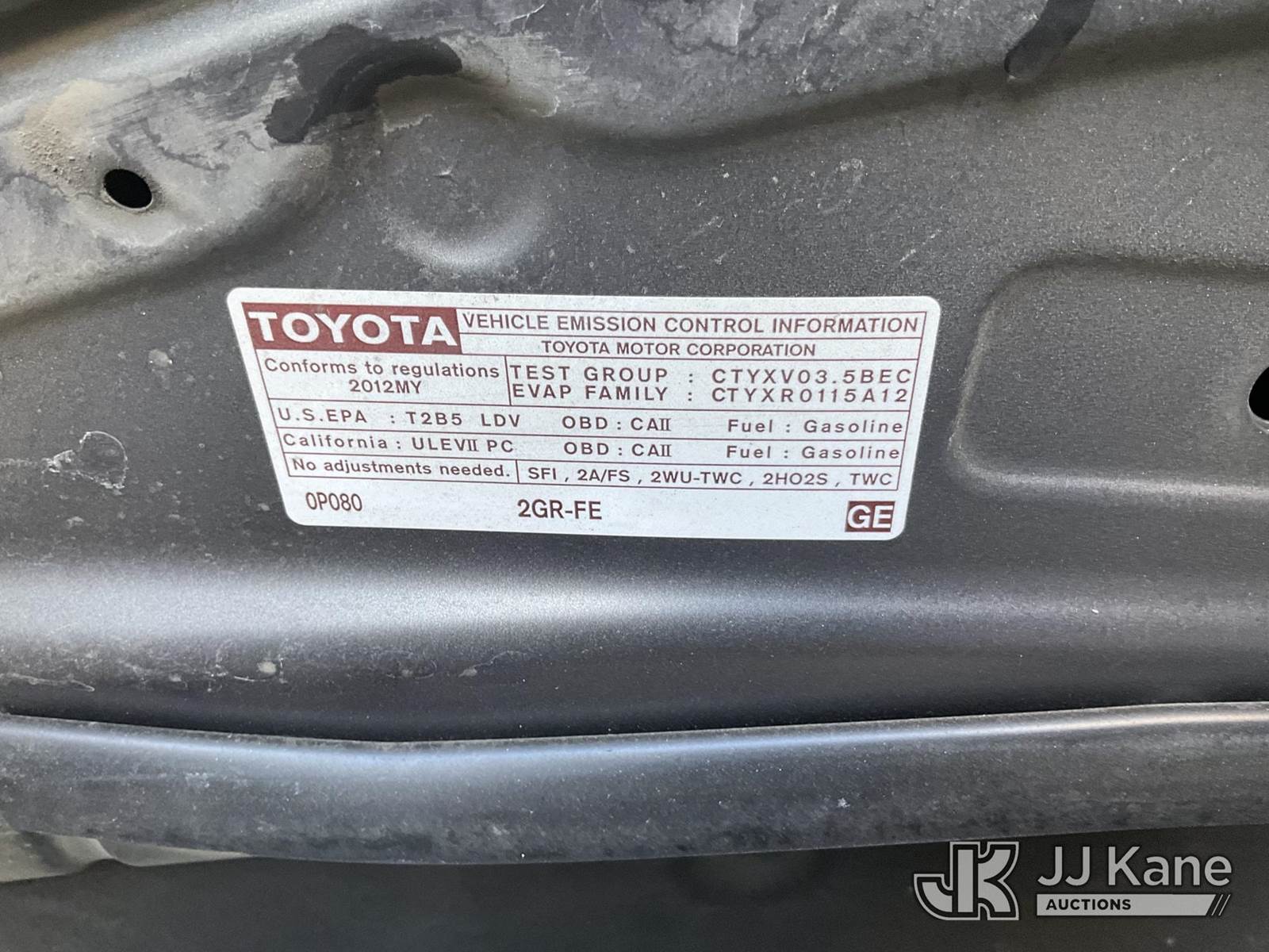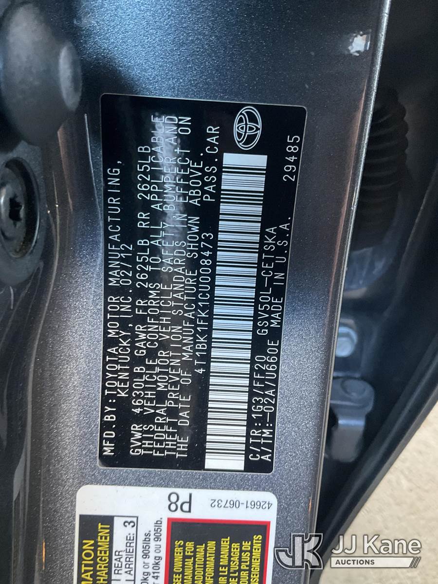 2012 Toyota Camry 4-Door Sedan, 3.5L V6 DOHC 24V Gas 6-Speed Automatic, FWD, A/C, (98,262 miles) (Runs & Moves) (Engine Light On, Traction Control Light On) (Bidding Restricted to Licensed Vehicle Dealers Only), This is a Titled Item NOTE: This unit is being sold AS IS/WHERE IS via Timed Auction and is located in Jurupa Valley, CA. Inspection & preview days for this unit are the 2 business days prior to the first day of items closing for this auction, item is located at 4510 Muth Way Jurupa Valley, CA 92509 and hours of operations are 8a-4p. For pre-sale questions, please contact please contact Office Staff @ (310) 353-7140. Dealer License Number 45696. (Buyer is responsible for removal. Assistance by consignor or JJ Kane Auctions is not assured.)