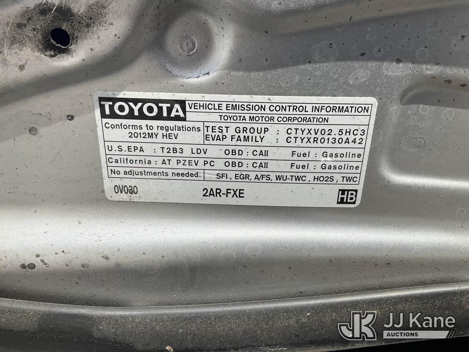 2012 Toyota Camry Hybrid 4-Door Sedan, s/n 4T1BD1FK6CU053984, 2.5L L4 DOHC 16V Gas/Electric FWD, Continuously Variable Transmission, A/C, True Mileage Unknown (Not Running, Condition Unknown) (No Key, Wrecked On Driver Side, Airbags Deployed, Broke Driver Window, Must Be Towed) (Bidding Restricted to Licensed Vehicle Dealers Only), This is a Titled Item NOTE: This unit is being sold AS IS/WHERE IS via Timed Auction and is located in Jurupa Valley, CA. Inspection & preview days for this unit are the 2 business days prior to the first day of items closing for this auction, item is located at 4510 Muth Way Jurupa Valley, CA 92509 and hours of operations are 8a-4p. For pre-sale questions, please contact please contact Office Staff @ (310) 353-7140. Dealer License Number 45696. (Buyer is responsible for removal. Assistance by consignor or JJ Kane Auctions is not assured.)