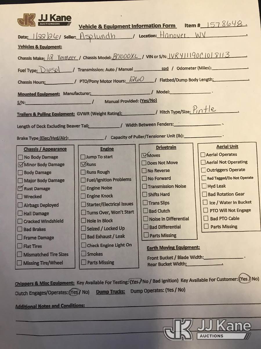 2012 Vermeer BC1000XL Chipper (12in Drum), s/n 1VRY11190C1018113, diesel, trailer mtd. (No Title) (Runs) (Reads 1,260 hours) NOTE: This unit is being sold AS IS/WHERE IS via Timed Auction and is located in Hanover, WV. Inspection & preview days for this unit are by appointment only; please contact us at contact@jjkane.com or 84-Go-JJKane for more details. (Buyer is responsible for removal. Assistance by consignor or JJ Kane Auctions is not assured.)