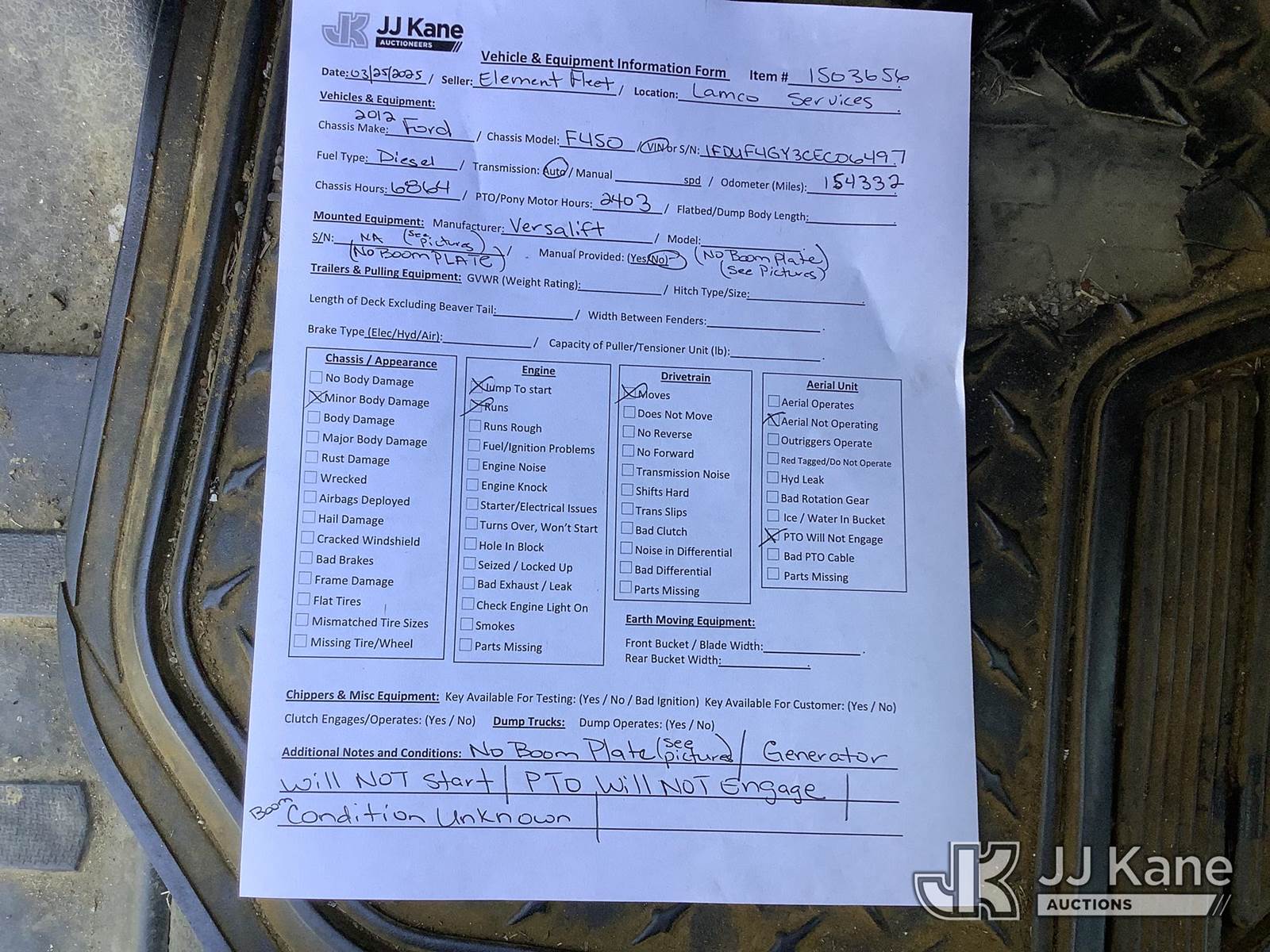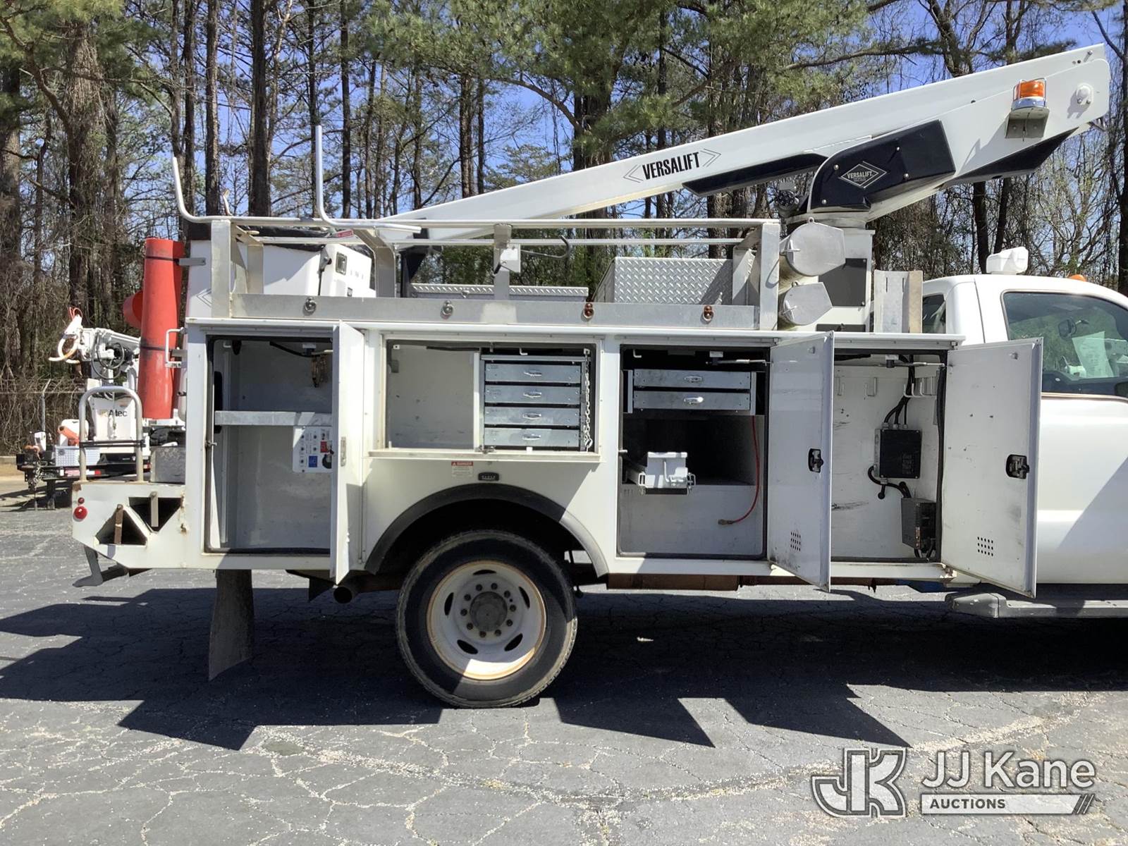 Versalift TEL29, 34 ft, Telescopic Non-Insulated Bucket Truck s/n AG120377, with Single Man Bucket, mounted behind cab on 2012 Ford F450 Service Truck, 10-cyl gas, RWD, Auto, A/C, with Onan Generator, (154,332 miles) (Runs, Moves, Generator Condition Unknown, Upper Condition Unknown, Jump to Start, Minor Body Damage, Upper Plate Torn) This is a Titled Item NOTE: This unit is being sold AS IS/WHERE IS via Timed Auction and is located in Graysville, AL. Inspection & preview days for this unit are by appointment only; please contact us at contact@jjkane.com or 84-Go-JJKane for more details. Alabama Auctioneer Michael Whitebread - License # 5592 (Missing manuals, See Auction Company for Manufacturers Information to obtain manuals) (Buyer is responsible for removal. Assistance by consignor or JJ Kane Auctions is not assured.)
