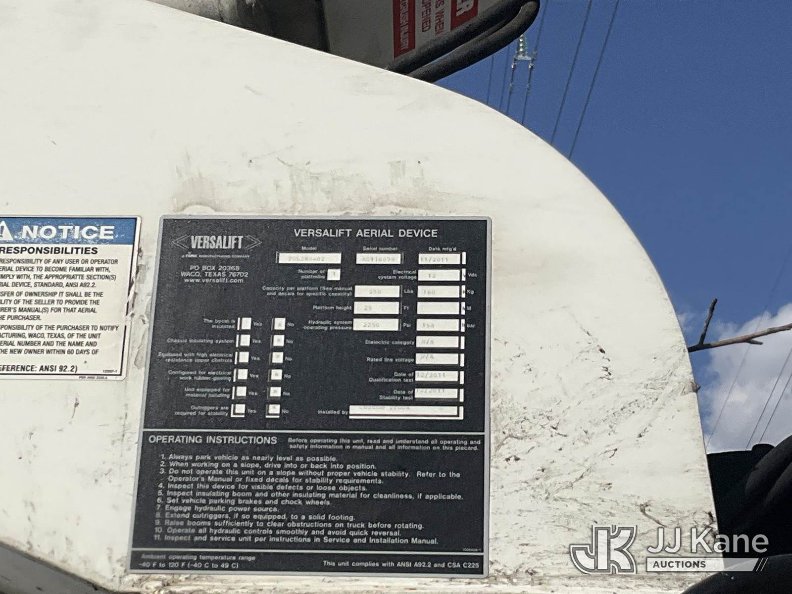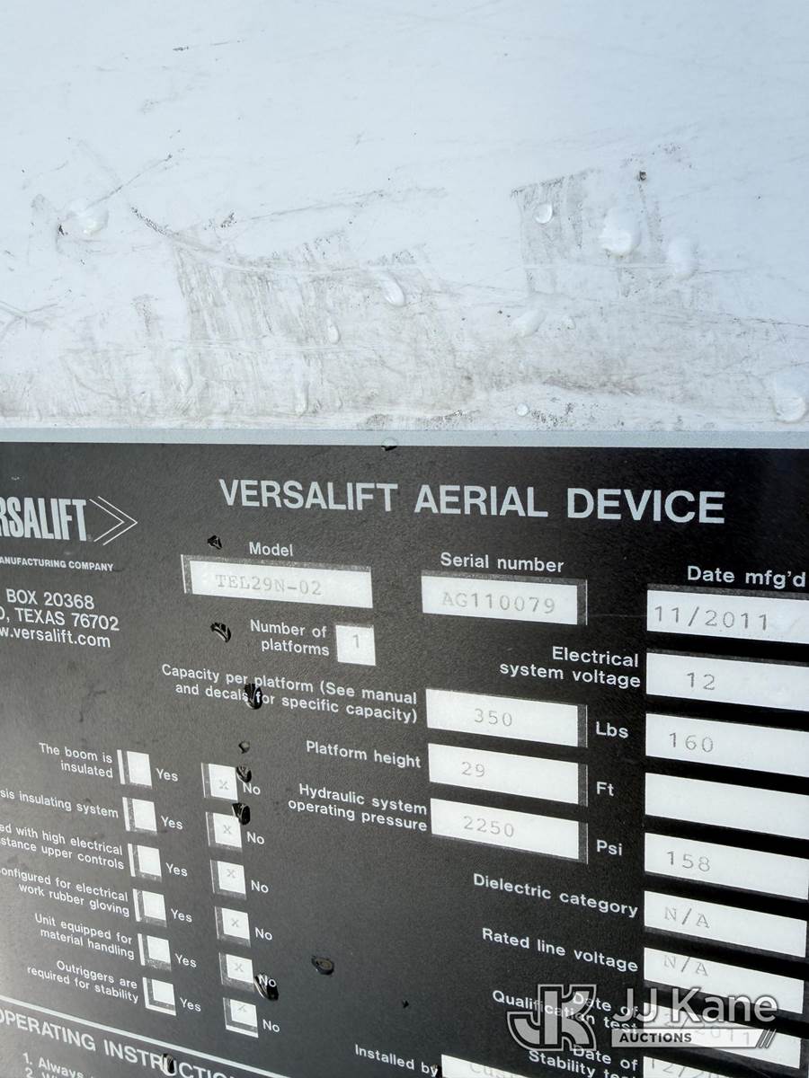 Versalift TEL29N-02, 34 ft, Telescopic Non-Insulated Bucket Truck s/n AG110079, with single-man bucket, mounted behind cab on 2012 Ford F350 Utility Truck, 8-cyl gas, Auto, A/C, (181,636 miles) (Runs, Moves & Upper Operates) (Jump To Start, Body Damage, Low Fuel) This is a Titled Item NOTE: This unit is being sold AS IS/WHERE IS via Timed Auction and is located in Chester, VA. Inspection & preview days for this unit are the 2 business days prior to the first day of items closing for this auction, item is located at 13301 Great Coastal Dr Chester, VA 23836 and hours of operations are 8a-3p. For pre-sale questions, please contact Doug Caton @ 804-807-4574. (Missing manuals, See Auction Company for Manufacturers Information to obtain manuals) (Buyer is responsible for removal. Assistance by consignor or JJ Kane Auctions is not assured.)