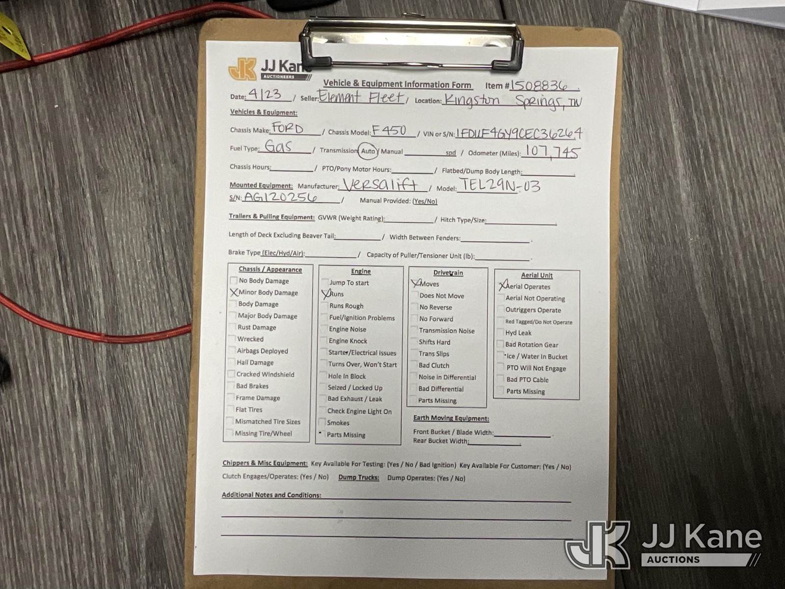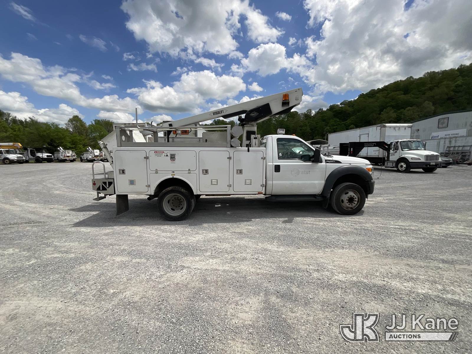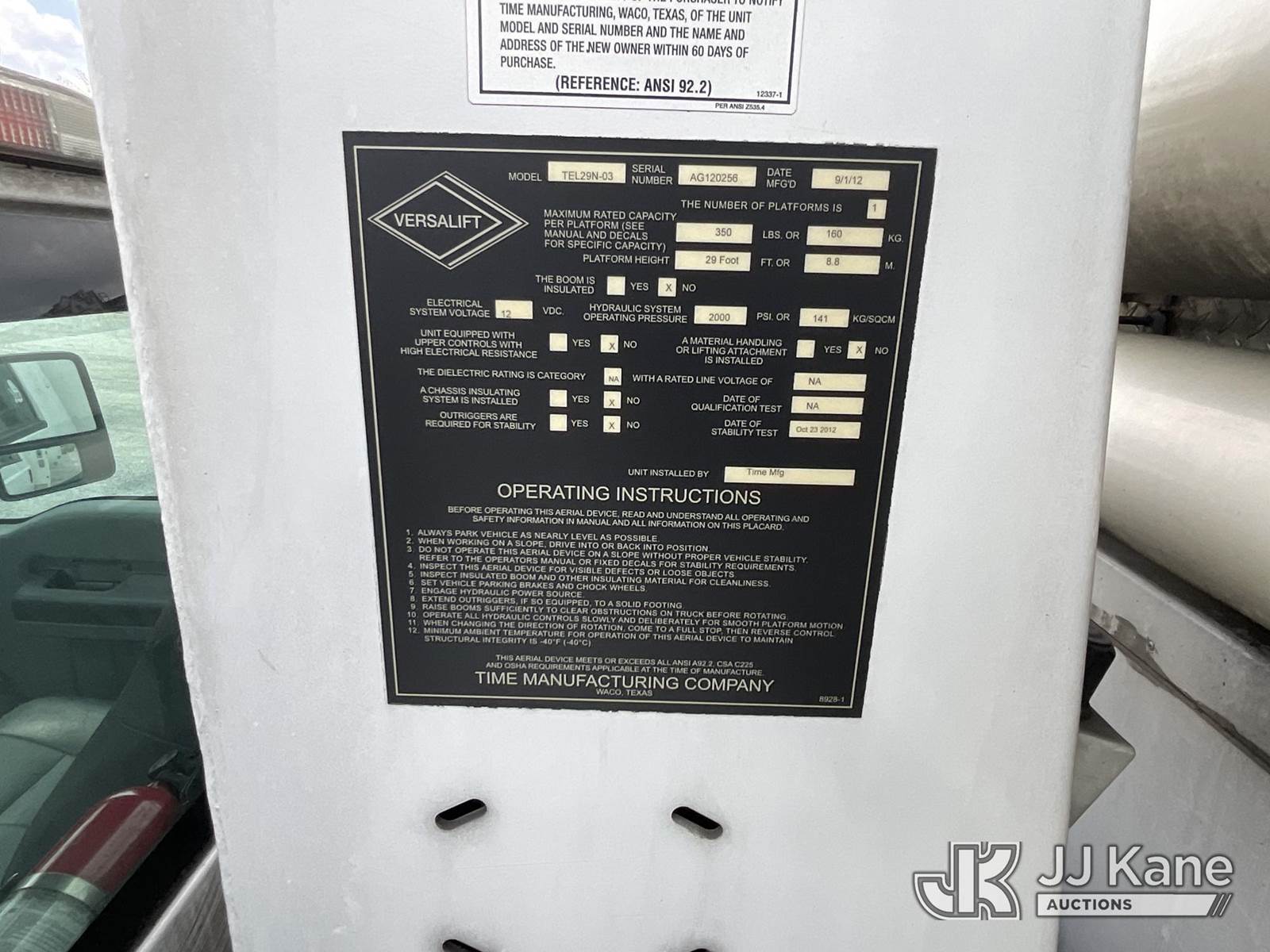 Versalift TEL29N-03, 34 ft, Telescopic Non-Insulated Bucket Truck s/n AG120256, with single-man bucket, mounted behind cab on 2012 Ford F450 Service Truck, 10-cyl gas, Auto, A/C, with Cummins/Onan generator, (107,745 miles) (Runs, Moves & Upper Operates) (Body Damage) This is a Titled Item NOTE: This unit is being sold AS IS/WHERE IS via Timed Auction and is located in Kingston Springs, TN. Inspection & preview days for this unit are by appointment only; please contact us at contact@jjkane.com or 84-Go-JJKane for more details. (Missing manuals, See Auction Company for Manufacturers Information to obtain manuals) (Buyer is responsible for removal. Assistance by consignor or JJ Kane Auctions is not assured.)