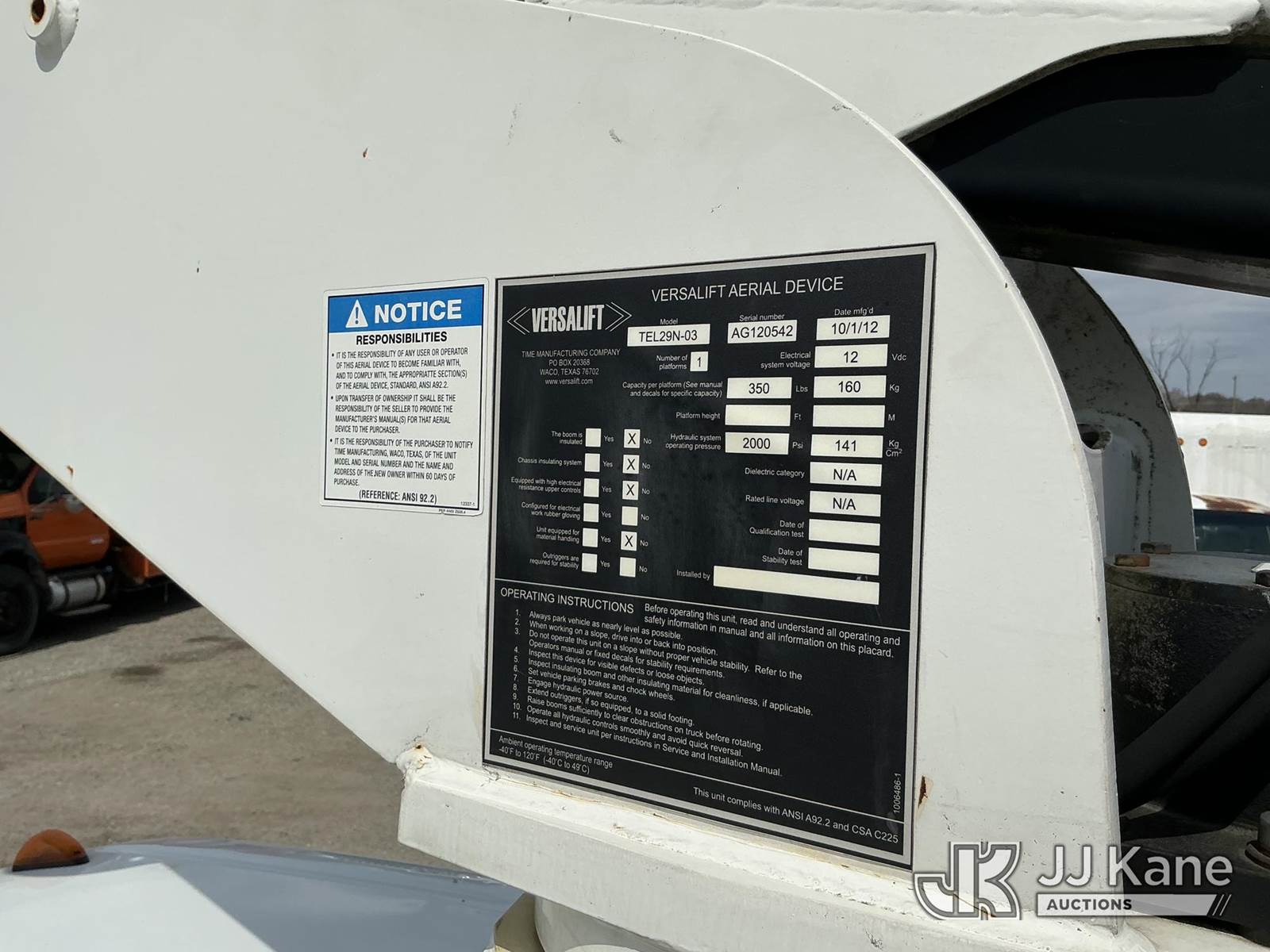 Versalift TEL29N03, 34 ft, Telescopic Non-Insulated Bucket Truck s/n AG120542, with Single-Man Bucket, mounted behind cab on 2012 Ford F450 Service Truck, 10-cyl gas, Auto, A/C, (132,012 miles) (Runs, Moves & Upper Operates, Jump To Start) This is a Titled Item NOTE: This unit is being sold AS IS/WHERE IS via Timed Auction and is located in Plymouth Meeting, PA. Inspection & preview days for this unit are the 2 business days prior to the first day of items closing for this auction, item is located at 1402 Conshohocken Rd Plymouth Meeting, PA 19462 and hours of operations are 8a-4p. For pre-sale questions, please contact Bruce Thomas @ (267) 887-0392 or bruce.thomas.jr@jjkane.com. (Missing manuals, See Auction Company for Manufacturers Information to obtain manuals) (Buyer is responsible for removal. Assistance by consignor or JJ Kane Auctions is not assured.)