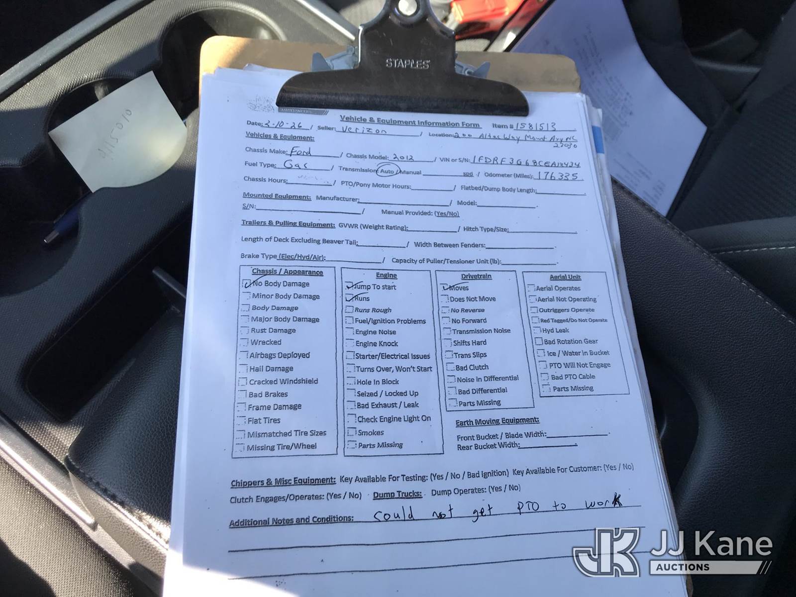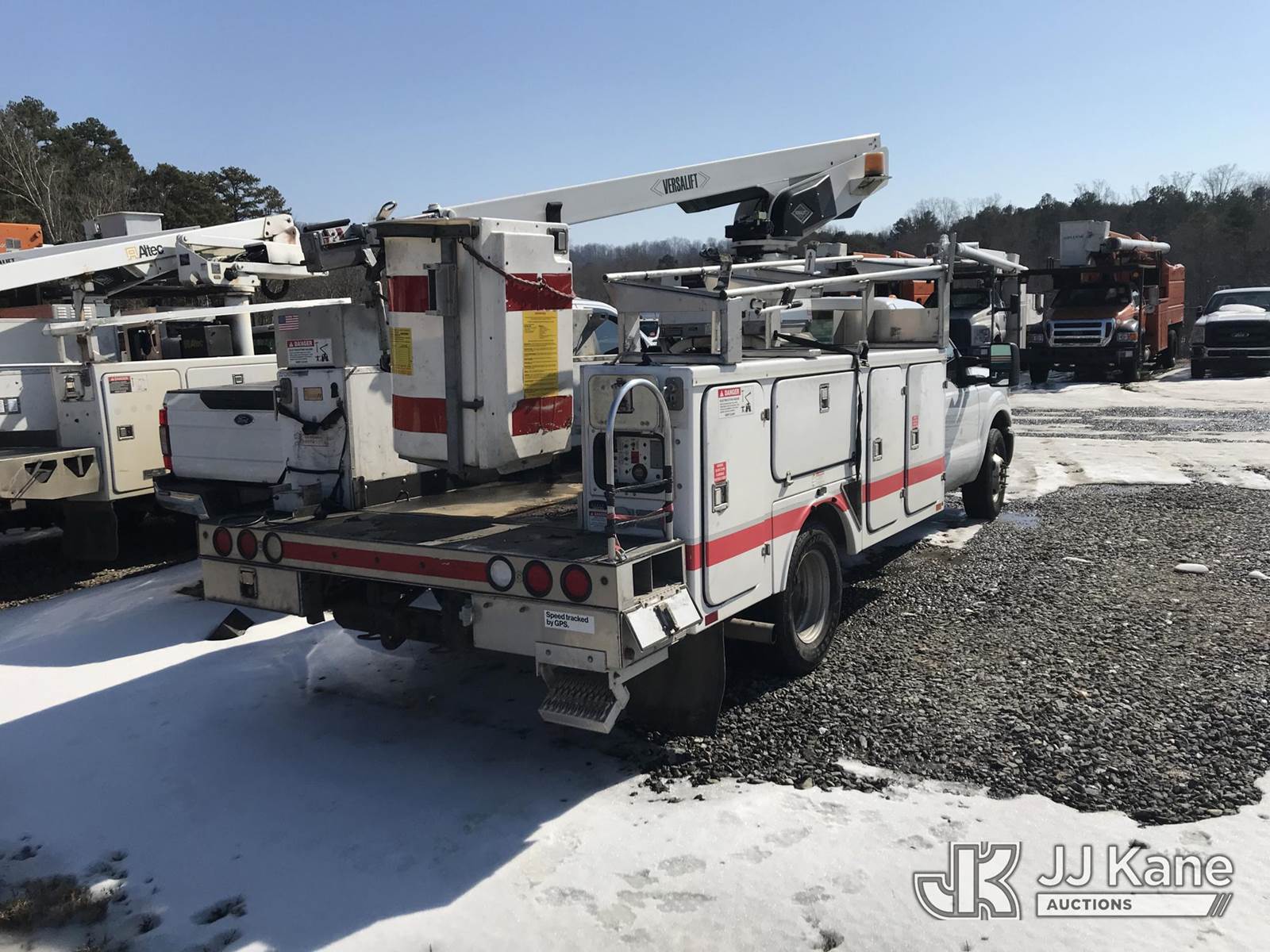 Versalift TEL29NE03, 34 ft, Telescopic Non-Insulated Bucket Truck s/n AG110072, with single-man bucket, mounted behind cab on 2012 Ford F350 Service Truck, 8-cyl gas, Auto, A/C, (176,335 miles) (Runs & Moves) (PTO Does Not Engage, Upper Condition Unknown, Jump To Start) This is a Titled Item NOTE: This unit is being sold AS IS/WHERE IS via Timed Auction and is located in Mount Airy, NC. Inspection & preview days for this unit are by appointment only; please contact us at contact@jjkane.com or 84-Go-JJKane for more details. (Missing manuals, See Auction Company for Manufacturers Information to obtain manuals) (Buyer is responsible for removal. Assistance by consignor or JJ Kane Auctions is not assured.)