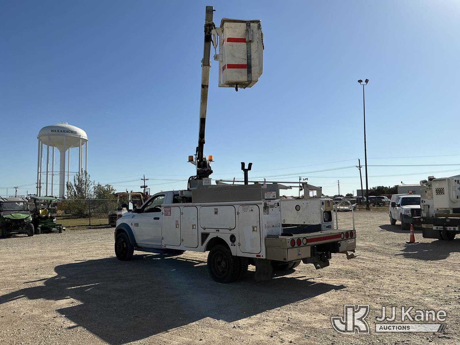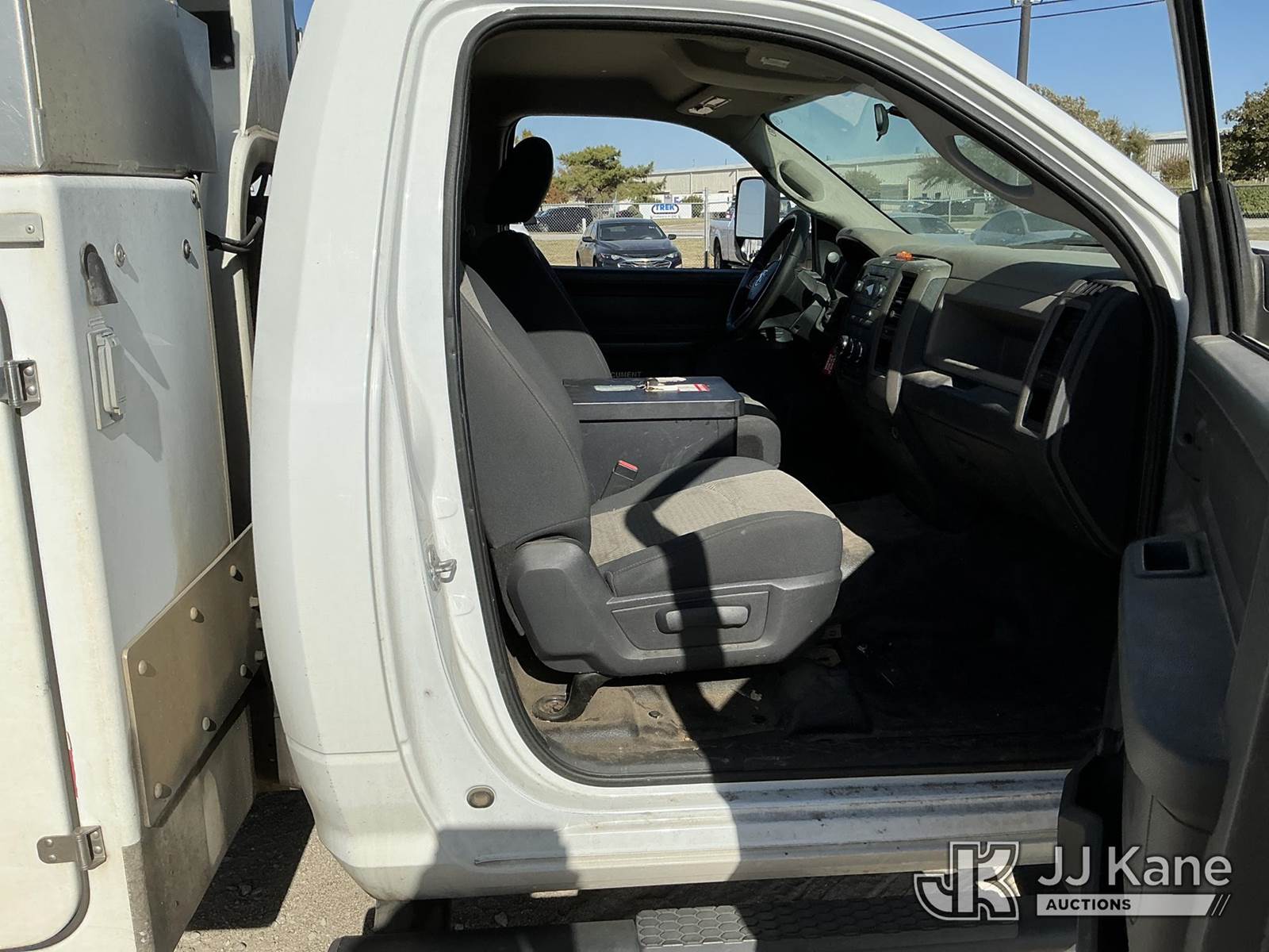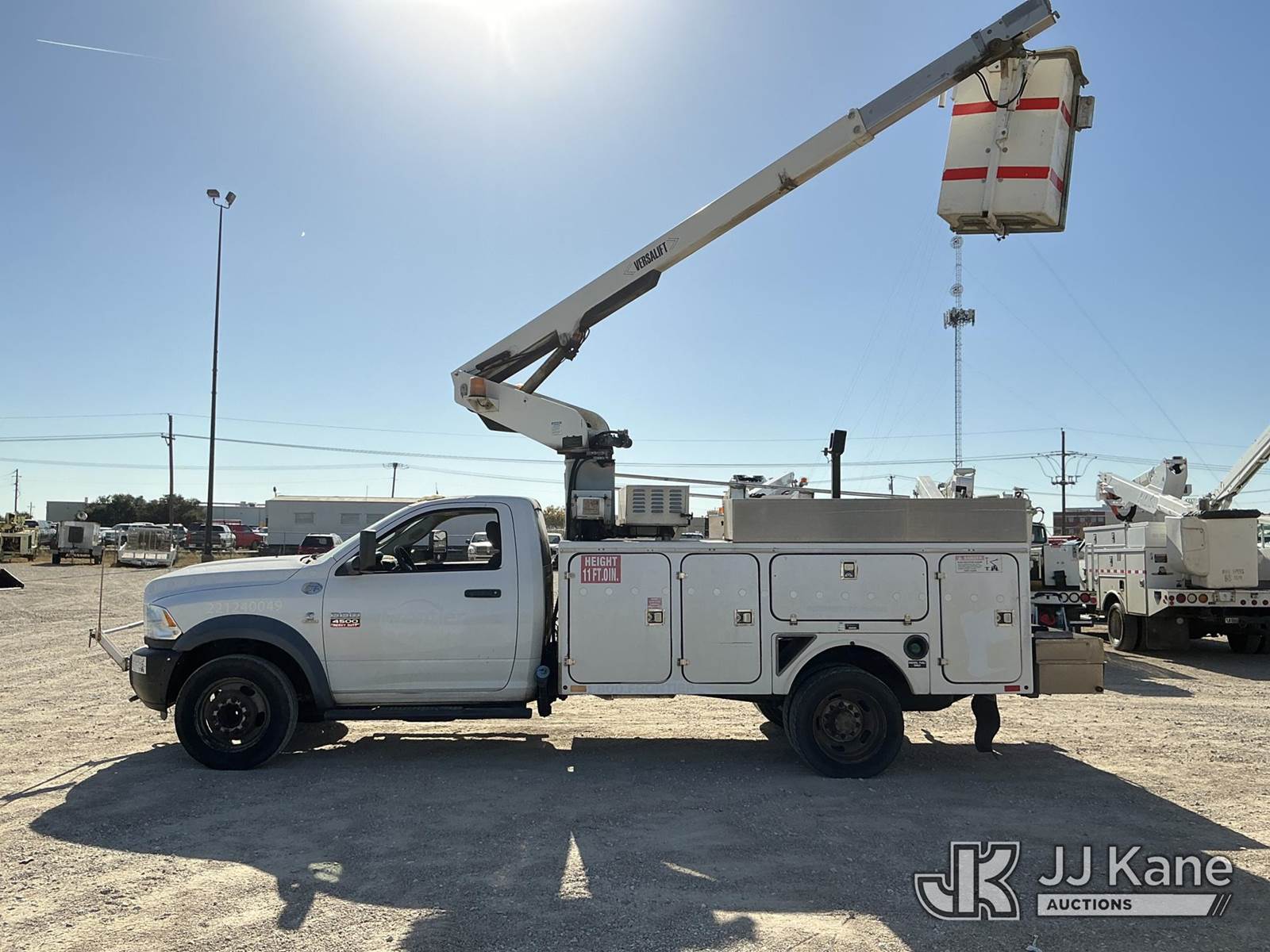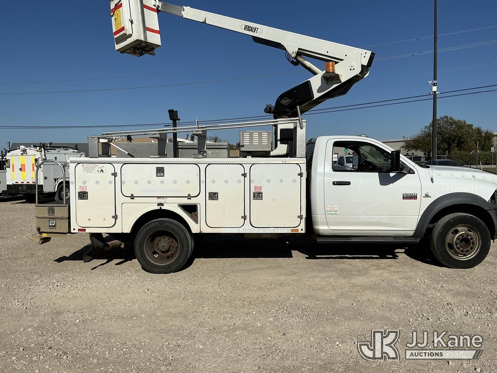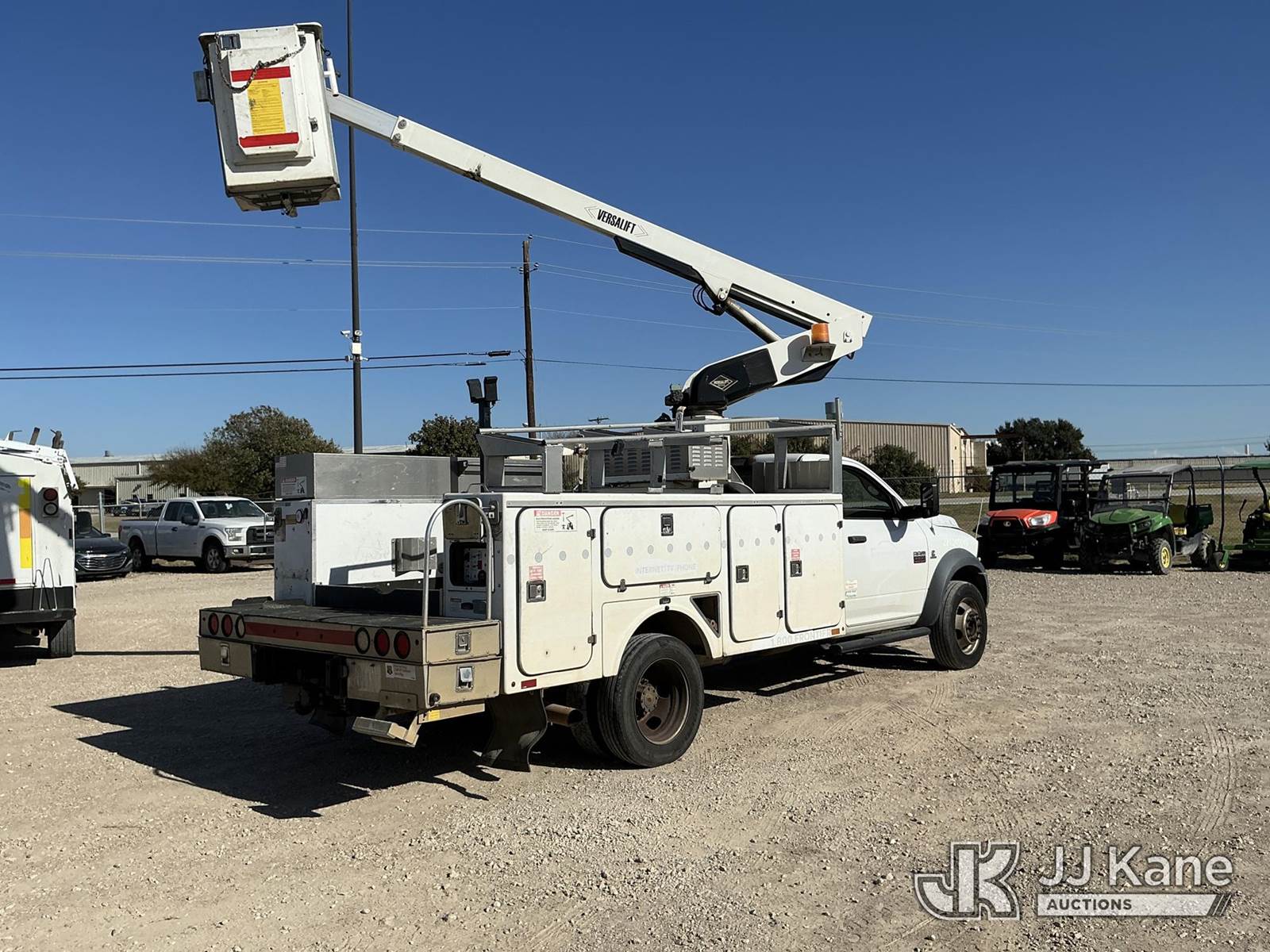 Versalift unknown, Telescopic Non-Insulated Bucket Truck s/n AG120114, with single man bucket, mounted behind cab on 2012 Dodge Ram 4500 Service Truck, 6.7L Auto, diesel, A/C, (178,683 miles) (Runs, Moves & Upper Operates) (Jump To Start, Check Engine Light On, Front Passenger Headlight & Front Radiator Cover Missing, Versalift Manufacturer Data Plate Missing) This is a Titled Item NOTE: This unit is being sold AS IS/WHERE IS via Timed Auction and is located in Waxahachie, TX. For pre-sale questions or to schedule an inspection, please call auction yard at (469) 550-4938. (Missing manuals, See Auction Company for Manufacturers Information to obtain manuals) (Buyer is responsible for removal. Assistance by consignor or JJ Kane Auctioneers is not assured.)