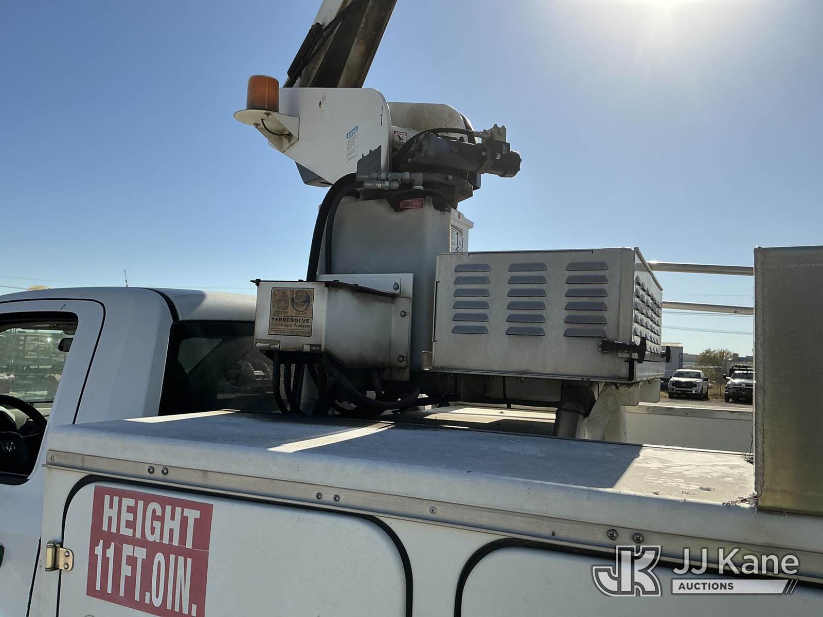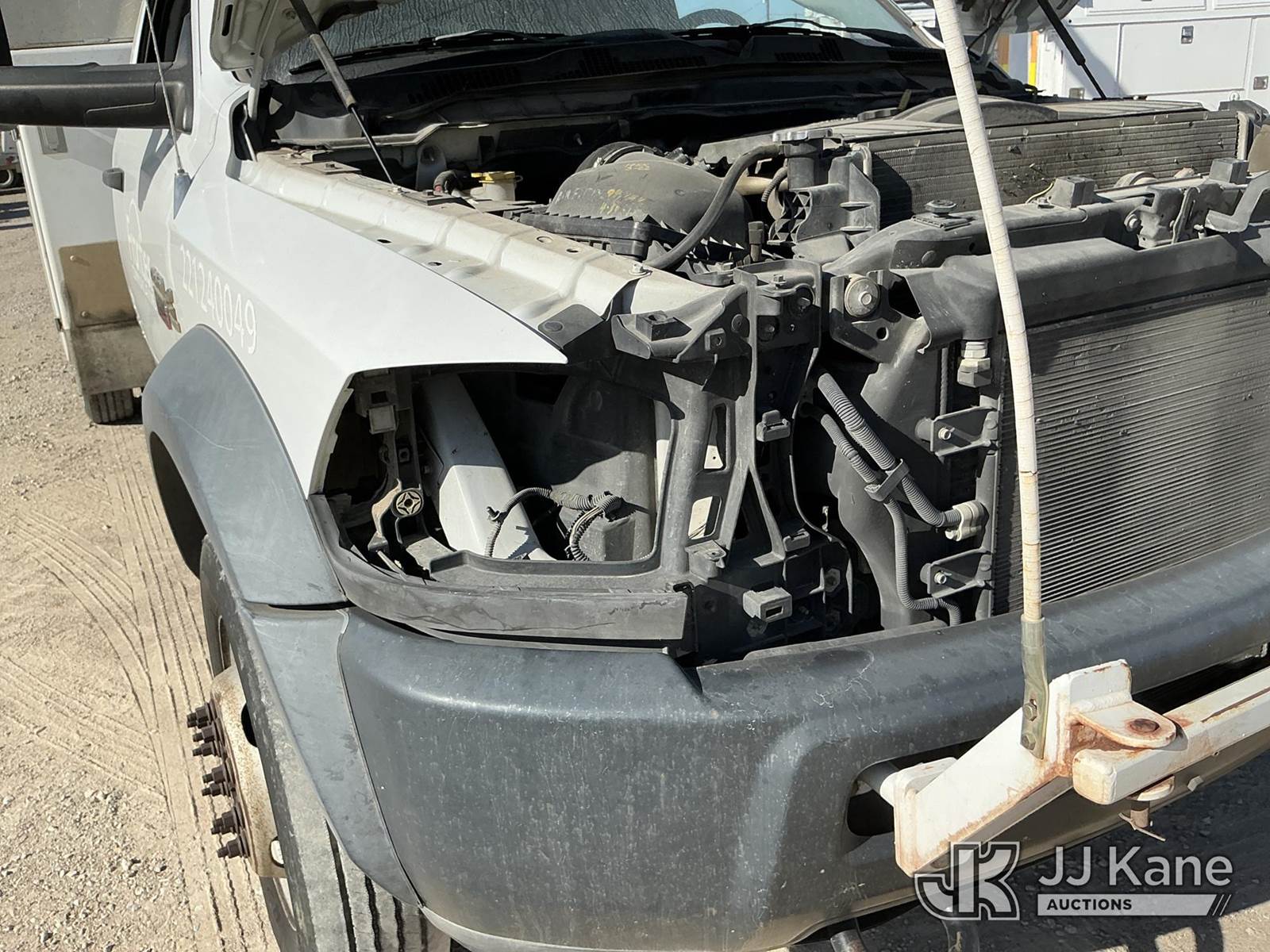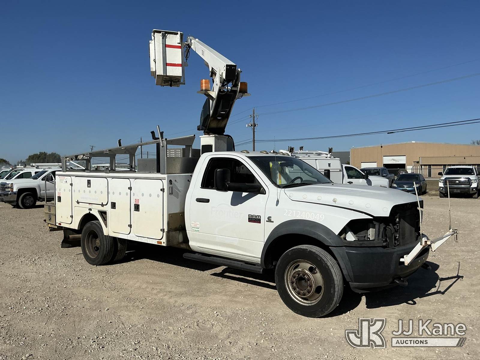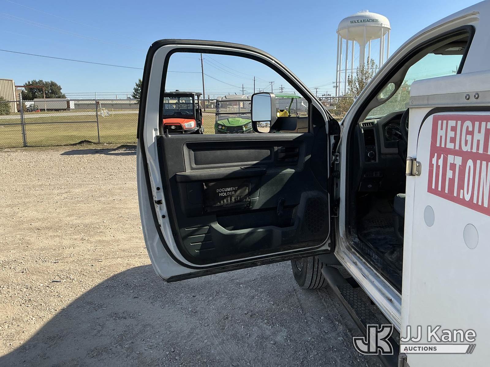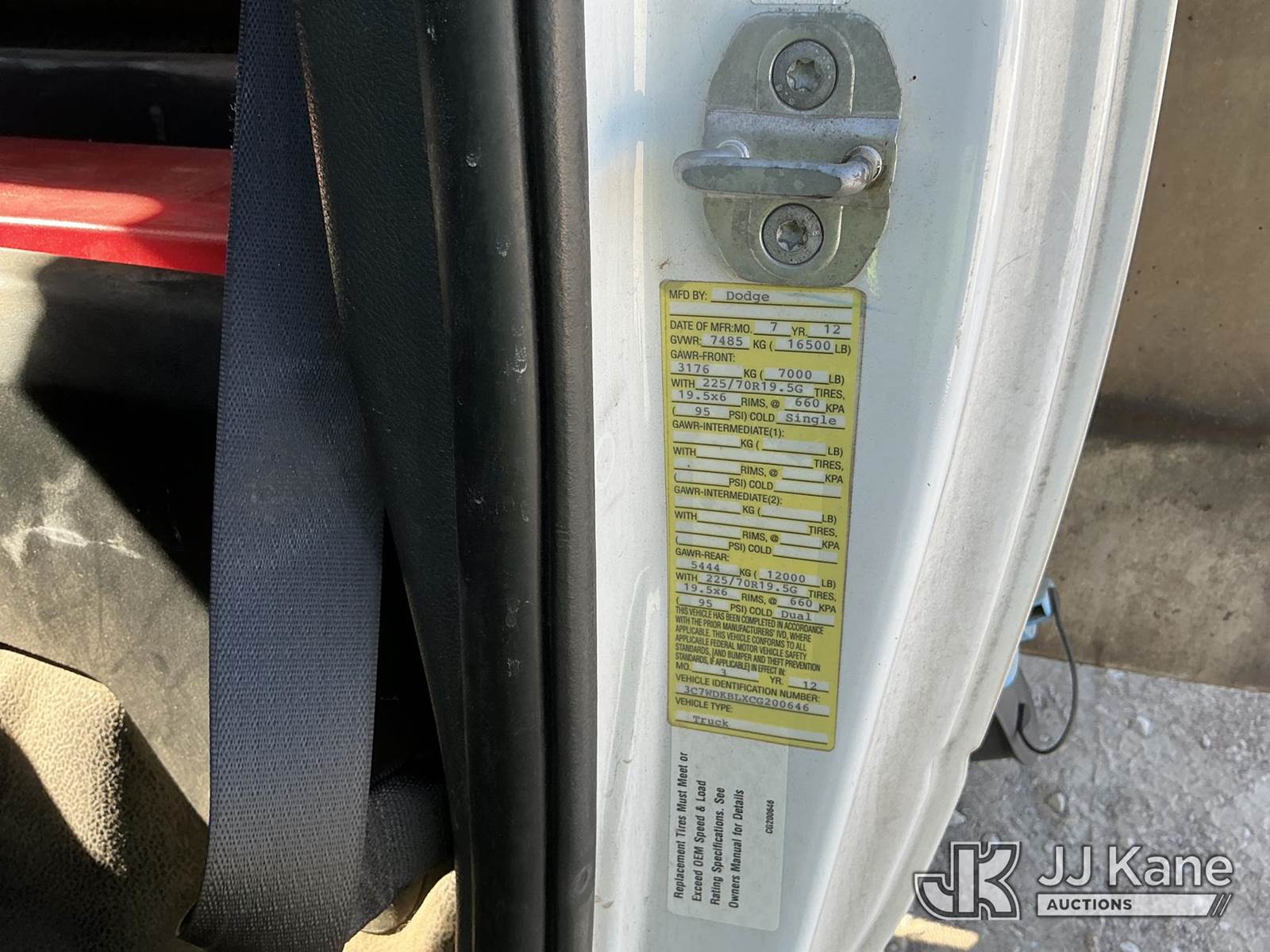 Versalift unknown, Telescopic Non-Insulated Bucket Truck s/n AG120114, with single man bucket, mounted behind cab on 2012 Dodge Ram 4500 Service Truck, 6.7L Auto, diesel, A/C, (178,683 miles) (Runs, Moves & Upper Operates) (Jump To Start, Check Engine Light On, Front Passenger Headlight & Front Radiator Cover Missing, Versalift Manufacturer Data Plate Missing) This is a Titled Item NOTE: This unit is being sold AS IS/WHERE IS via Timed Auction and is located in Waxahachie, TX. For pre-sale questions or to schedule an inspection, please call auction yard at (469) 550-4938. (Missing manuals, See Auction Company for Manufacturers Information to obtain manuals) (Buyer is responsible for removal. Assistance by consignor or JJ Kane Auctioneers is not assured.)