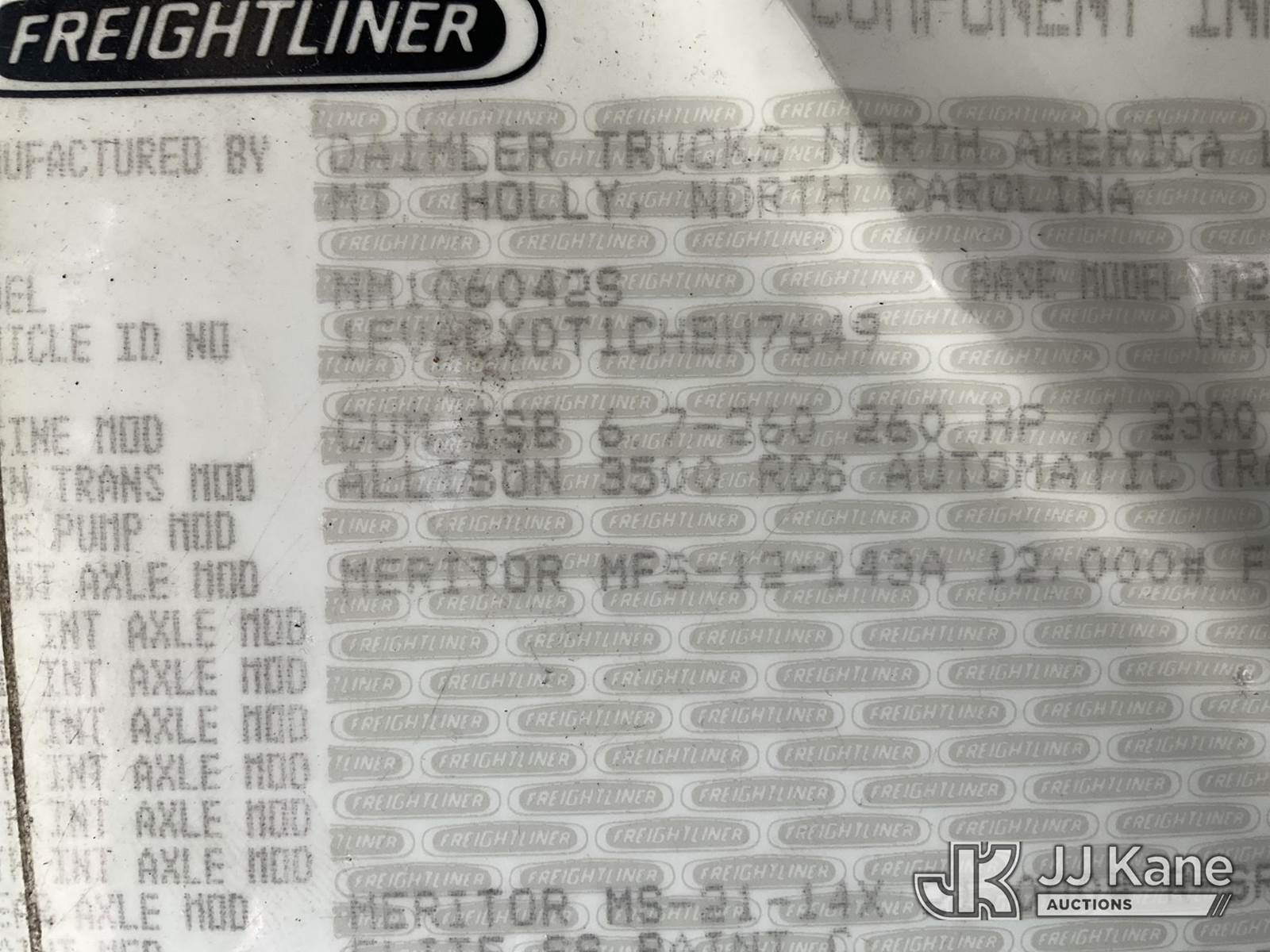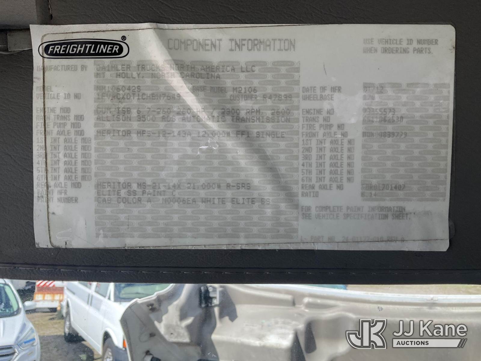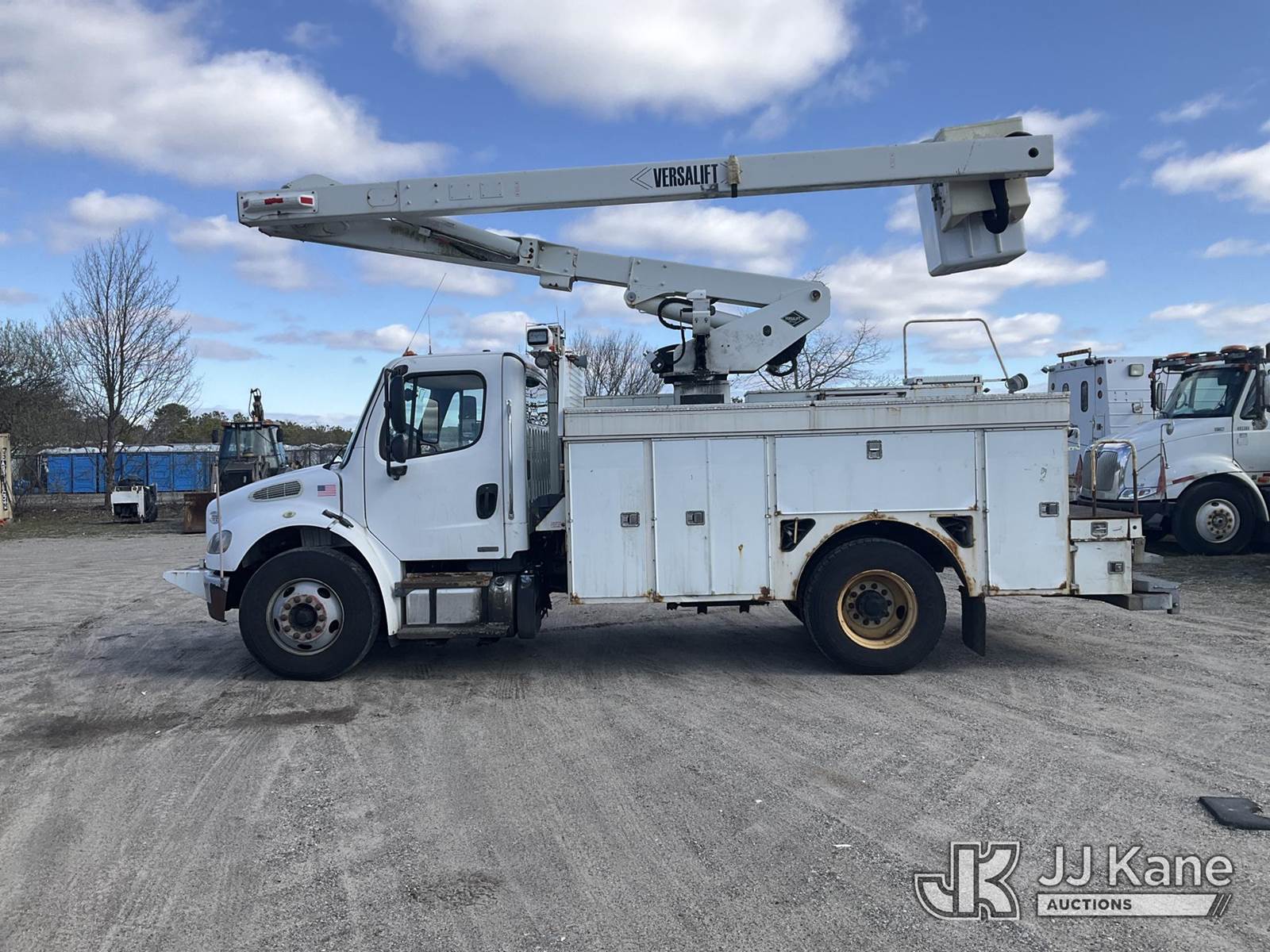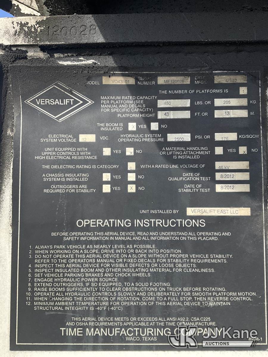 Versalift V043I-01, 48 ft, Over-Center Bucket Truck s/n MF120028, with Single Man Bucket, center mounted on 2012 Freightliner M2 106 Utility Truck, 6.7L diesel, Auto, A/C, (117,309 miles) (Runs, Moves & Upper Operates, Jump To Start, Check Engine Light On, DEF Light On) (Removal is by Appointment Only, Buyer MUST make a appointment prior to picking up, Buyer/Transporter Must have PAID IN FULL RELEASE. No onsite assistance available, Please Come prepared.) This is a Titled Item NOTE: This unit is being sold AS IS/WHERE IS via Timed Auction and is located in Bellport, NY. (Missing manuals, See Auction Company for Manufacturers Information to obtain manuals) (Buyer is responsible for removal. Assistance by consignor or JJ Kane Auctions is not assured.)