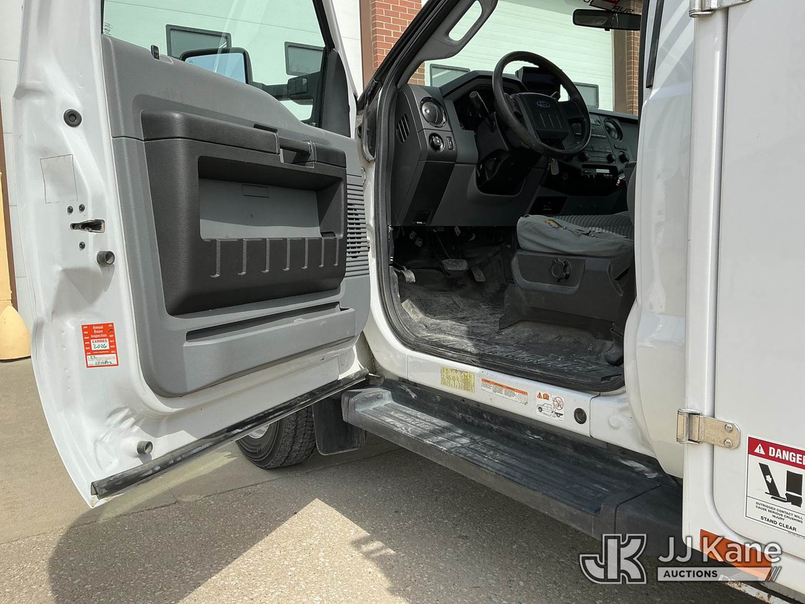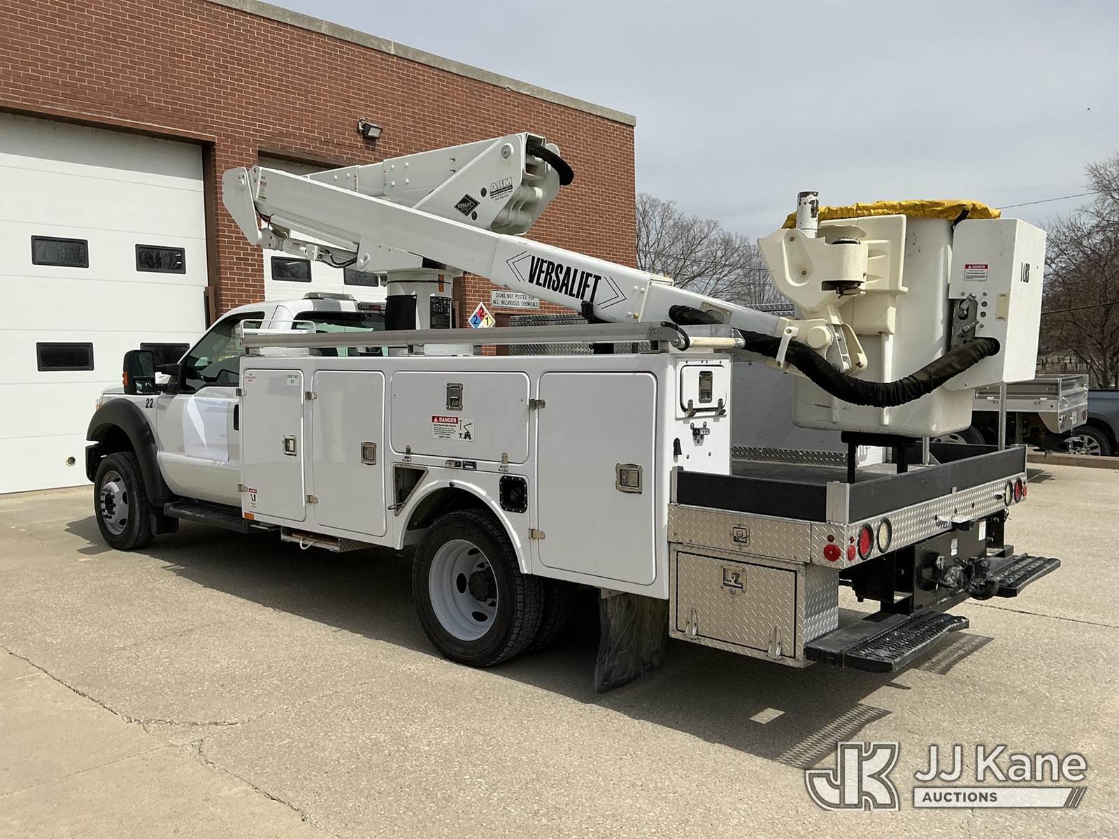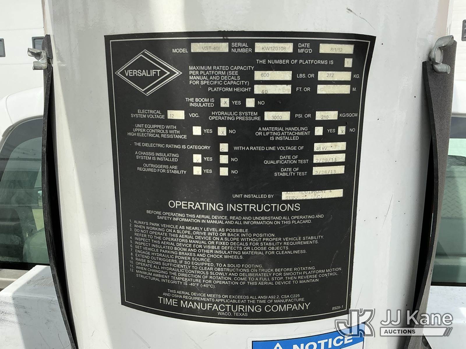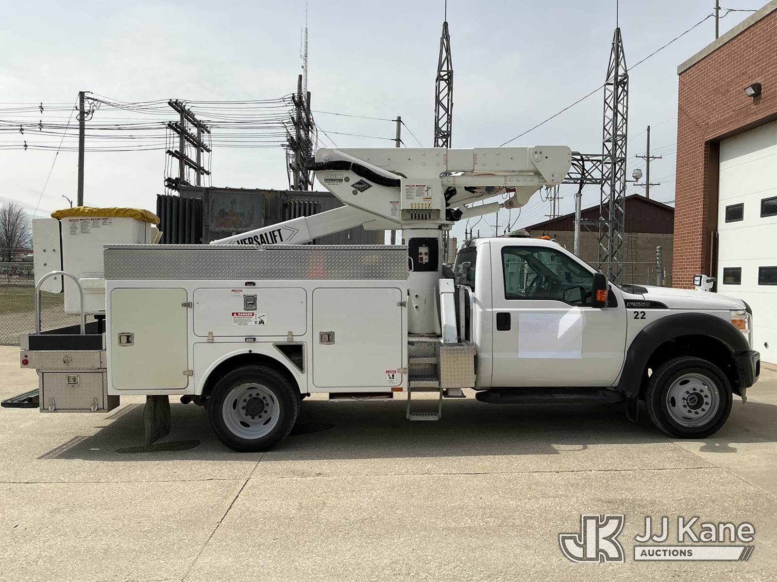 Versalift VST-40I, 45 ft, Articulating & Telescopic Bucket Truck s/n KW120108, with Single-Man Bucket, mounted behind cab on 2012 Ford F-550 Service Truck, 10-cyl gas, 4WD, Auto, A/C, (31,196 miles) Municipal Owned & Maintained, Garage Kept (Runs, Moves & Upper Operates) (Reads 8,290 hours) This is a Titled Item NOTE: This unit is being sold AS IS/WHERE IS via Timed Auction and is located in Vinton, IA. For more information and removal arrangements please contact Austin Scott @ 816-205-2291. Load out by appointment only, Buyer/Hauler must present copy of paid invoice upon arrival. Purchaser acknowledges ALL lots must be removed within 5 business days of Auction. Items not removed in a timely matter will be transported by a third party to a storage facility. Buyer will be responsible for transport and storage fees. For load out and pick information, please reference the hauler sheet sent out after purchase. (Manuals provided in cab) (Buyer is responsible for removal. Assistance by consignor or JJ Kane Auctions is not assured.)