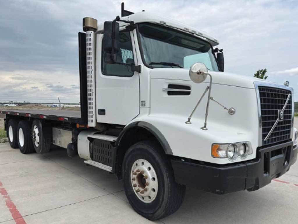 2012 VOLVO VHD Tri-Axle Conventional Straight Truck, Volvo D13 Engine, 375 H.P., RTO-14908LL Transmission, (Manual), Air Lift Pusher Axle, 3.73 Ratio, Hydraulic Power Steering, Air Conditioned, 90 Gallon Fuel Tank, Dual Chrome Stacks, Exterior Visor, Tilt And Telescoping Steering Wheel, Cruise Control, Power Windows, 26 Ft. Flatbed Body, 22.5 Low Profile Tires, Aluminum Disc Wheels.