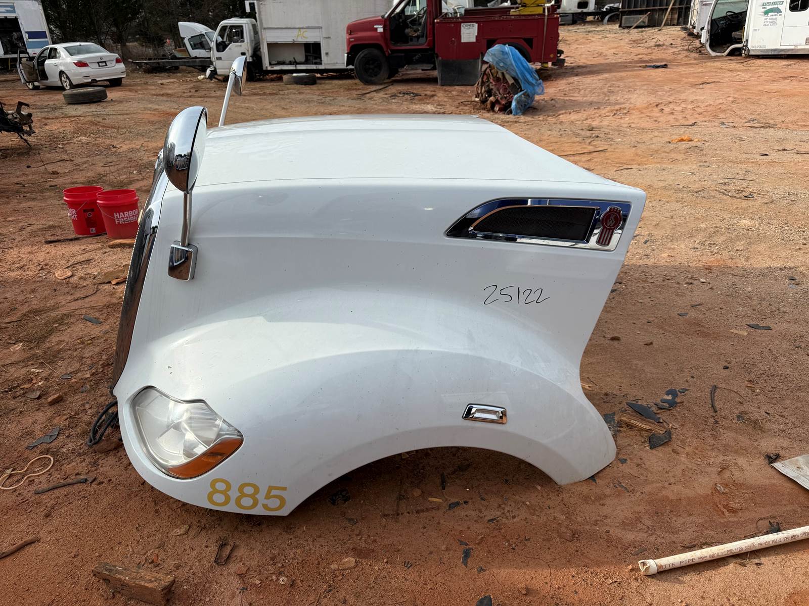 This is a used white complete hood for a 2013-2022 Kenworth T680. The headlights, grille, and hood mirrors are included. This hood is in great condition. Please look at all the pictures on the inside near the grille does have slight damage but nothing major. this item can be shipped if needed at buyers expense please contact me for a shipping quote or if you have any other questions.