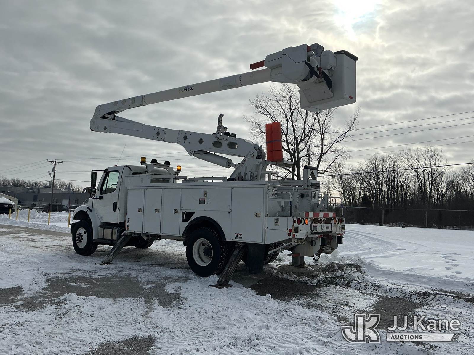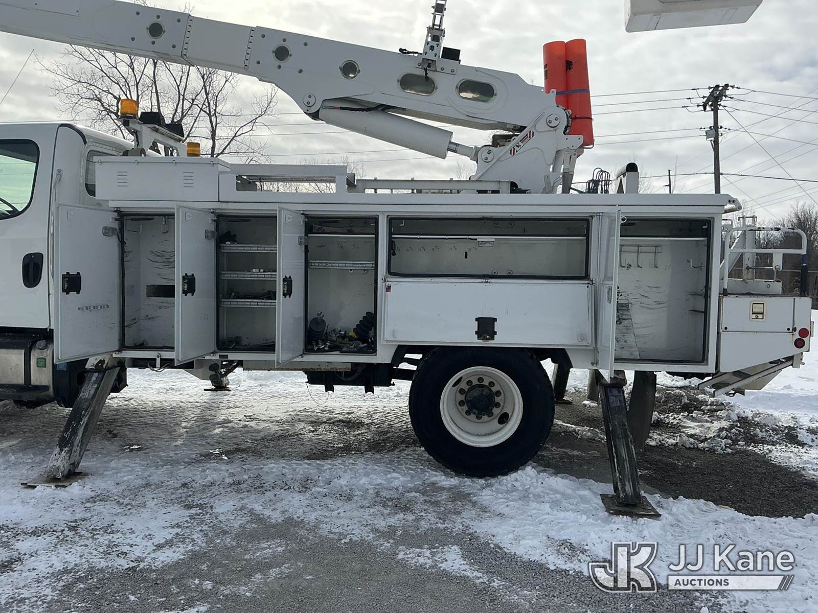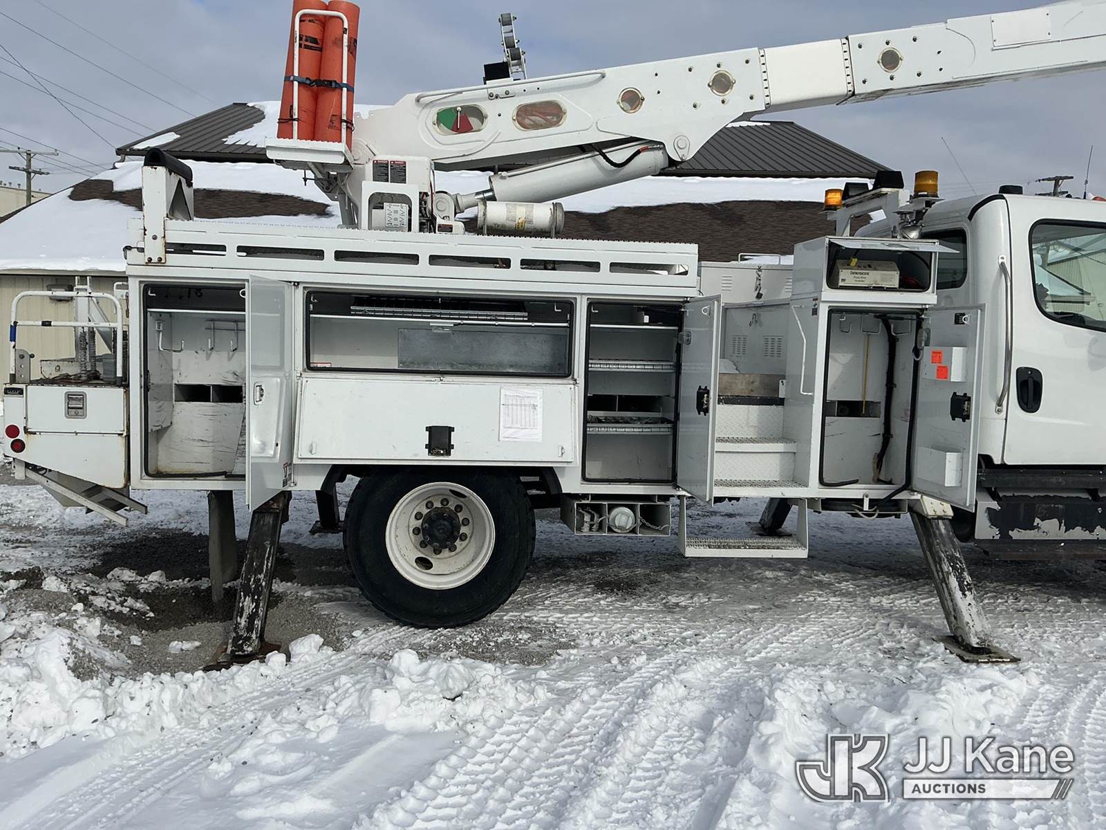 Altec AA55-MH, 60 ft, Material Handling Bucket Truck s/n 0513FH0497, with two-man bucket & 4 hyd outriggers, rear mounted on 2013 Freightliner M2 106 Utility Truck, 6.7L L6 diesel, 4X2, Auto, A/C, with inverter, (35,098 miles) (Runs, Moves & Upper Operates) (Reads 4,518 hours) This is a Titled Item NOTE: This unit is being sold AS IS/WHERE IS via Timed Auction and is located in Fort Wayne, IN. For more information & removal arrangements please contact Office Staff @ (260) 450-9822. Load out by appointment only, Buyer/Hauler must present copy of paid invoice upon arrival. Purchaser acknowledges ALL lots must be removed within (10) business days of Auction, or a storage fee may be incurred. For load out and pick up information, please reference the hauler sheet sent out after purchase. (Manuals provided in cab) (Buyer is responsible for removal. Assistance by consignor or JJ Kane Auctions is not assured.)