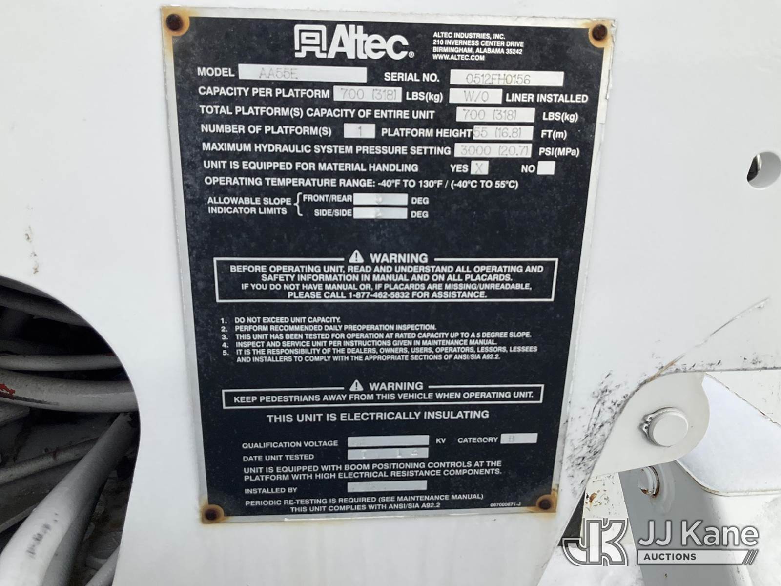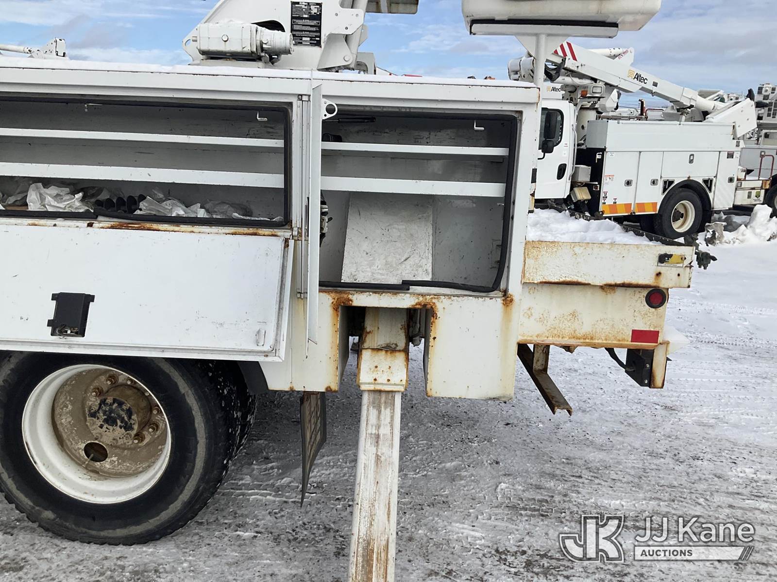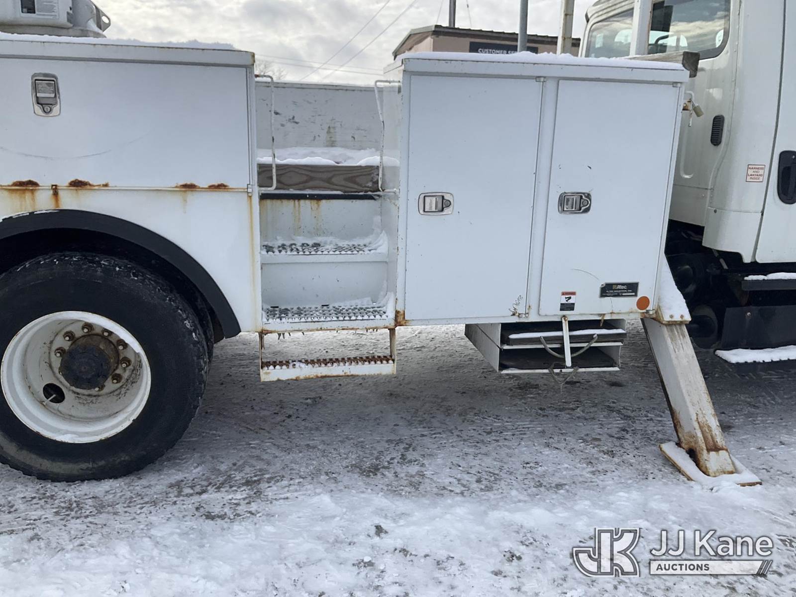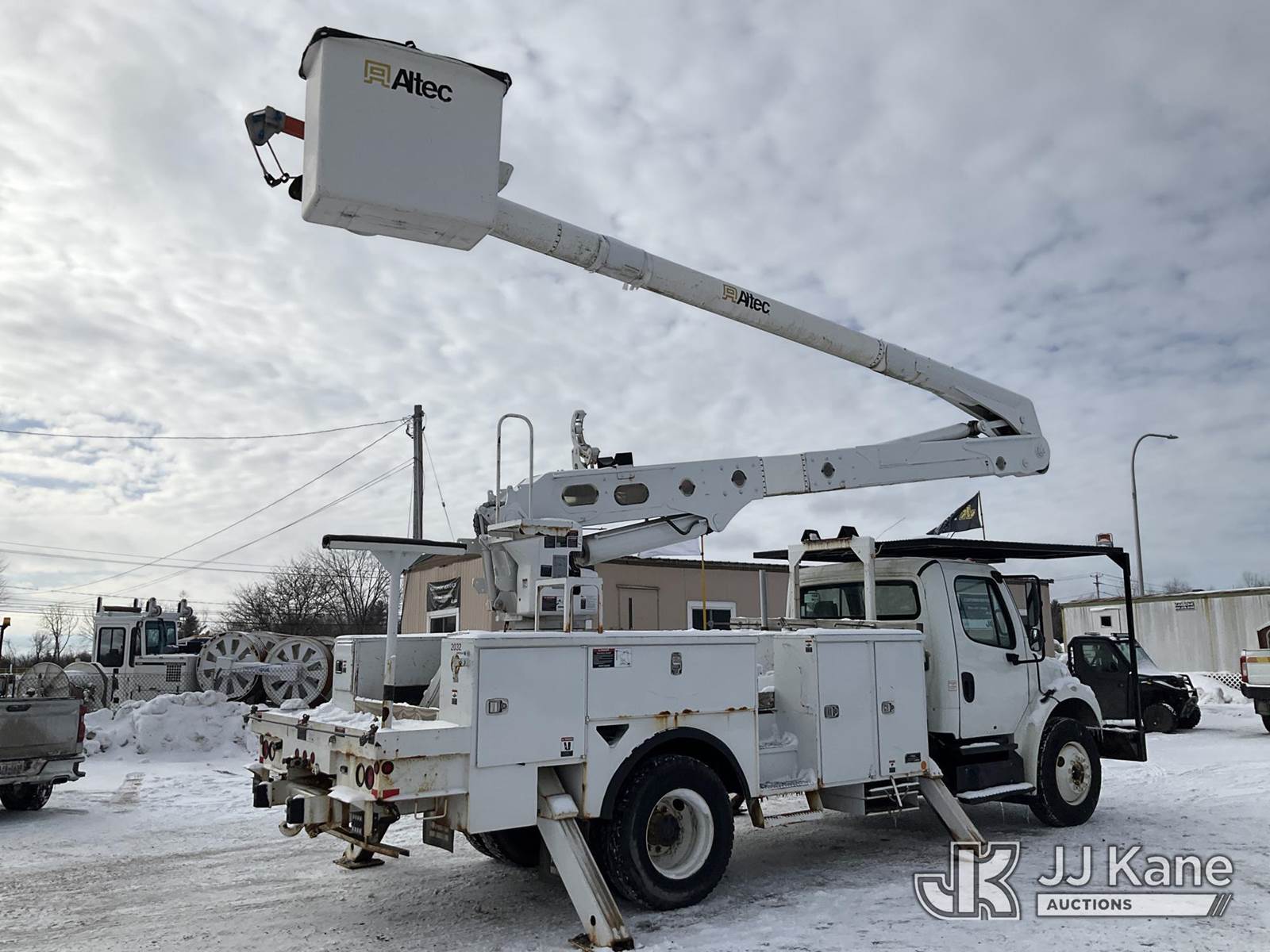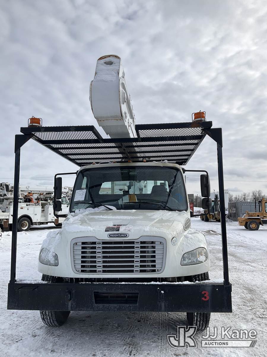 Altec AA55E-MH, 60 ft, Material Handling Bucket Truck s/n 0512FH0156, with Two-Man Bucket & 4 Outriggers, rear mounted on 2013 Freightliner M2 106 Utility Truck, 6.7L Auto, diesel, A/C, (78,175 miles) (Runs, Moves & Upper Operates, Body & Rust Damage, Low Fuel, Cracked Windshield ) (Reads 8,274 hours) This is a Titled Item NOTE: This unit is being sold AS IS/WHERE IS via Timed Auction and is located in Rome, NY. Inspection & preview days for this unit are the 2 business days prior to the first day of items closing for this auction, item is located at 5835 Success Dr Rome, NY 13440 and hours of operations are 8a-4p. For pre-sale questions, please contact Ryan Jackson @ (315) 749-3790 or Ryan.Jackson@jjkane.com. (Manuals provided in cab) (Buyer is responsible for removal. Assistance by consignor or JJ Kane Auctions is not assured.)