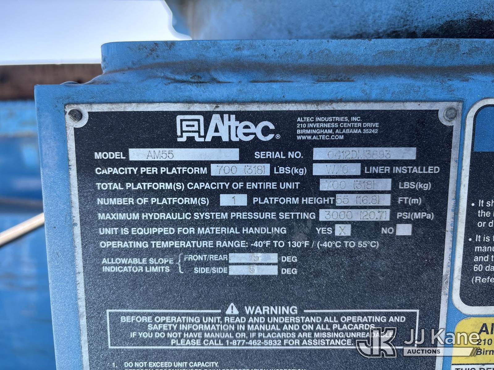 Altec AM55, 60 ft, Over-Center Material Handling Bucket Truck s/n 0412DM3893, with Two-Man Bucket, 4 Hydraulic Outriggers, rear mounted on 2013 International 7500 T/A Utility Truck, 9.3L L6 DIESEL 6X6, Auto, A/C, (60,458 miles) Honda Generator Cranks, Does Not Start (Runs, Moves & Operates) (Check Engine Light On) (Reads 5,068 hours) (Bidding Restricted to Licensed Vehicle Dealers Only), May be subject to ARB Regulations This is a Titled Item NOTE: This unit is being sold AS IS/WHERE IS via Timed Auction and is located in Dixon, CA. Inspection & preview days for this unit are the 2 business days prior to the first day of items closing for this auction, item is located at 8668 Sparling Ln Dixon, CA 95620 and hours of operations are 8a-4p. For pre-sale questions, please contact JJ Kane Staff at (707) 678-8060 (dixon@jjkane.com). Dealer License Number 45696. (Missing manuals, See Auction Company for Manufacturers Information to obtain manuals) (Buyer is responsible for removal. Assistance by consignor or JJ Kane Auctions is not assured.)