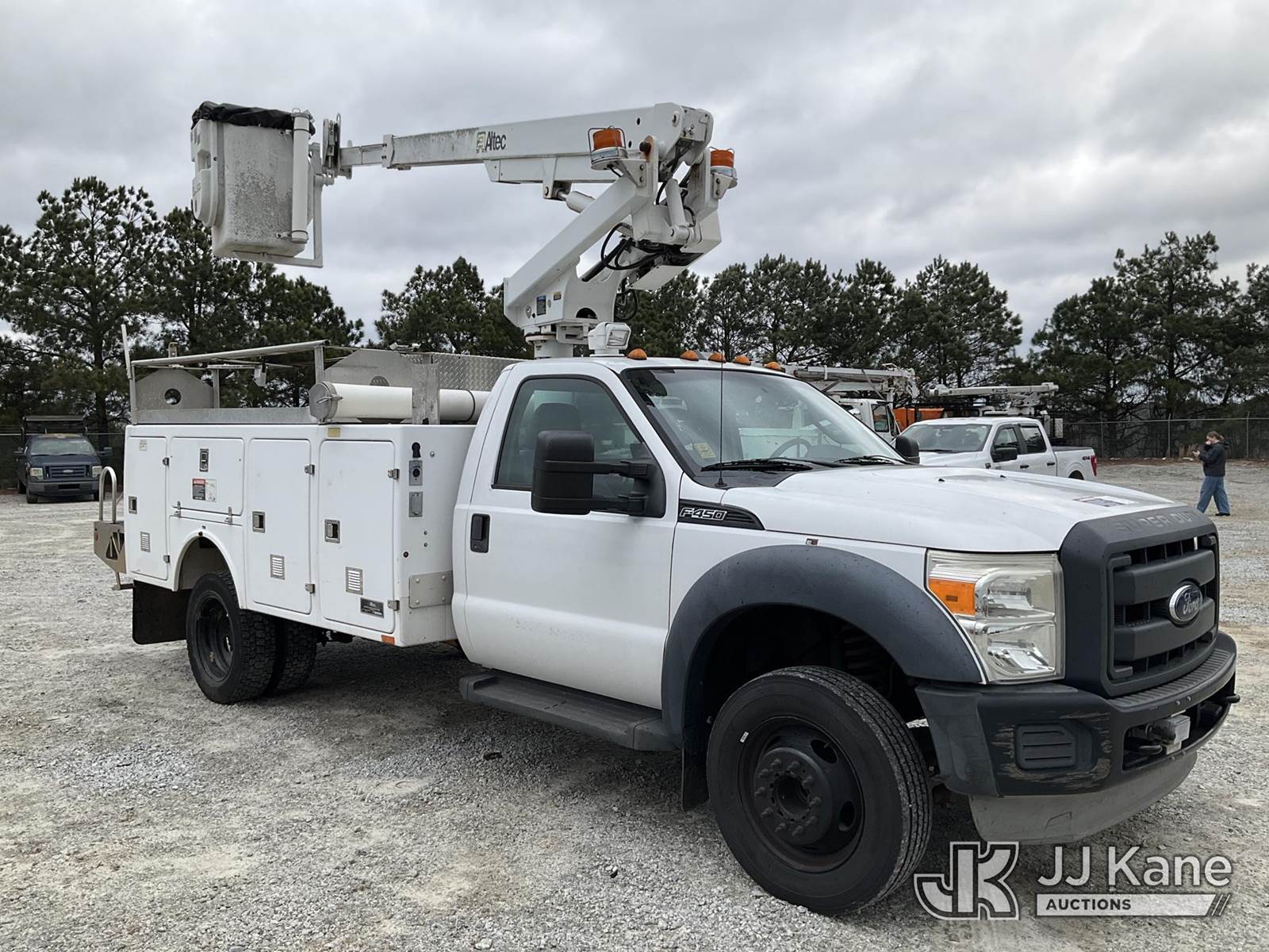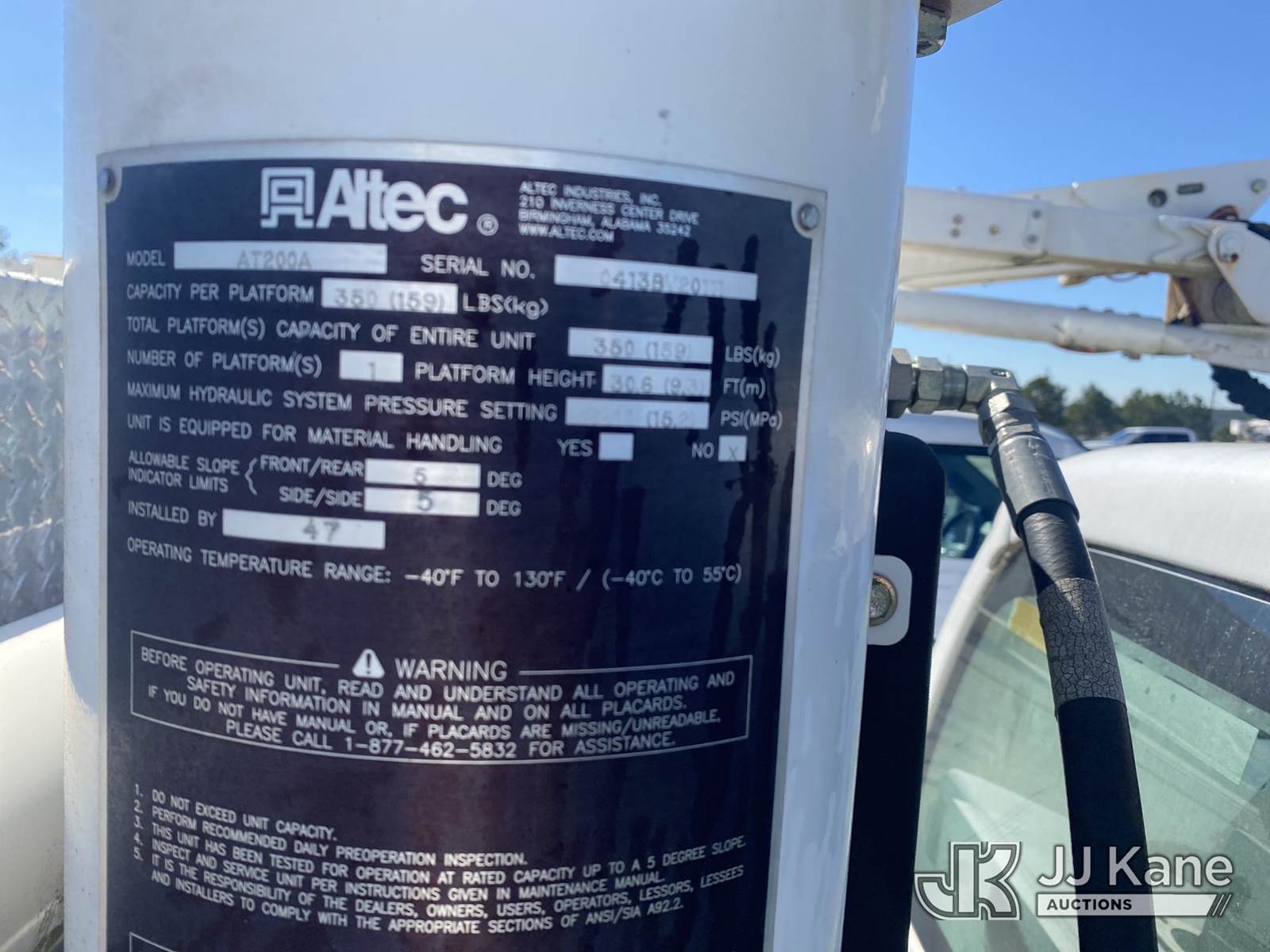 Altec AT200-A, 35 ft, Telescopic Non-Insulated Bucket Truck s/n 0413BV20111, diesel, with single-man bucket, mounted behind cab on 2013 Ford F-450 SD Service Truck, 10-cyl gas, RWD, Gas, Auto, A/C, with Onan generator , (126,275 miles) (Runs, Moves, & Upper Operates) (Paint Damage) This is a Titled Item NOTE: This unit is being sold AS IS/WHERE IS via Timed Auction and is located in Villa Rica, GA. Inspection & preview days for this unit are the 2 business days prior to the first day of items closing for this auction, item is located at 100 Liberty Rd Villa Rica, GA 30180 and hours of operations are 8a-4p. For pre-sale questions, please contact Office Staff @ (470) 590-8453. (Manuals provided in cab) (Buyer is responsible for removal. Assistance by consignor or JJ Kane Auctions is not assured.)