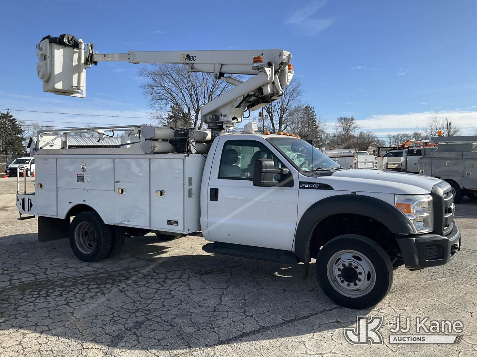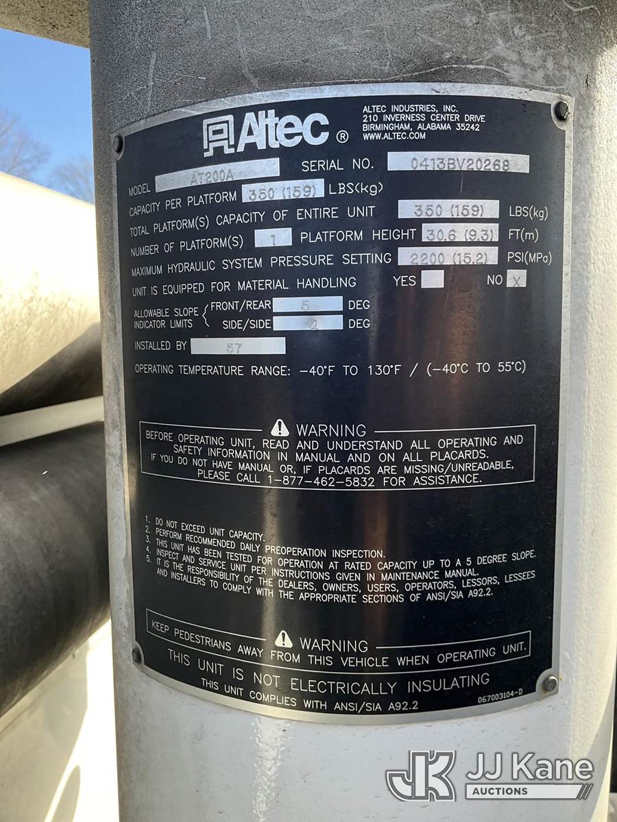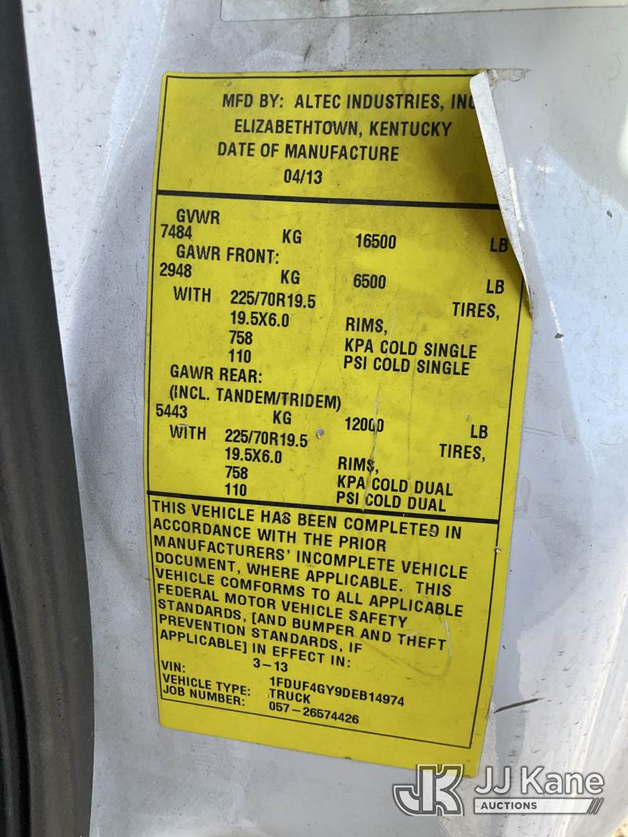 Altec AT200A, 35 ft, Telescopic Bucket Truck s/n 0413BV20268, with single-man, mounted behind cab on 2013 Ford F-450 SD Regular Cab DRW 2WD Service Truck, 6.8L V10 SOHC 30V RWD, GAS, Auto, A/C, (42,849 miles) (Runs, Moves & Upper Operates)(Need Upper Battery, Damage-Passenger Side Service Body) This is a Titled Item NOTE: This unit is being sold AS IS/WHERE IS via Timed Auction and is located in South Beloit, IL. Inspection & preview days for this unit are the 2 business days prior to the first day of items closing for this auction, item is located at 14354 Dearborn Ave South Beloit, IL and hours of operations are 8a-4p. For pre-sale questions, please contact Derek Eklund at (608) 904-0618 or (derek.eklund@jjkane.com). (Manuals provided in cab) (Buyer is responsible for removal. Assistance by consignor or JJ Kane Auctions is not assured.)