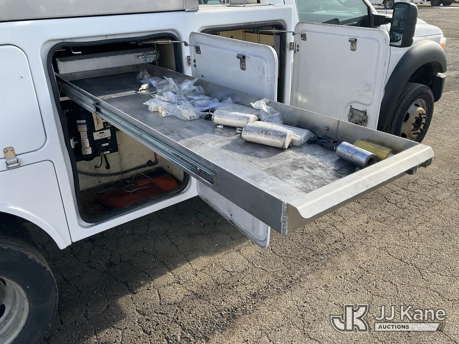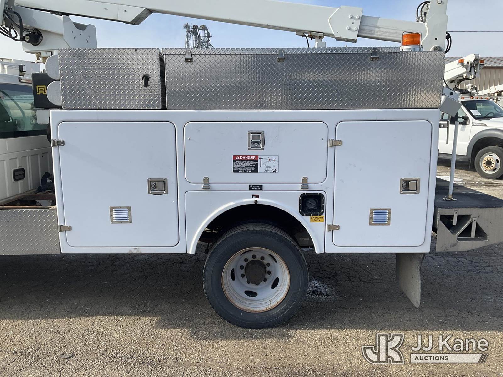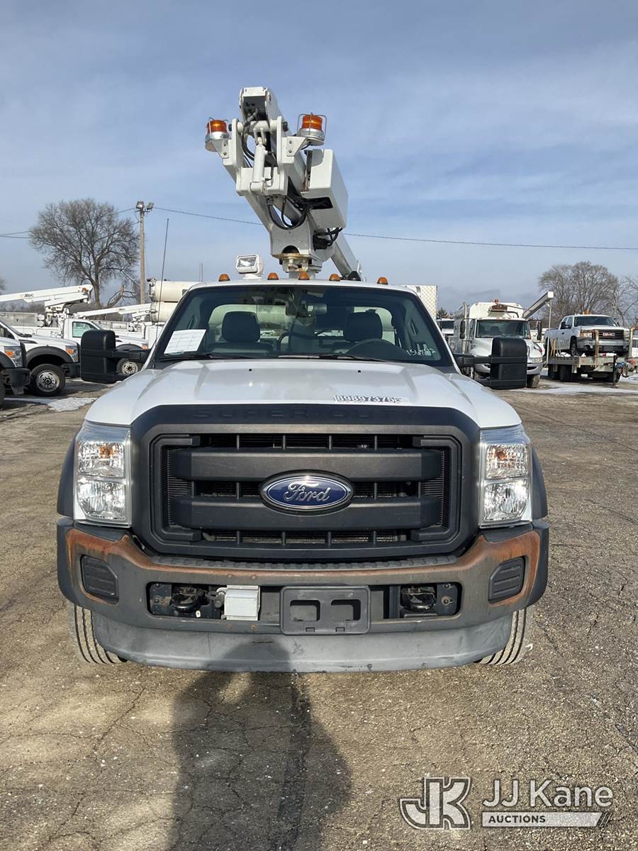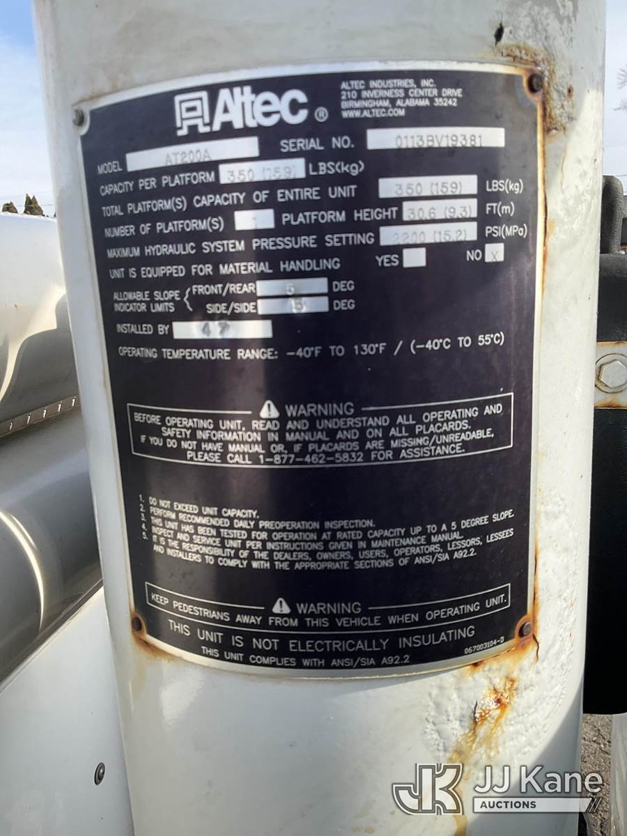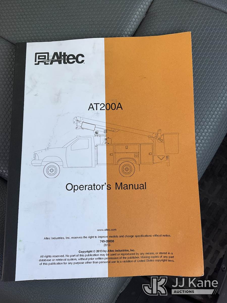 Altec AT200A, 35 ft, Telescopic Non-Insulated Bucket Truck s/n 0113BV19381, with single-man bucket, mounted behind cab on 2013 Ford F-450 SD Service Truck, 6.8L V10 SOHC 30V Auto, RWD, Gas, A/C, (97,974 miles) (Runs, Does Not Move)(Missing Onan Generator, Missing Bucket) This is a Titled Item NOTE: This unit is being sold AS IS/WHERE IS via Timed Auction and is located in South Beloit, IL. Inspection & preview days for this unit are the 2 business days prior to the first day of items closing for this auction, item is located at 14354 Dearborn Ave South Beloit, IL and hours of operations are 8a-4p. For pre-sale questions, please contact Derek Eklund at (608) 904-0618 or (derek.eklund@jjkane.com). (Manuals provided in cab) (Buyer is responsible for removal. Assistance by consignor or JJ Kane Auctions is not assured.)