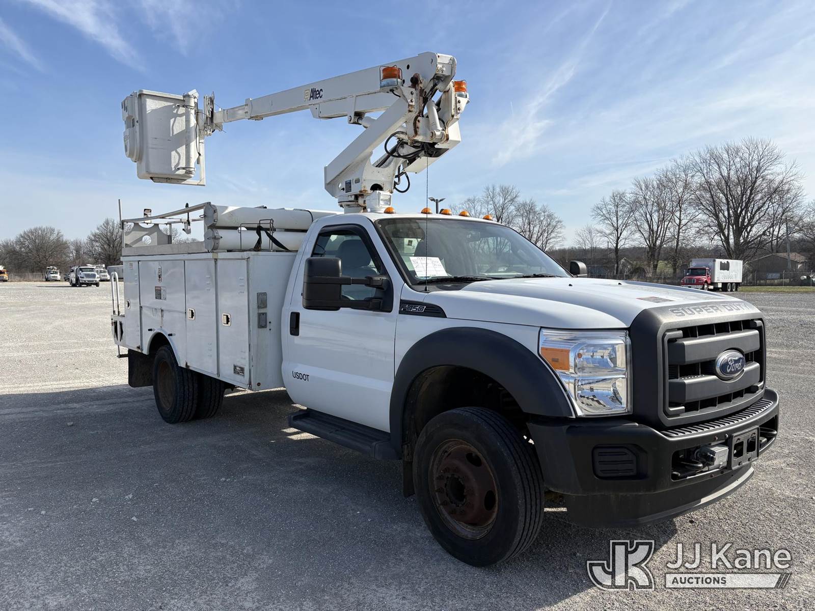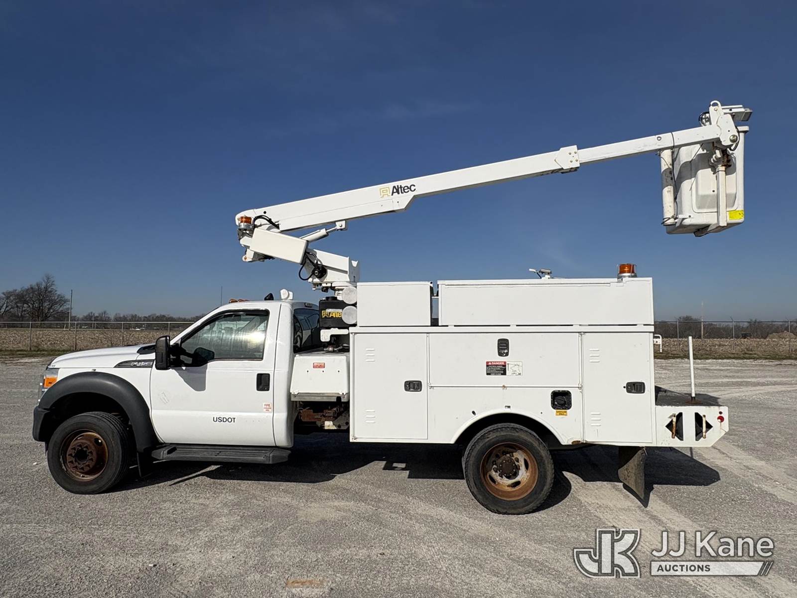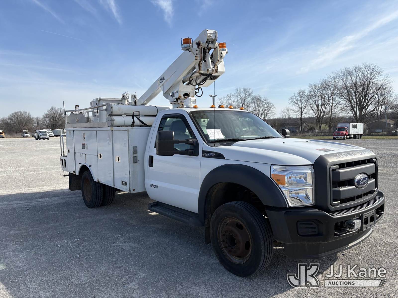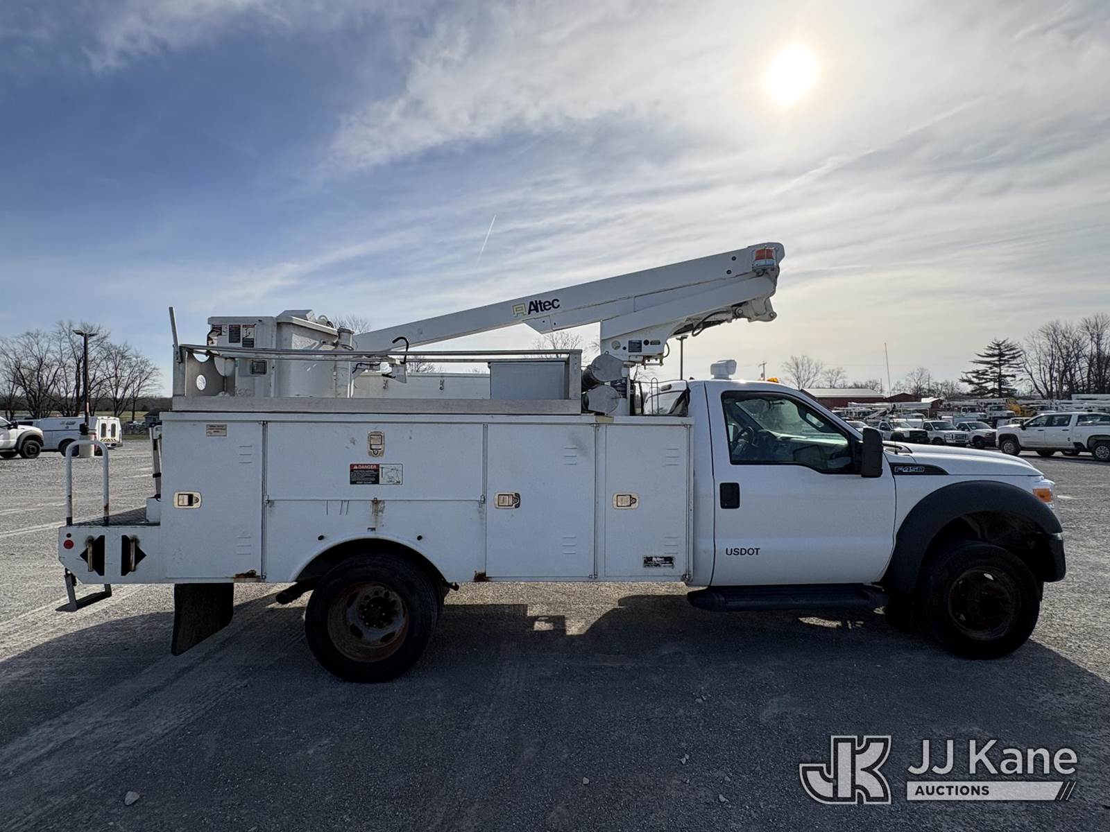 Altec AT200A, 35 ft, Telescopic Non-Insulated Bucket Truck s/n 0613BV20558, with single man bucket, mounted behind cab on 2013 Ford F-450 SD Service Truck, 10-cyl gas, RWD, Auto, A/C, (83,152 miles) (Runs, Moves, & Upper Operates, Generator Jump To Start) (Minor Rust On Utility Box) (Reads 6,279 hours) This is a Titled Item NOTE: This unit is being sold AS IS/WHERE IS via Timed Auction and is located in Hawk Point, MO. Inspection & preview days for this unit are the 2 business days prior to the first day of items closing for this auction, item is located at 25 State Highway A Hawk Point, MO 63349 and hours of operations are 8a-4p. For pre-sale questions, please contact Adam Stanek at (636) 295-1594. (Manuals provided in cab) (Buyer is responsible for removal. Assistance by consignor or JJ Kane Auctions is not assured.)