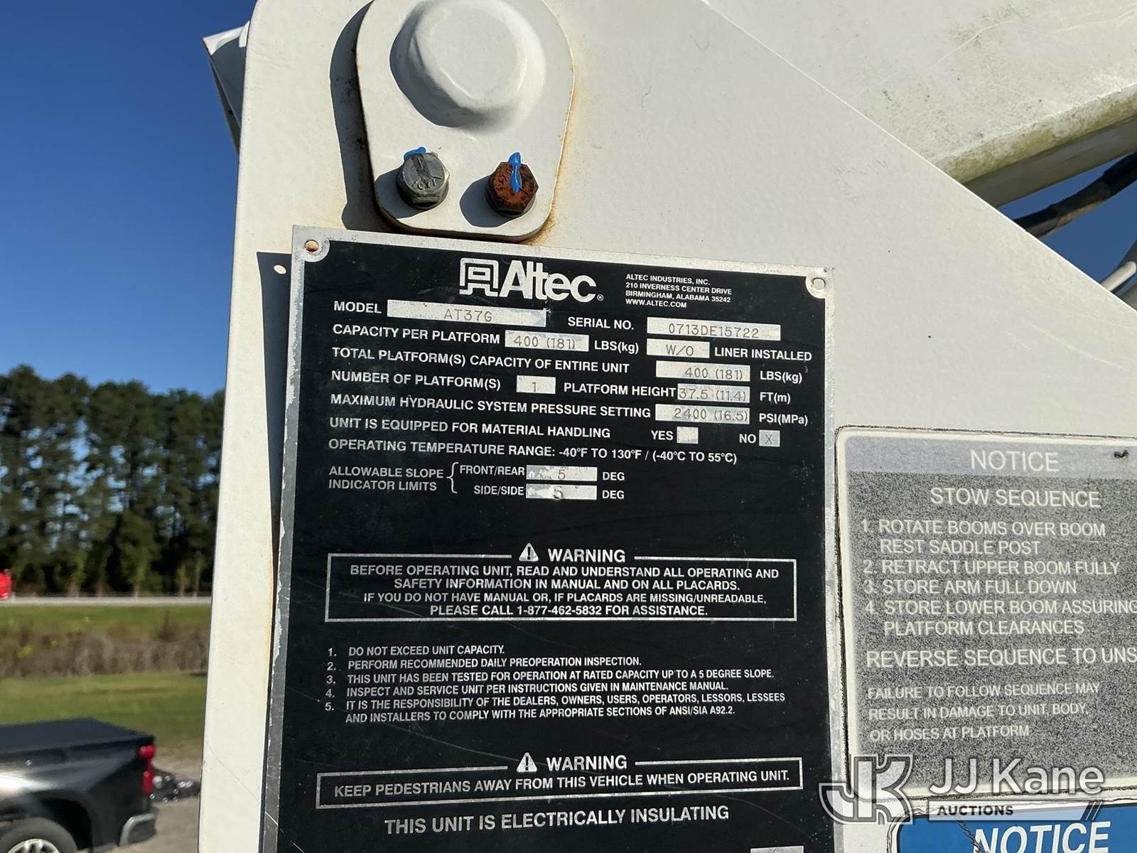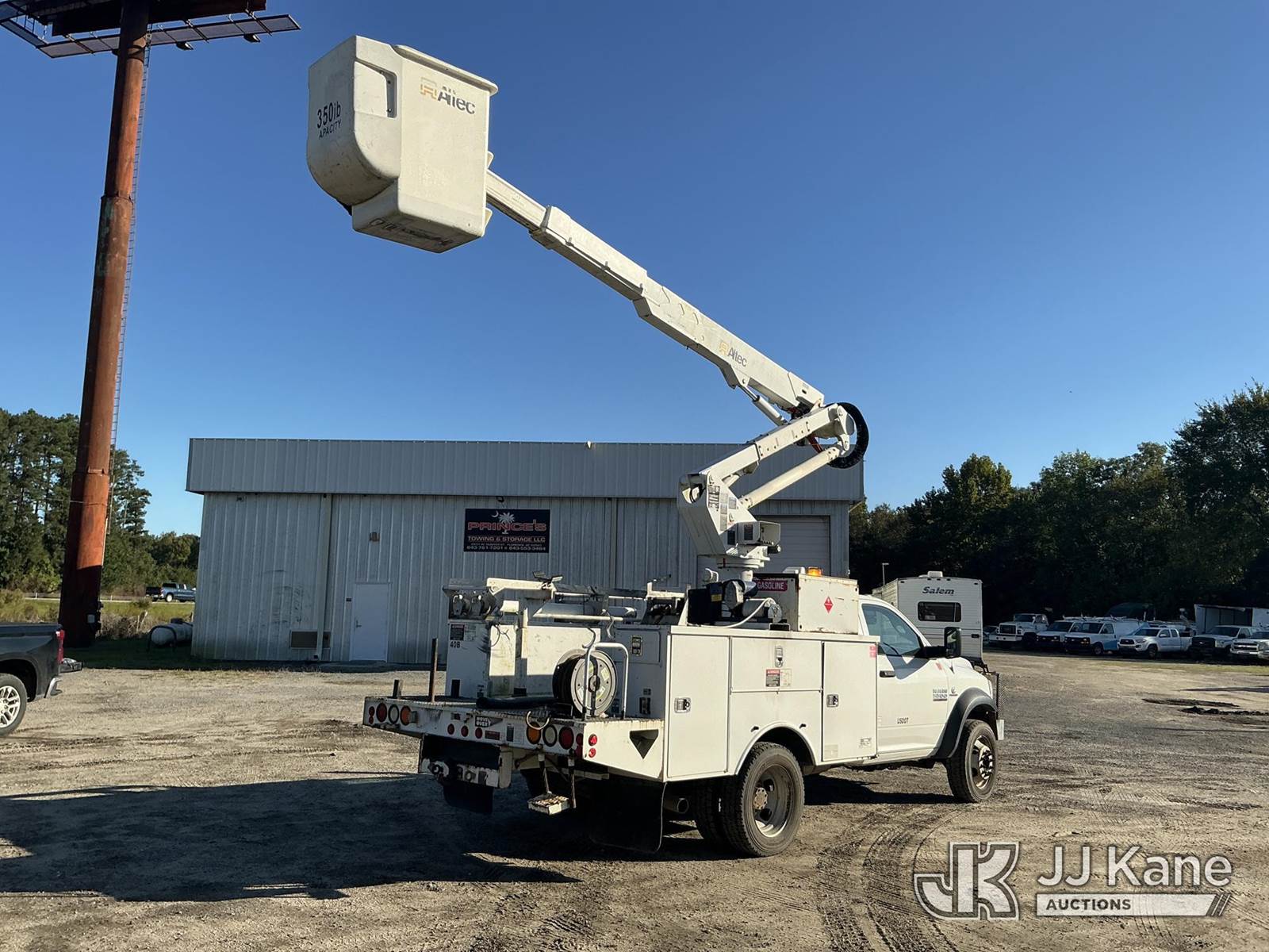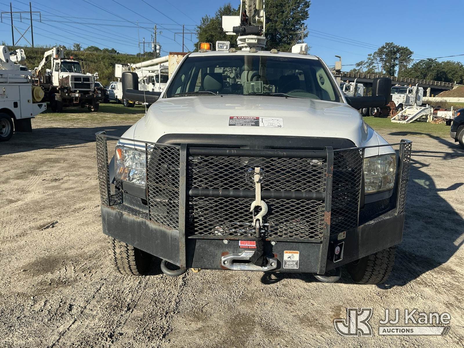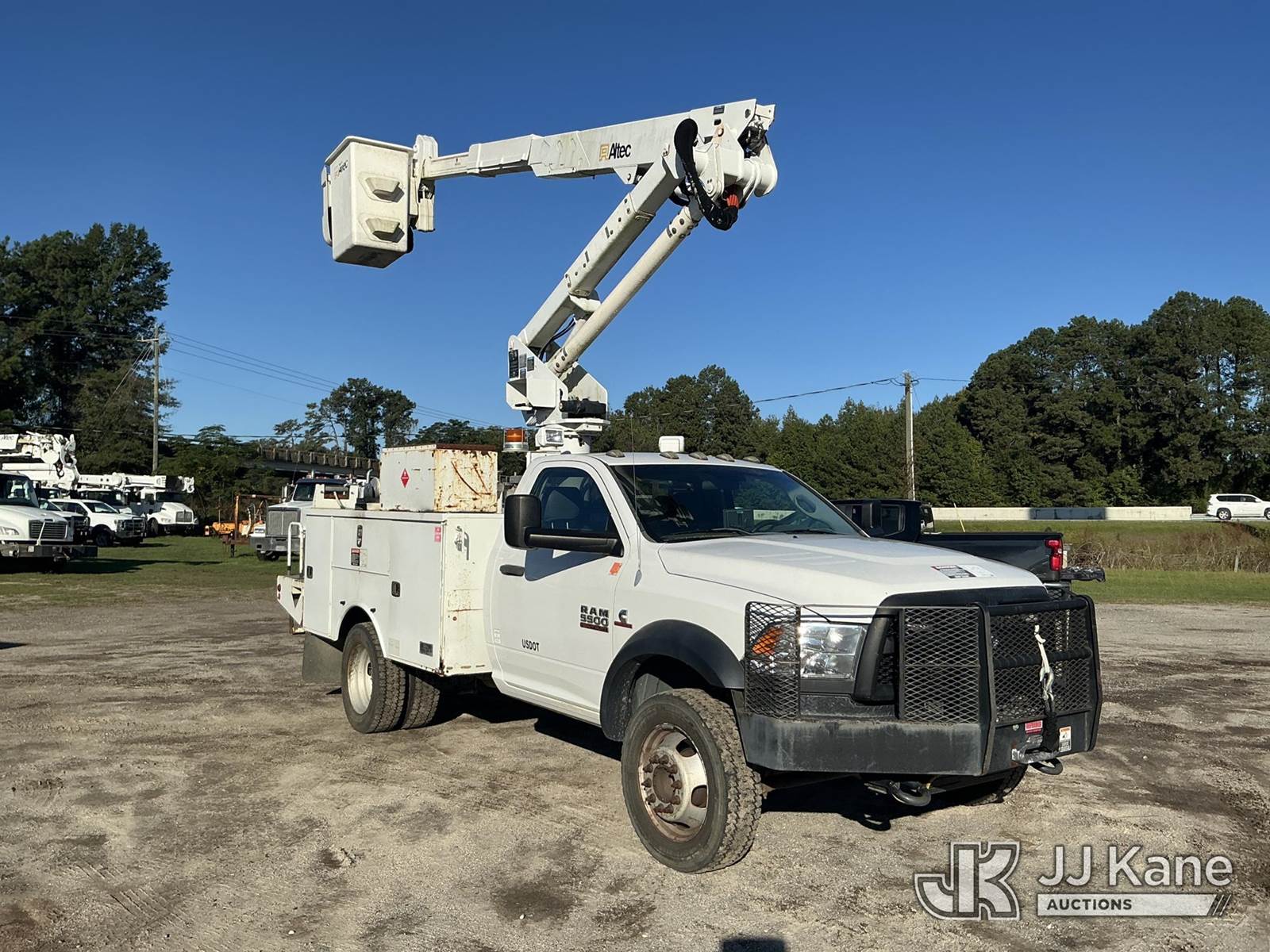 Altec AT37G, 42 ft, Articulating & Telescopic Bucket Truck s/n 0713DE15722, with single man bucket, mounted behind cab on 2013 RAM 5500 4x4 Service Truck, 6.7L L6 OHV 24V Turbo Auto, diesel, with grill guard, 16,500lb front winch with remote, and rear body mounted winch, (243,851 miles) Co-Op Unit (Runs, Moves, Upper Operates, Check Engine Light On) This is a Titled Item NOTE: This unit is being sold AS IS/WHERE IS via Timed Auction and is located in Florence, SC. Inspection & preview days for this unit are by appointment only; please contact us at contact@jjkane.com or 84-Go-JJKane for more details. (Manuals provided in cab) (Buyer is responsible for removal. Assistance by consignor or JJ Kane Auctioneers is not assured.)