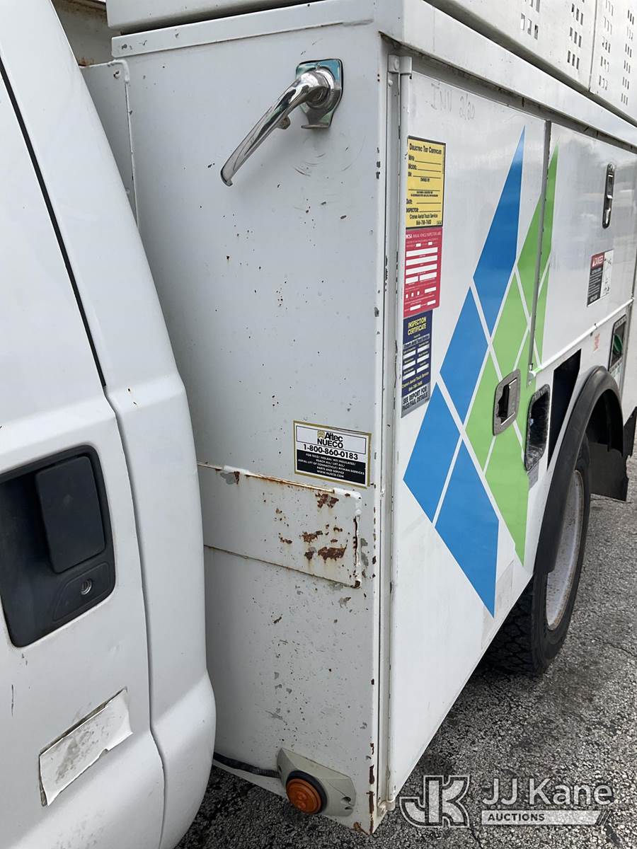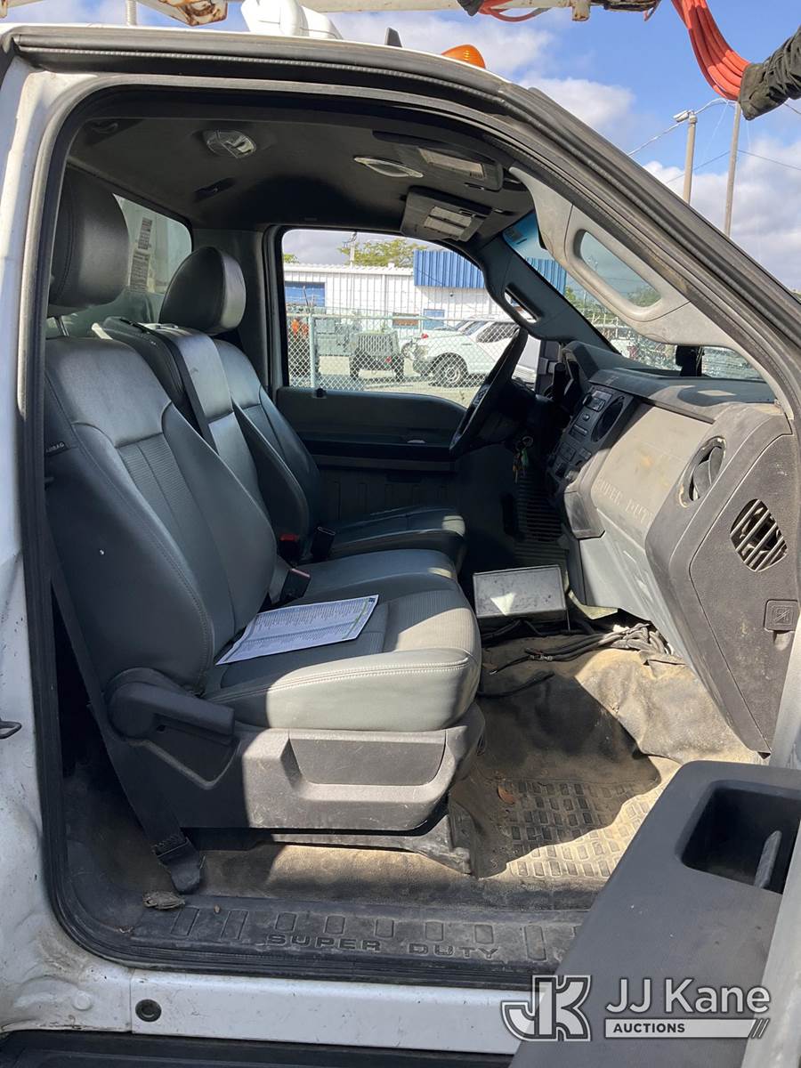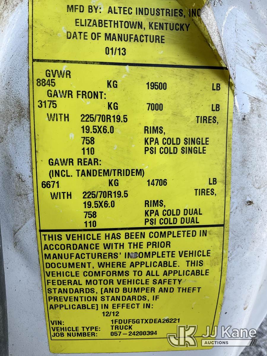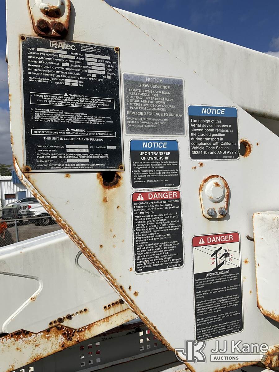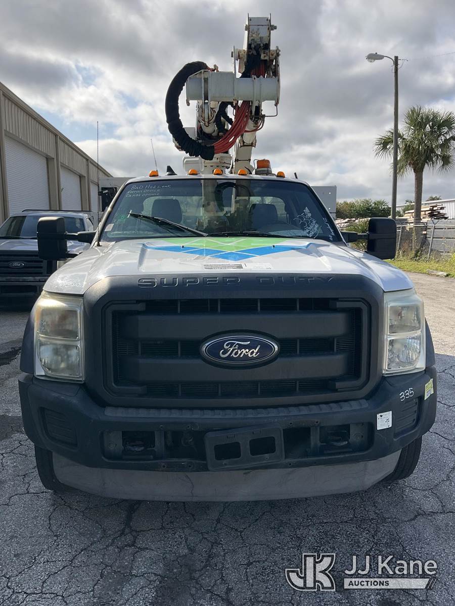 Altec AT37G, 42 ft, Articulating & Telescopic Bucket Truck s/n 0113DE15097, with single-man bucket, mounted behind cab on 2013 Ford F-550 Regular Cab DRW Service Truck, 6.7L V8 OHV 16V DIESEL Auto, RWD, A/C, (127,957 miles) (Runs & Moves) (Do Not Engage PTO Bucket Hydraulic Leak, Upper Unit Operating Condition Unknown, Check Engine Light On, Body Damage & Rust) (FL Residents Purchasing Titled Items - tax, title & registration fees will be collected at the maximum rate of $400.00 under 25,999 and $800.00 for Over 26,000 and $250.00 for Trailers - Proof of insurance is mandatory; Out of State Residents Purchasing Title Items - tax will be collected based upon your state rate) (Reads 9,016 hours) This is a Titled Item NOTE: This unit is being sold AS IS/WHERE IS via Timed Auction and is located in West Palm Beach, FL. Inspection & preview days for this unit are the 2 business days prior to the first day of items closing for this auction, item is located at 2570 Old Okeechobee Rd West Palm Beach, FL 33409 and hours of operations are 8a-4p. For pre-sale questions, please contact Andy Garcia@ 561-215-0085 (Manuals provided in cab) (Buyer is responsible for removal. Assistance by consignor or JJ Kane Auctioneers is not assured.)