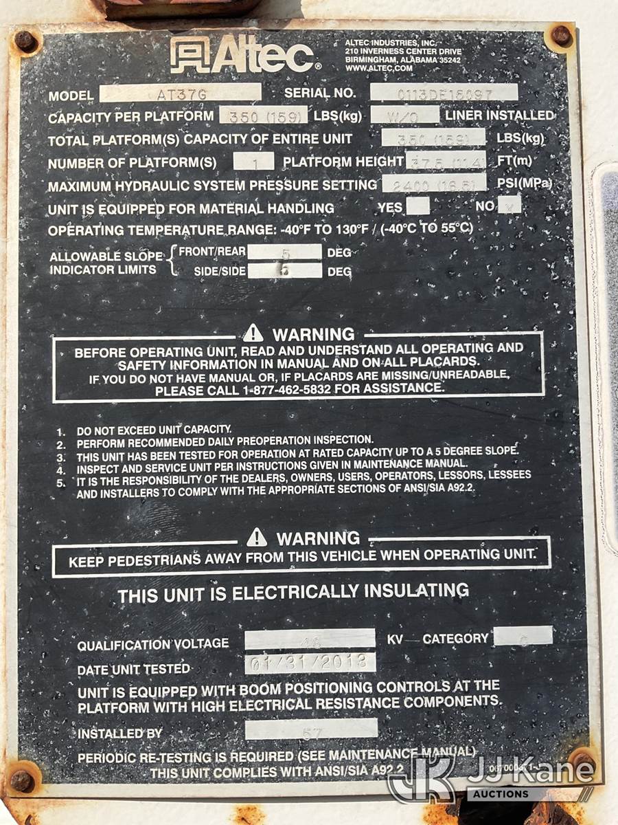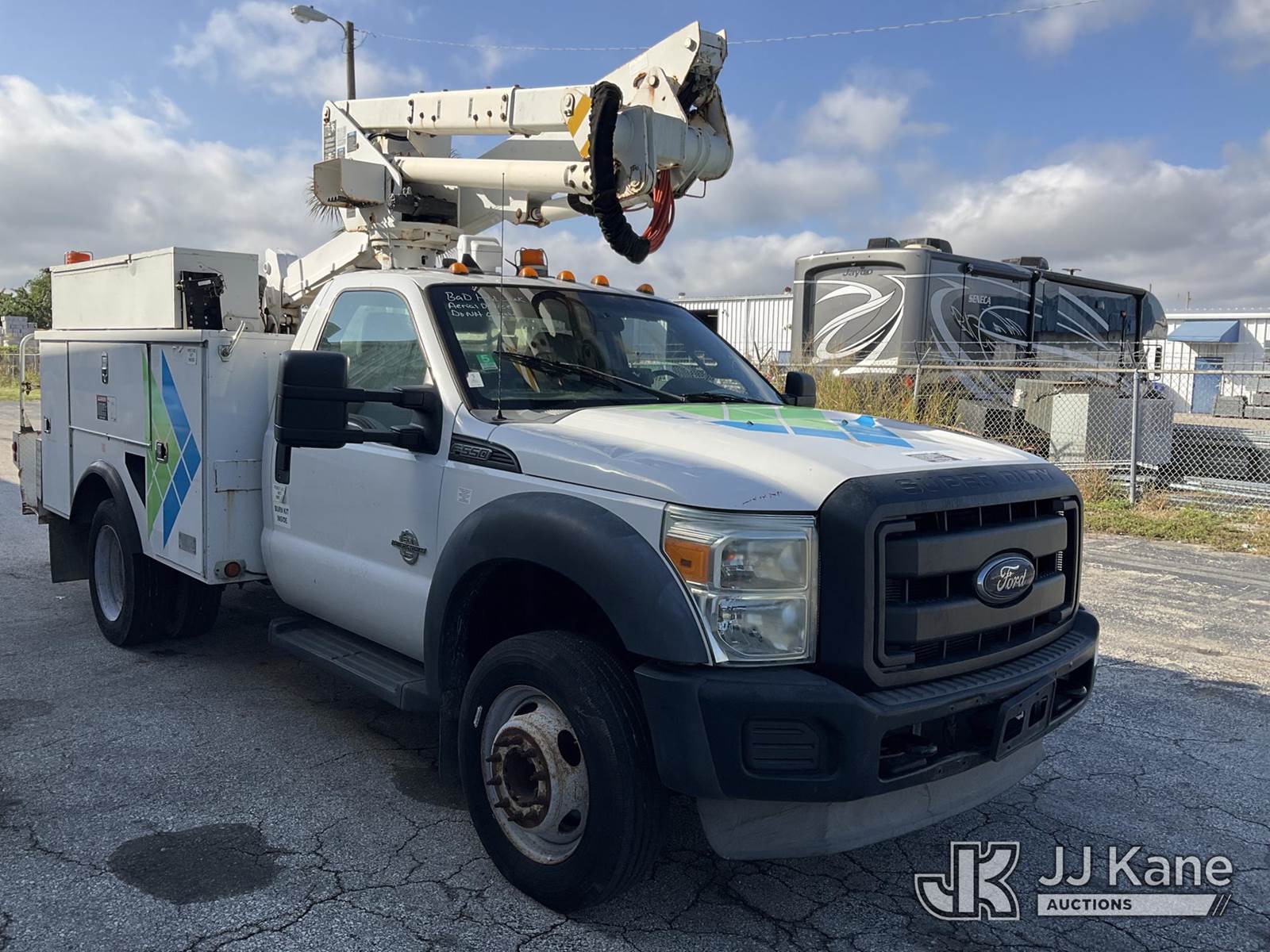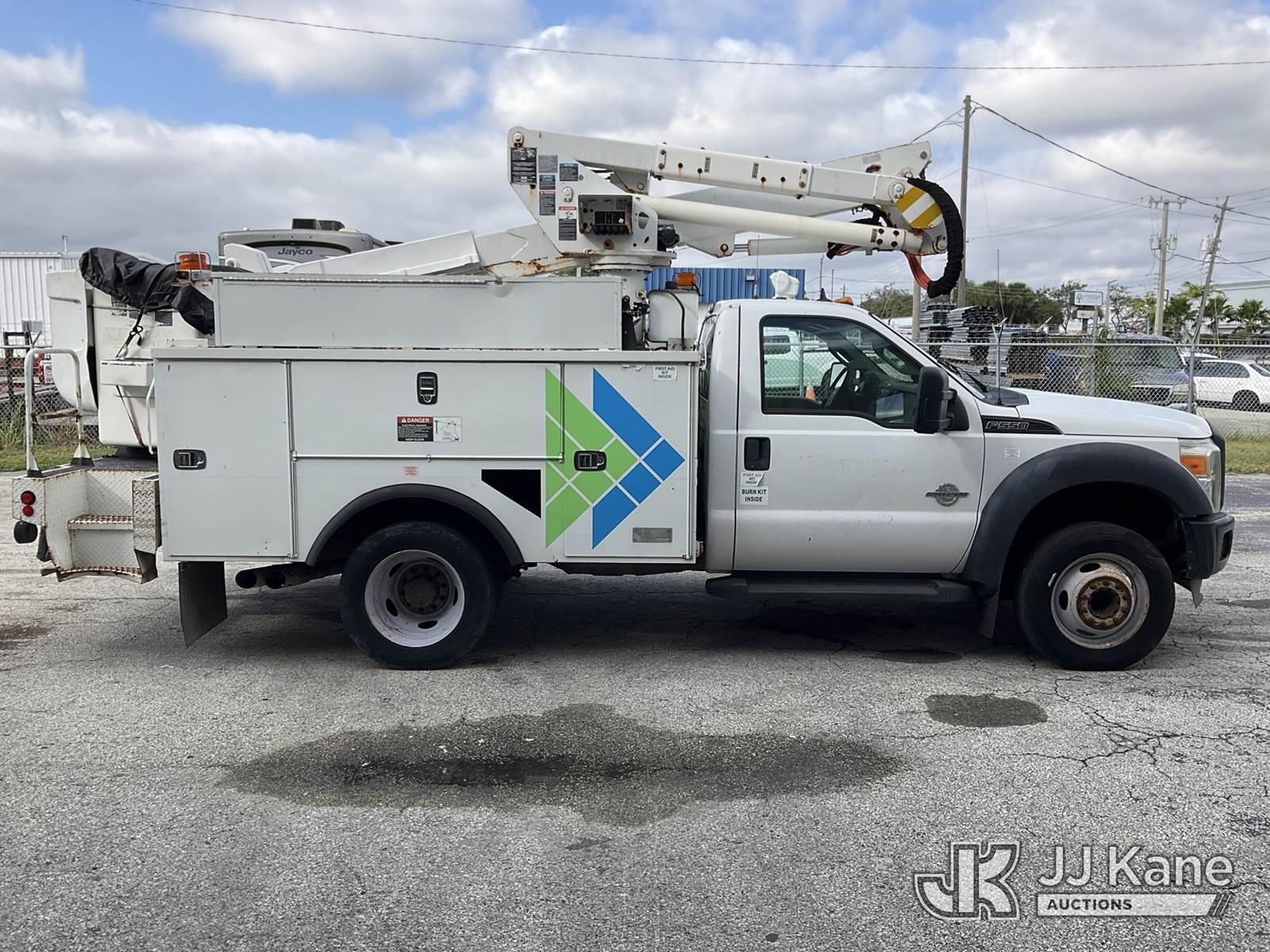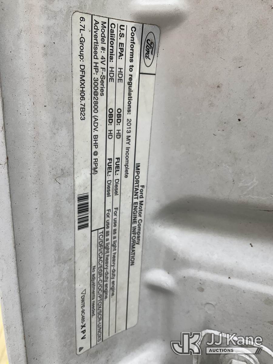 Altec AT37G, 42 ft, Articulating & Telescopic Bucket Truck s/n 0113DE15097, with single-man bucket, mounted behind cab on 2013 Ford F-550 Regular Cab DRW Service Truck, 6.7L V8 OHV 16V DIESEL Auto, RWD, A/C, (127,957 miles) (Runs & Moves) (Do Not Engage PTO Bucket Hydraulic Leak, Upper Unit Operating Condition Unknown, Check Engine Light On, Body Damage & Rust) (FL Residents Purchasing Titled Items - tax, title & registration fees will be collected at the maximum rate of $400.00 under 25,999 and $800.00 for Over 26,000 and $250.00 for Trailers - Proof of insurance is mandatory; Out of State Residents Purchasing Title Items - tax will be collected based upon your state rate) (Reads 9,016 hours) This is a Titled Item NOTE: This unit is being sold AS IS/WHERE IS via Timed Auction and is located in West Palm Beach, FL. Inspection & preview days for this unit are the 2 business days prior to the first day of items closing for this auction, item is located at 2570 Old Okeechobee Rd West Palm Beach, FL 33409 and hours of operations are 8a-4p. For pre-sale questions, please contact Andy Garcia@ 561-215-0085 (Manuals provided in cab) (Buyer is responsible for removal. Assistance by consignor or JJ Kane Auctioneers is not assured.)
