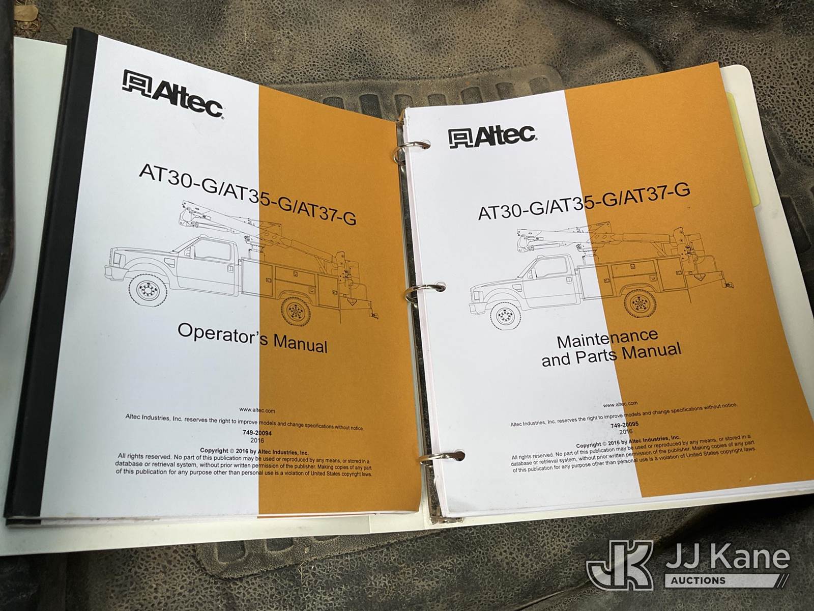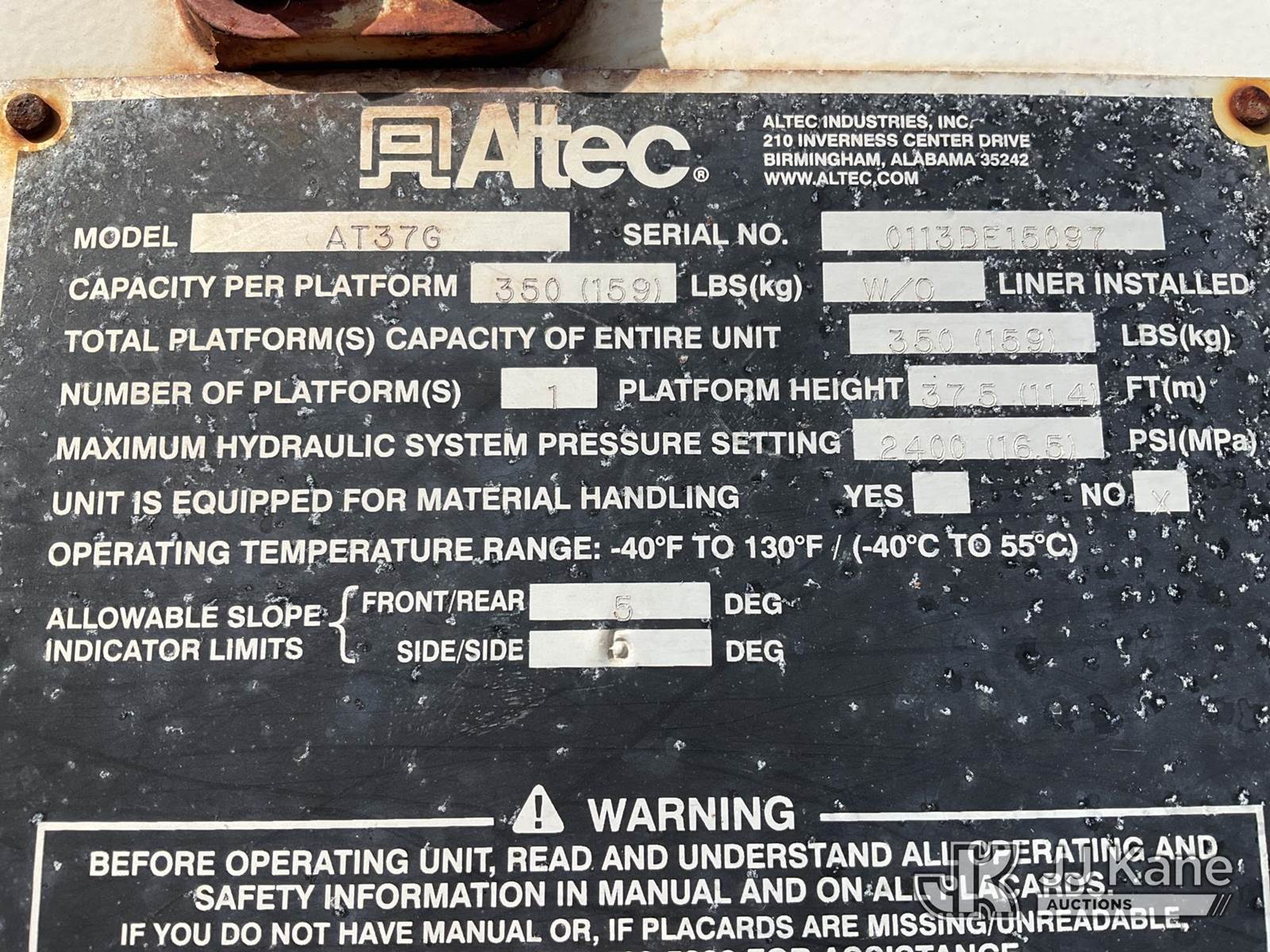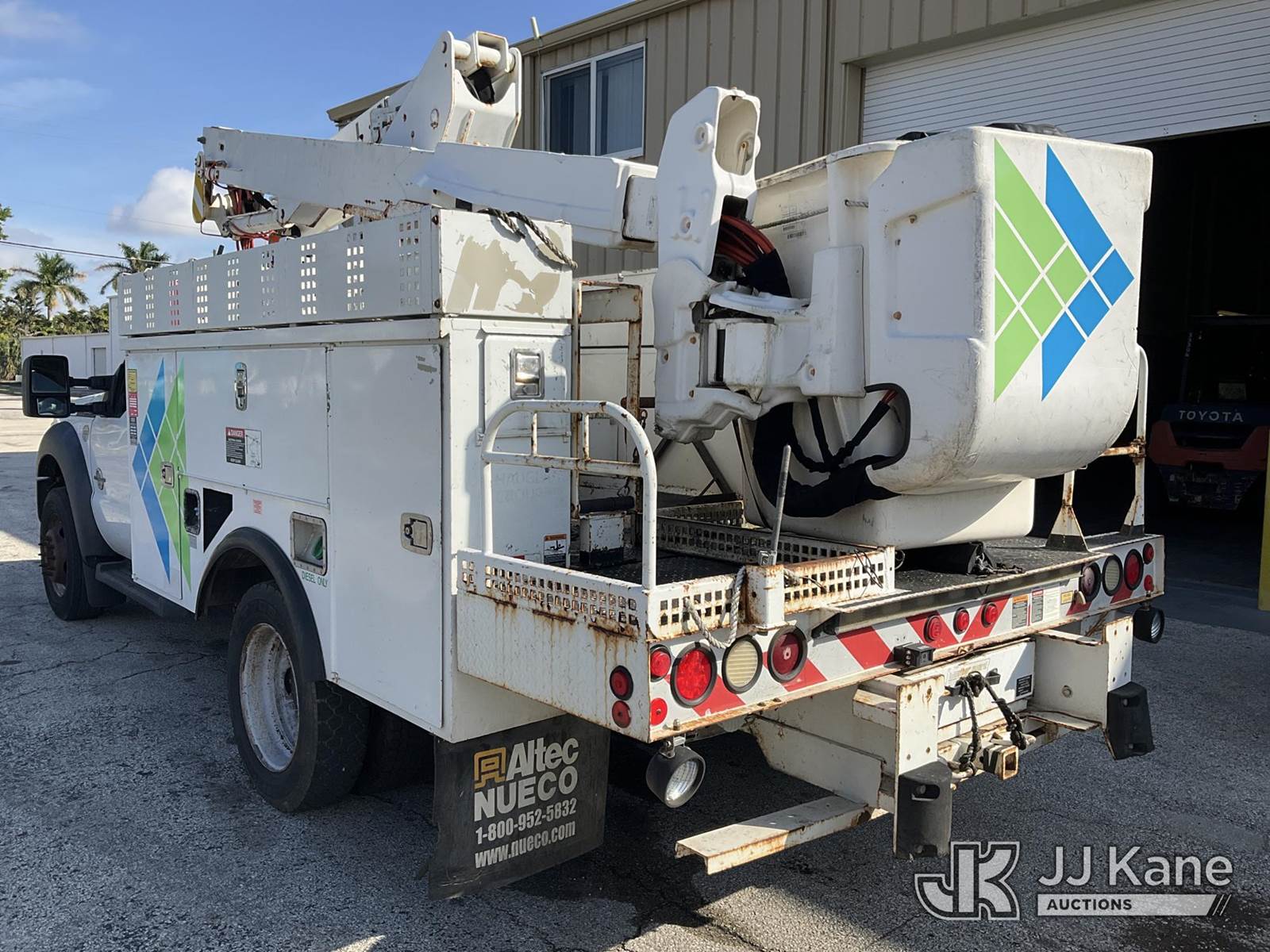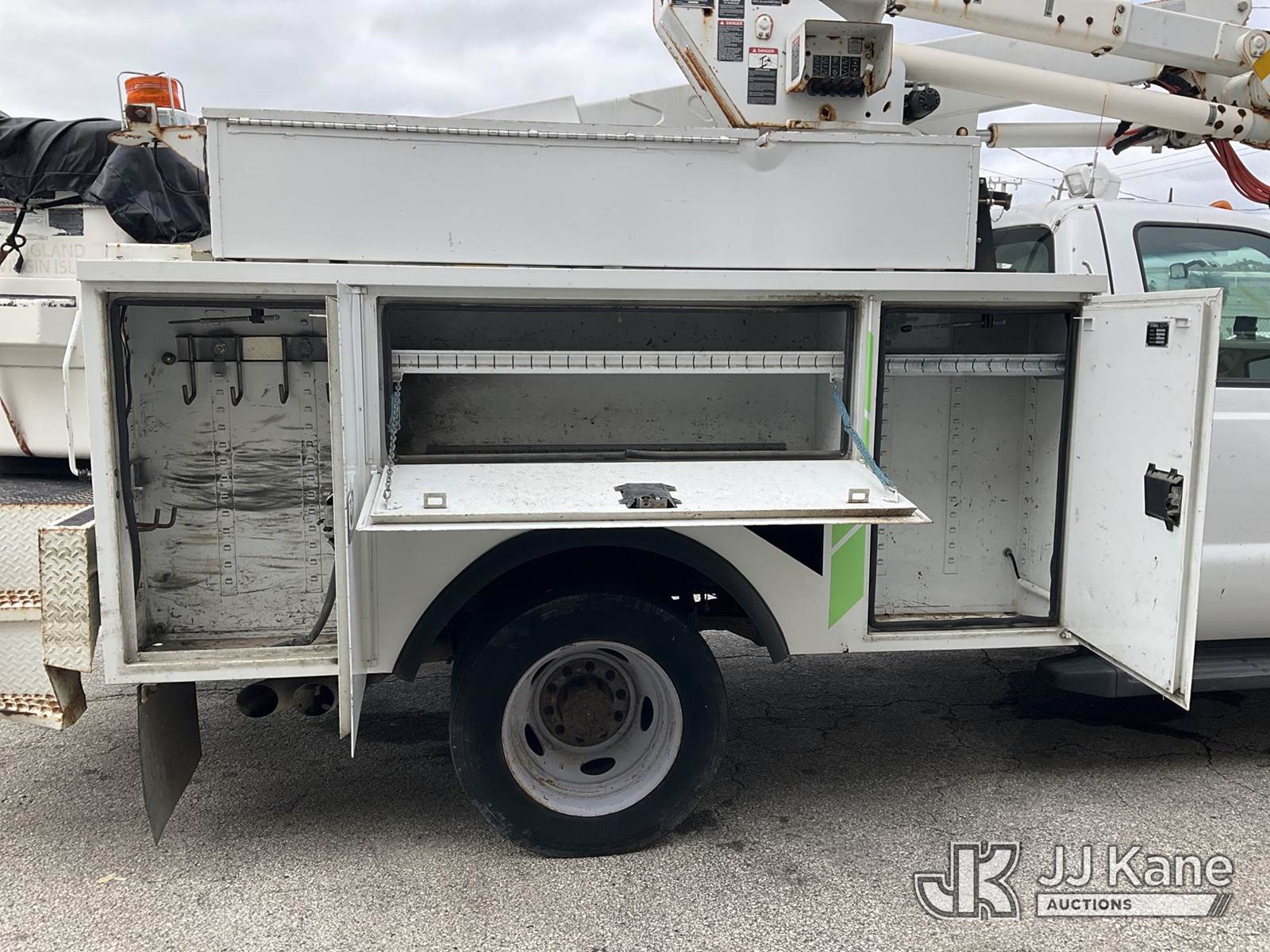 Altec AT37G, 42 ft, Articulating & Telescopic Bucket Truck s/n 0113DE15097, with single-man bucket, mounted behind cab on 2013 Ford F-550 Regular Cab DRW Service Truck, 6.7L V8 OHV 16V DIESEL Auto, RWD, A/C, (127,957 miles) (Runs & Moves) (Do Not Engage PTO Bucket Hydraulic Leak, Upper Unit Operating Condition Unknown, Check Engine Light On, Body Damage & Rust) (FL Residents Purchasing Titled Items - tax, title & registration fees will be collected at the maximum rate of $400.00 under 25,999 and $800.00 for Over 26,000 and $250.00 for Trailers - Proof of insurance is mandatory; Out of State Residents Purchasing Title Items - tax will be collected based upon your state rate) (Reads 9,016 hours) This is a Titled Item NOTE: This unit is being sold AS IS/WHERE IS via Timed Auction and is located in West Palm Beach, FL. Inspection & preview days for this unit are the 2 business days prior to the first day of items closing for this auction, item is located at 2570 Old Okeechobee Rd West Palm Beach, FL 33409 and hours of operations are 8a-4p. For pre-sale questions, please contact Andy Garcia@ 561-215-0085 (Manuals provided in cab) (Buyer is responsible for removal. Assistance by consignor or JJ Kane Auctioneers is not assured.)