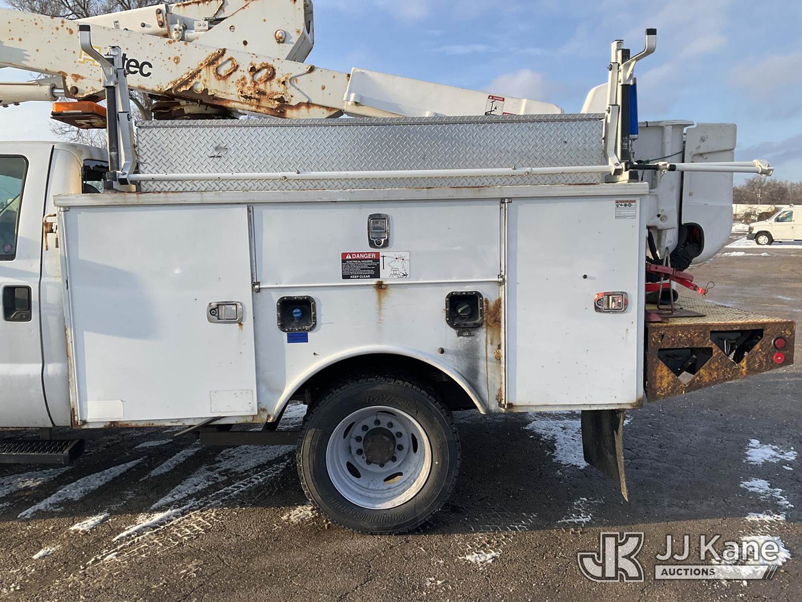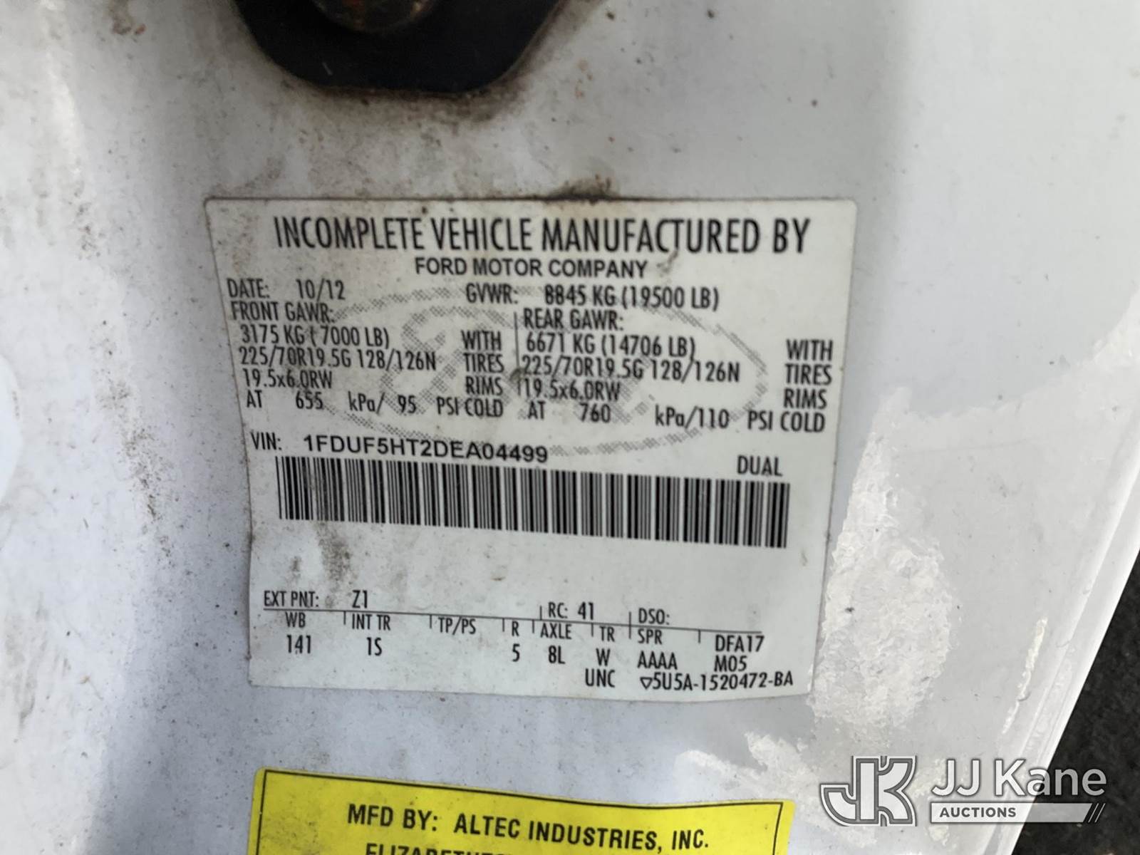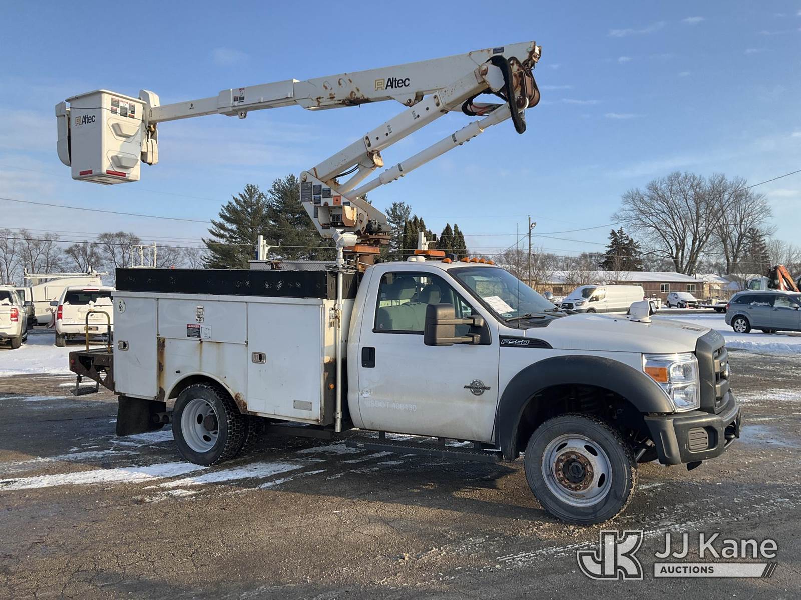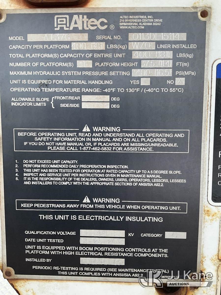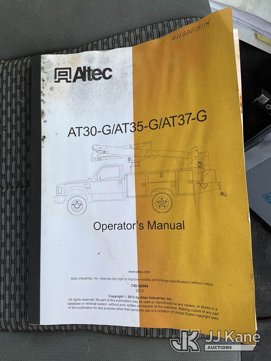 Altec AT37G, 42 ft, Articulating & Telescopic Bucket Truck s/n 0113DE15114, with Single-Man Bucket, mounted behind cab on 2013 Ford F550 4x4 Service Truck, 6.7L Diesel Auto, A/C, (325,769 miles) (Runs, Moves & Upper Operates) (Seller States: Rear Window Blown Out, Frame Bent, Front Axle Bent, Rear Axle Bent Or Spring Mount Broken, Service Body Rusty) (Reads 21,982 hours) This is a Titled Item NOTE: This unit is being sold AS IS/WHERE IS via Timed Auction and is located in South Beloit, IL. Inspection & preview days for this unit are the 2 business days prior to the first day of items closing for this auction, item is located at 14354 Dearborn Ave South Beloit, IL and hours of operations are 8a-4p. For pre-sale questions, please contact Derek Eklund at (608) 904-0618 or (derek.eklund@jjkane.com). (Manuals provided in cab) (Buyer is responsible for removal. Assistance by consignor or JJ Kane Auctions is not assured.)