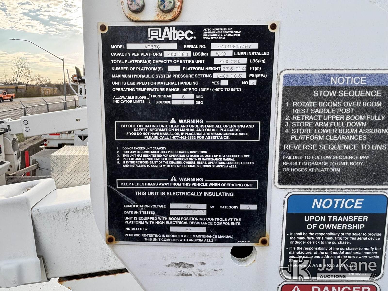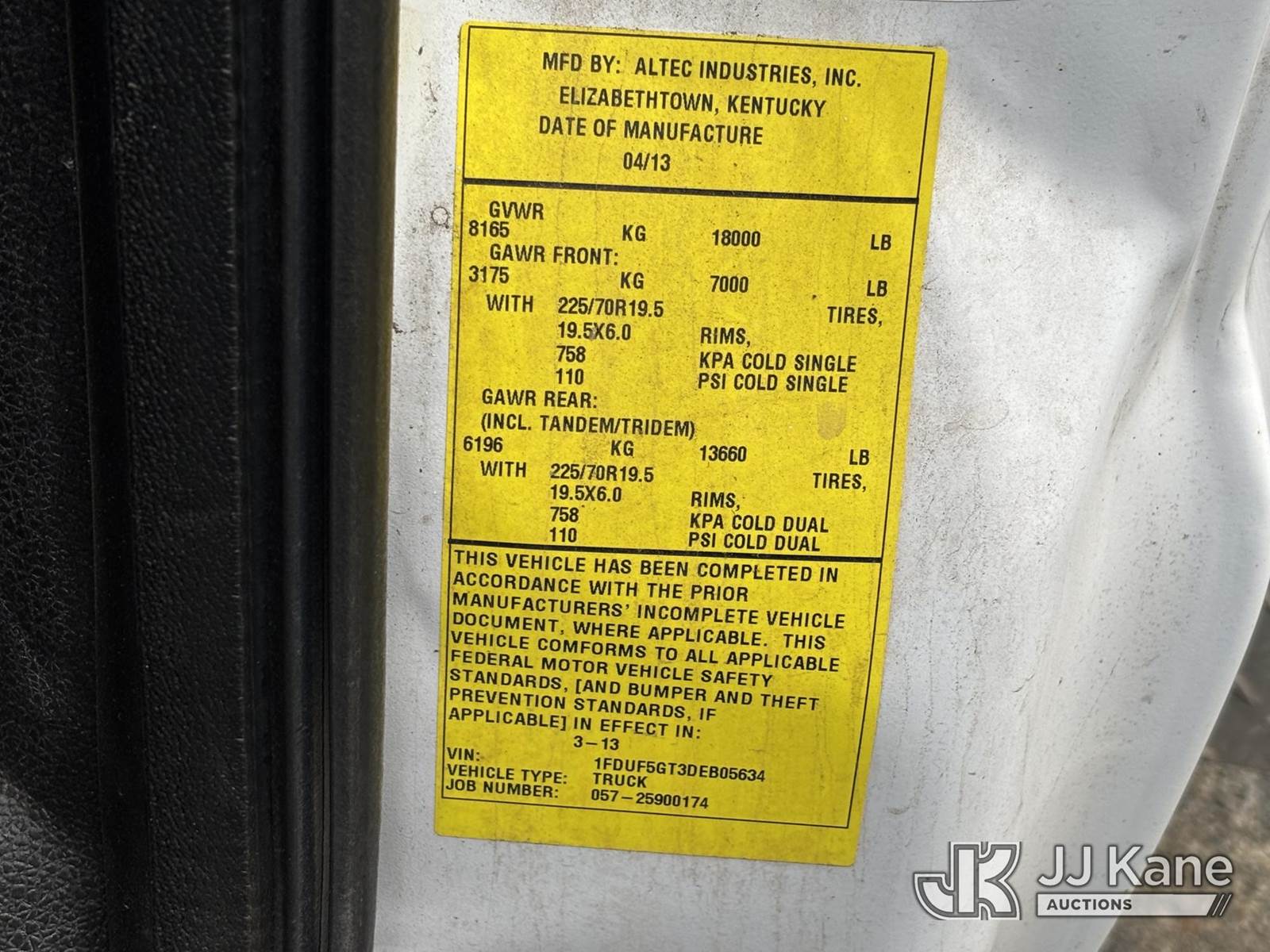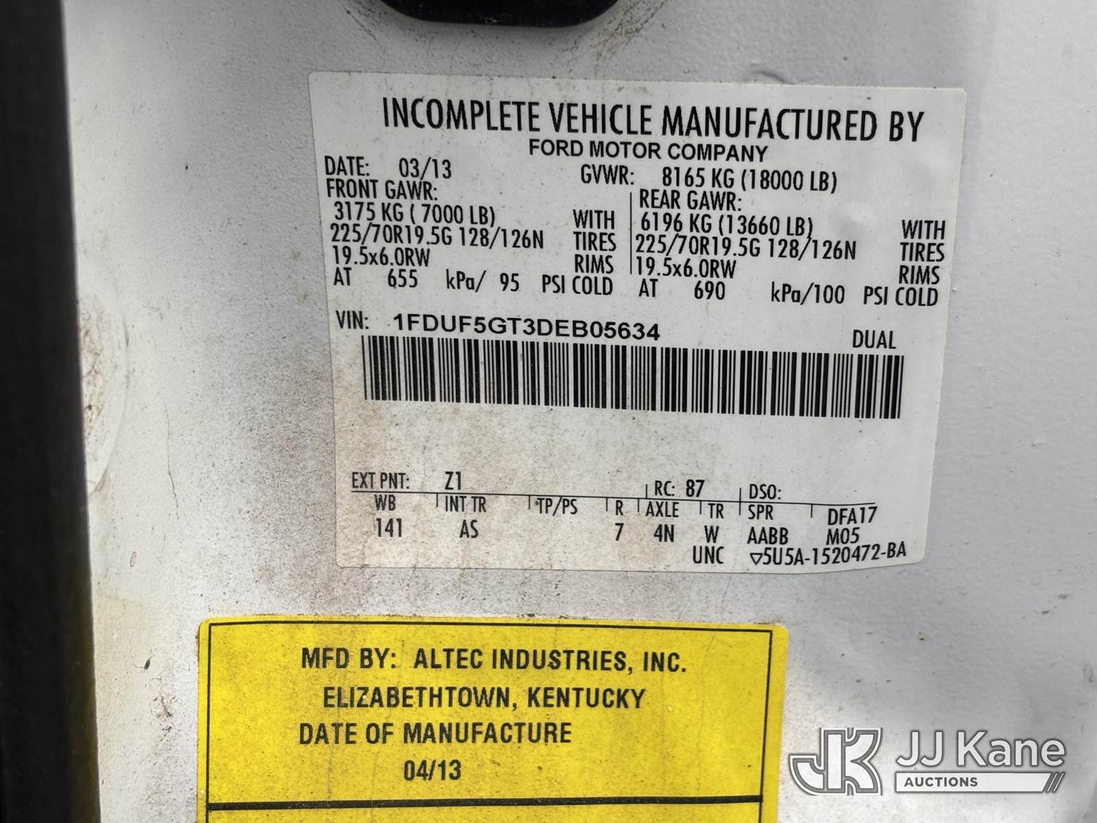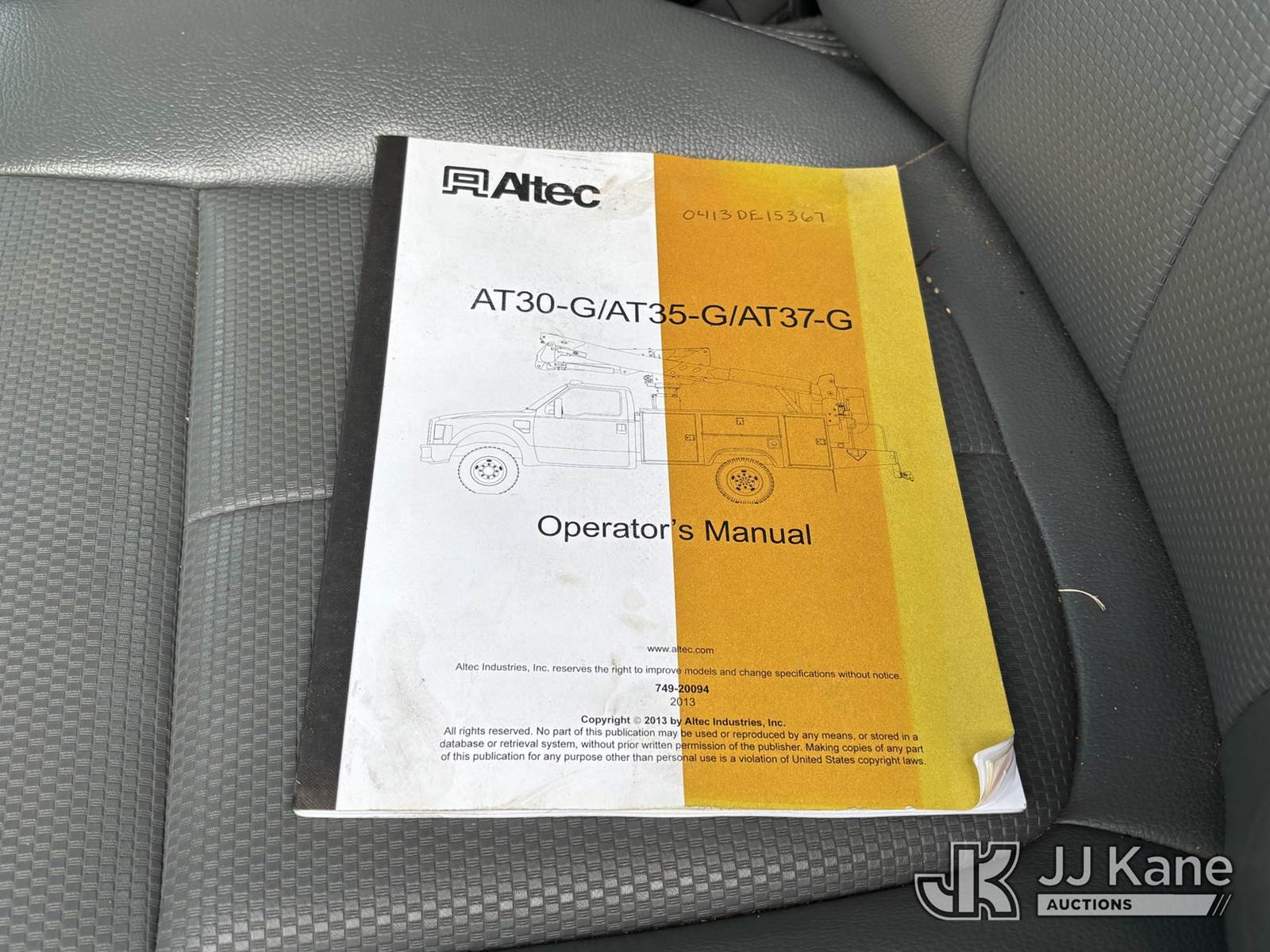 Altec AT37G, 42 ft, Articulating & Telescopic Bucket Truck s/n 0413DE15367, with single-man bucket, mounted behind cab on 2013 Ford F550 2WD Service Truck, 6.7L diesel, Auto, A/C, (24,210 miles) (Not Running, Condition Unknown, Upper Condition Unknown, Must Tow, Buyer Must Load) This is a Titled Item NOTE: This unit is being sold AS IS/WHERE IS via Timed Auction and is located in Plymouth Meeting, PA. Inspection & preview days for this unit are the 2 business days prior to the first day of items closing for this auction, item is located at 1402 Conshohocken Rd Plymouth Meeting, PA 19462 and hours of operations are 8a-4p. For pre-sale questions, please contact Bruce Thomas @ (267) 887-0392 or bruce.thomas.jr@jjkane.com. (Manuals provided in cab) (Buyer is responsible for removal. Assistance by consignor or JJ Kane Auctions is not assured.)