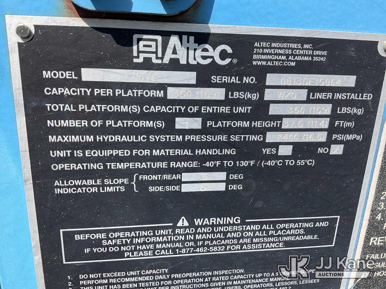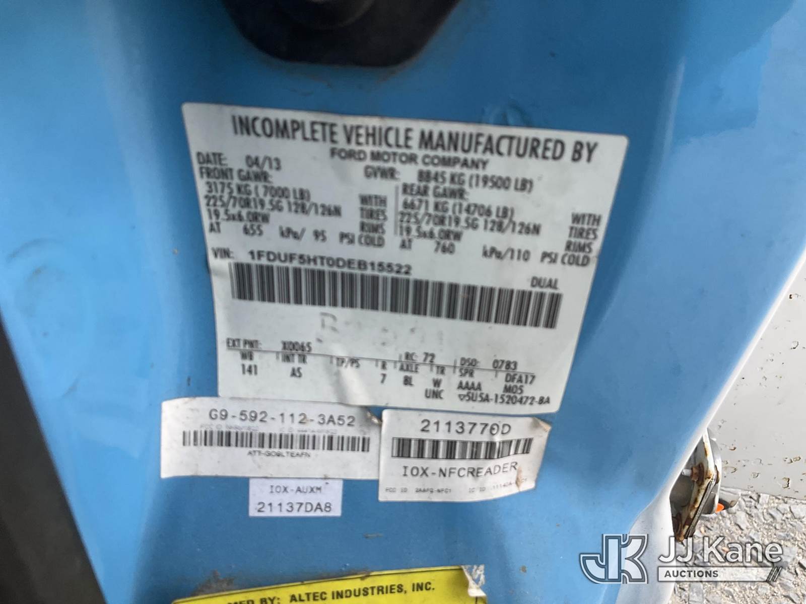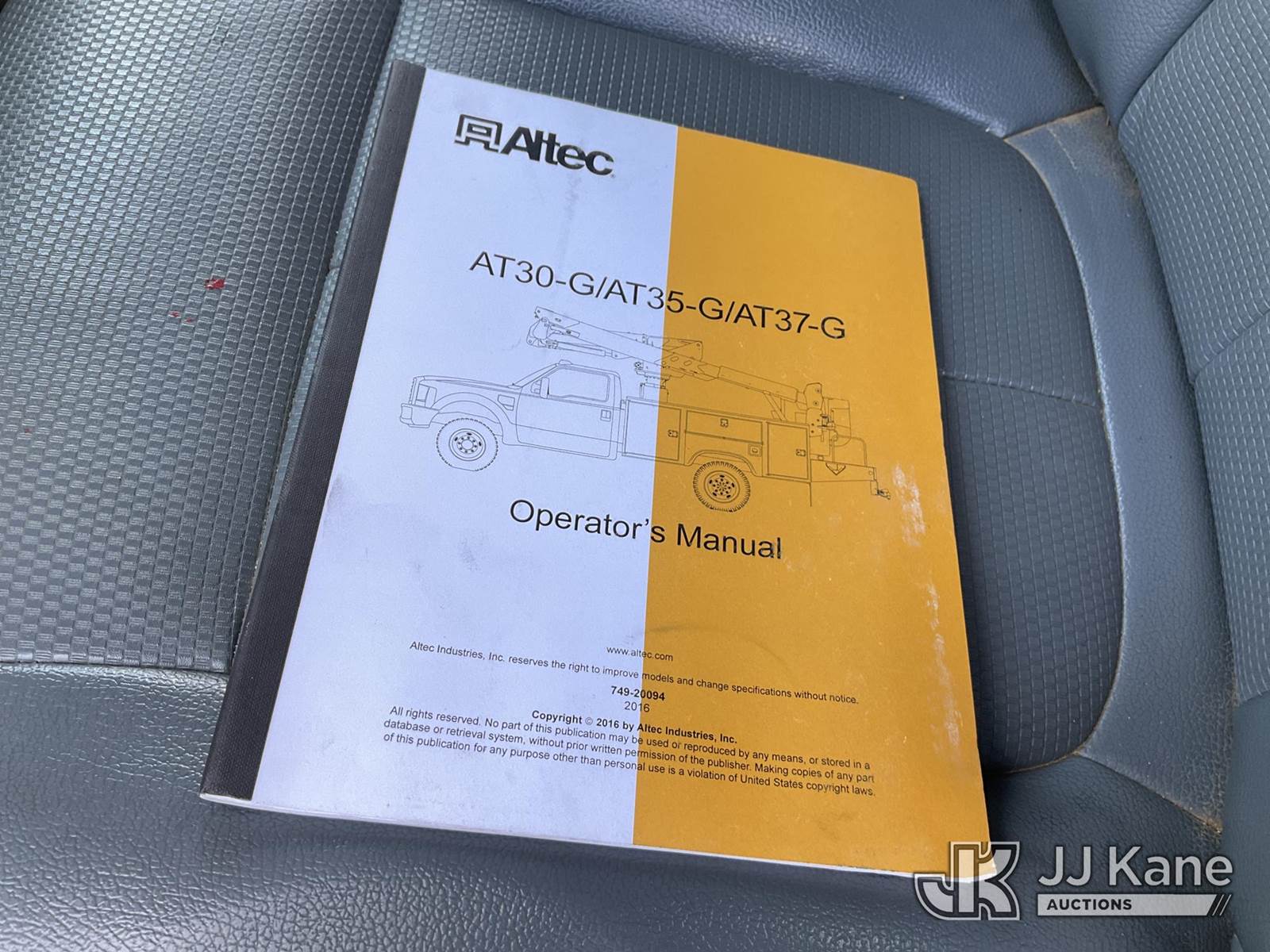 Altec AT37G, 42 ft, Articulating & Telescopic Bucket Truck s/n 0813DE15804, mounted behind cab on 2013 Ford F550 4X4 Service Truck, 6.7L diesel, Auto, A/C, True Mileage Unknown (Not Running, Condition Unknown, Engine Parts In Back, Bucket Removed, No Keys, Seller States: Blown Motor) This is a Titled Item NOTE: This unit is being sold AS IS/WHERE IS via Timed Auction and is located in China Grove, NC. Inspection & preview days for this unit are the 2 business days prior to the first day of items closing for this auction, item is located at 820 E NC Hwy 152 China Grove, NC 28023 and hours of operations are 8a-4p. For pre-sale questions, please contact Office Staff @ (704) 674-1113. (Manuals provided in cab) (Buyer is responsible for removal. Assistance by consignor or JJ Kane Auctions is not assured.)