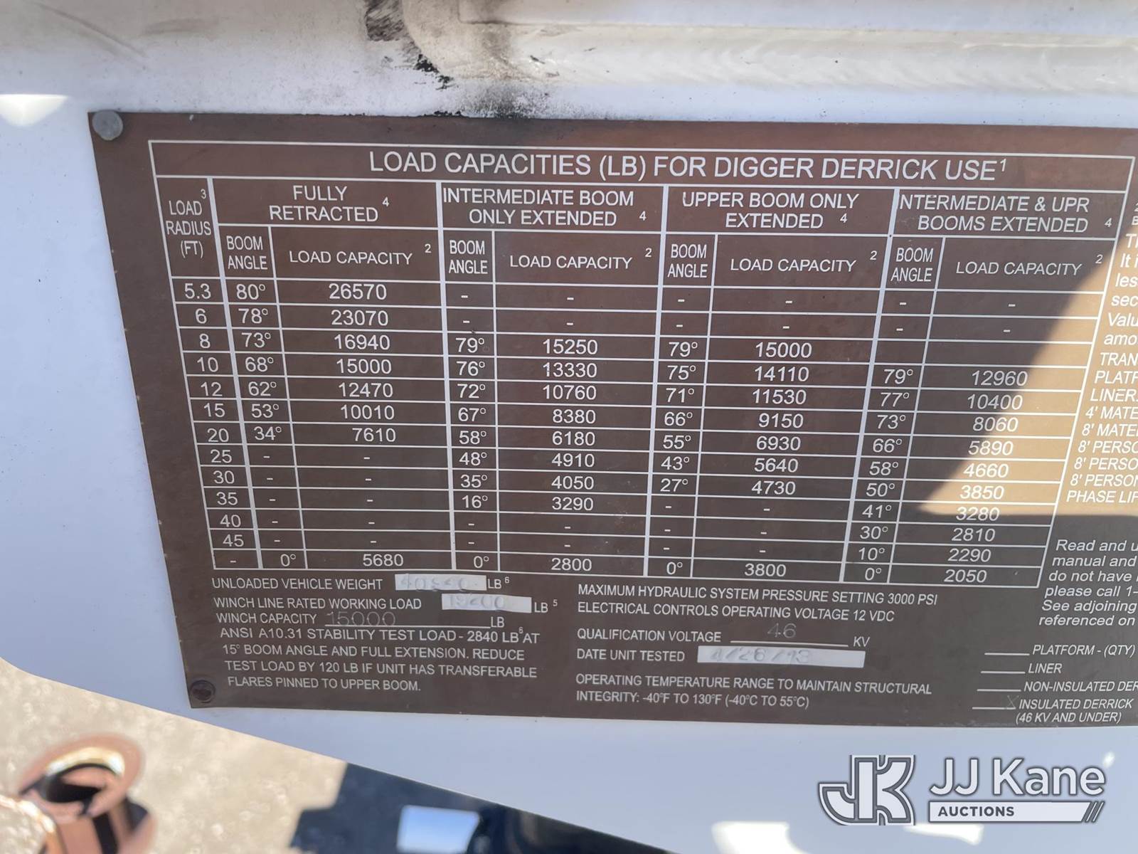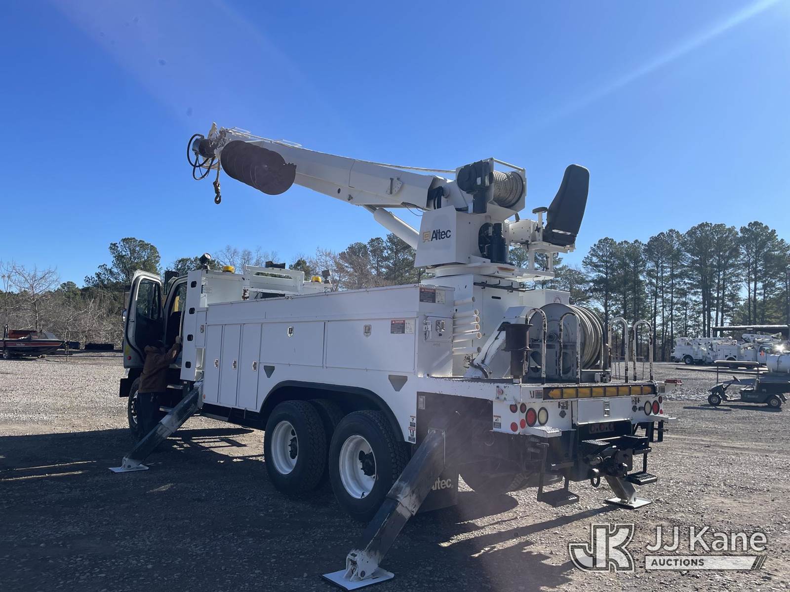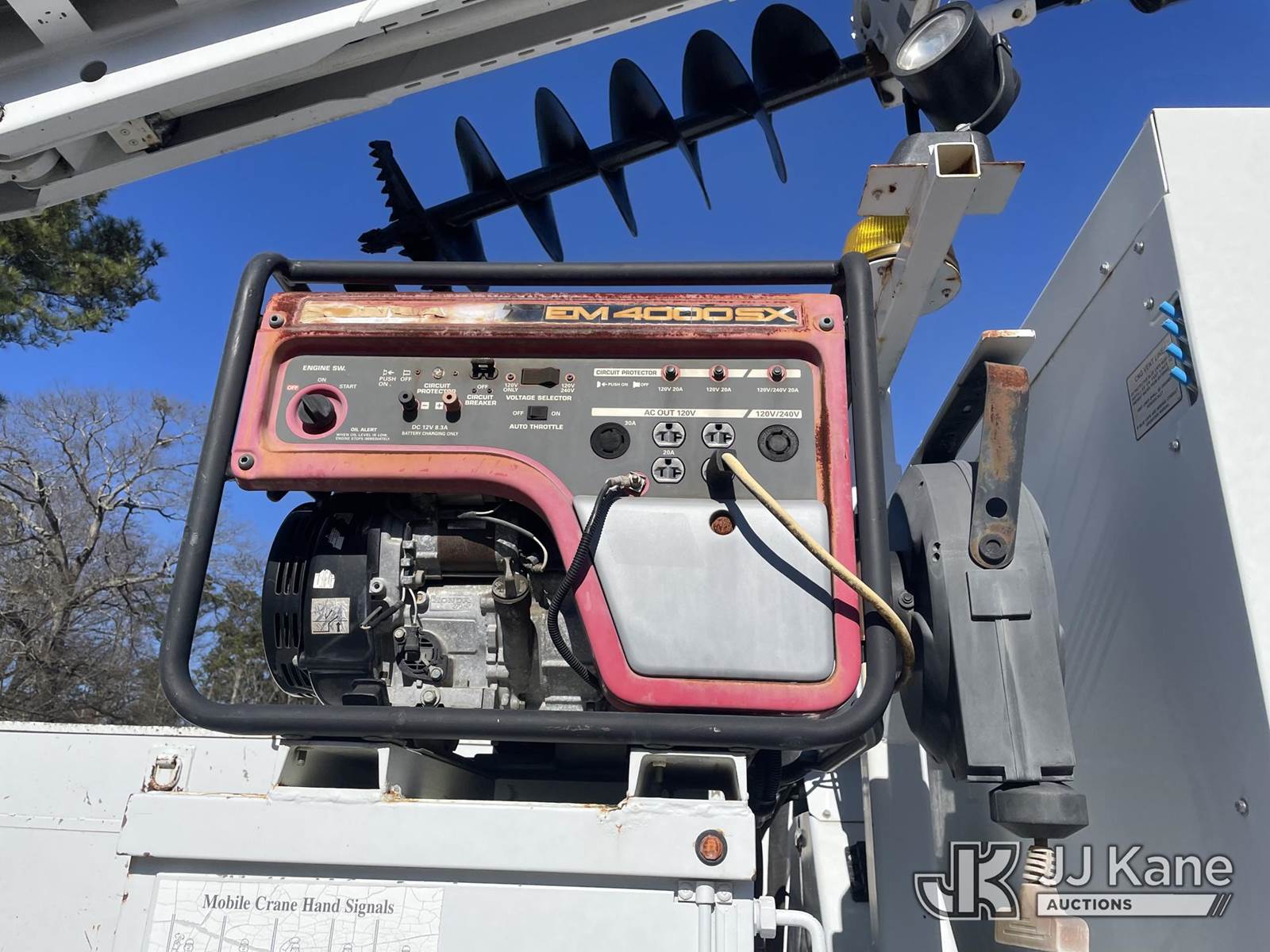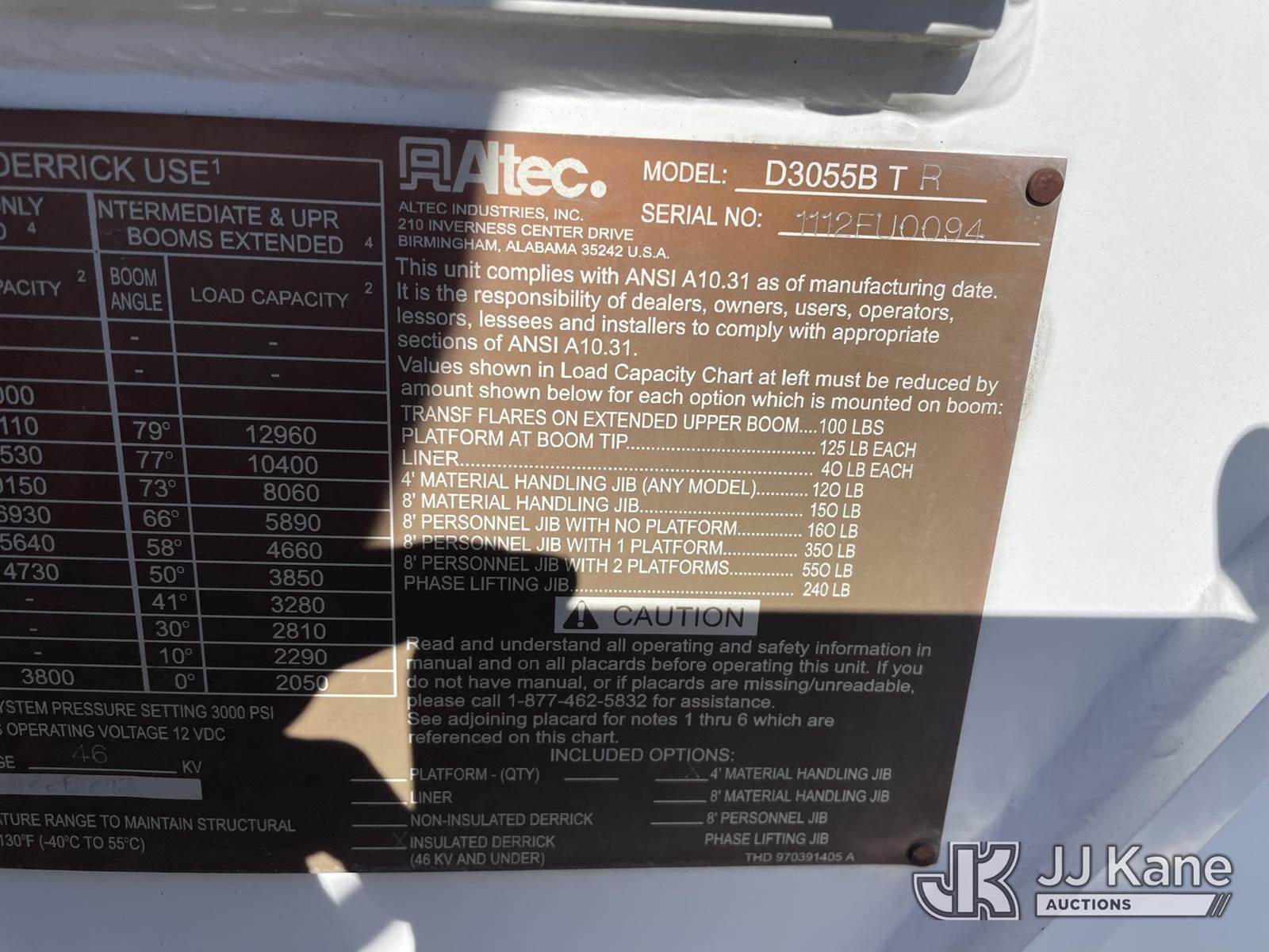 Altec D3055B-TR, 26,570 Lb Digger Derrick s/n 1112EU10094, with 55ft sheave height, 2spd digger, pole guides, heel winch & riding console, rear mounted on 2013 Freightliner 114SD T/A Utility Truck, 8.9L CNG, Auto, 6X4, A/C, with Honda EM4000SX generator, backup camera, (32,683 miles) (Runs, Moves & Upper Operates) This is a Titled Item NOTE: This unit is being sold AS IS/WHERE IS via Timed Auction and is located in Graysville, AL. For more information & removal arrangements please contact Jarrod Bains @ jarrod.bains@jjkane.com. Alabama Auctioneer Michael Whitebread - License # 5592 (Missing manuals, See Auction Company for Manufacturers Information to obtain manuals) (Buyer is responsible for removal. Assistance by consignor or JJ Kane Auctions is not assured.)
