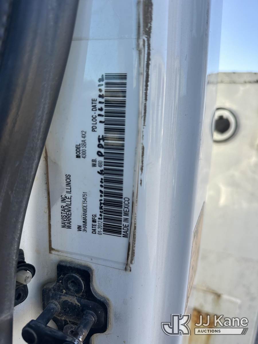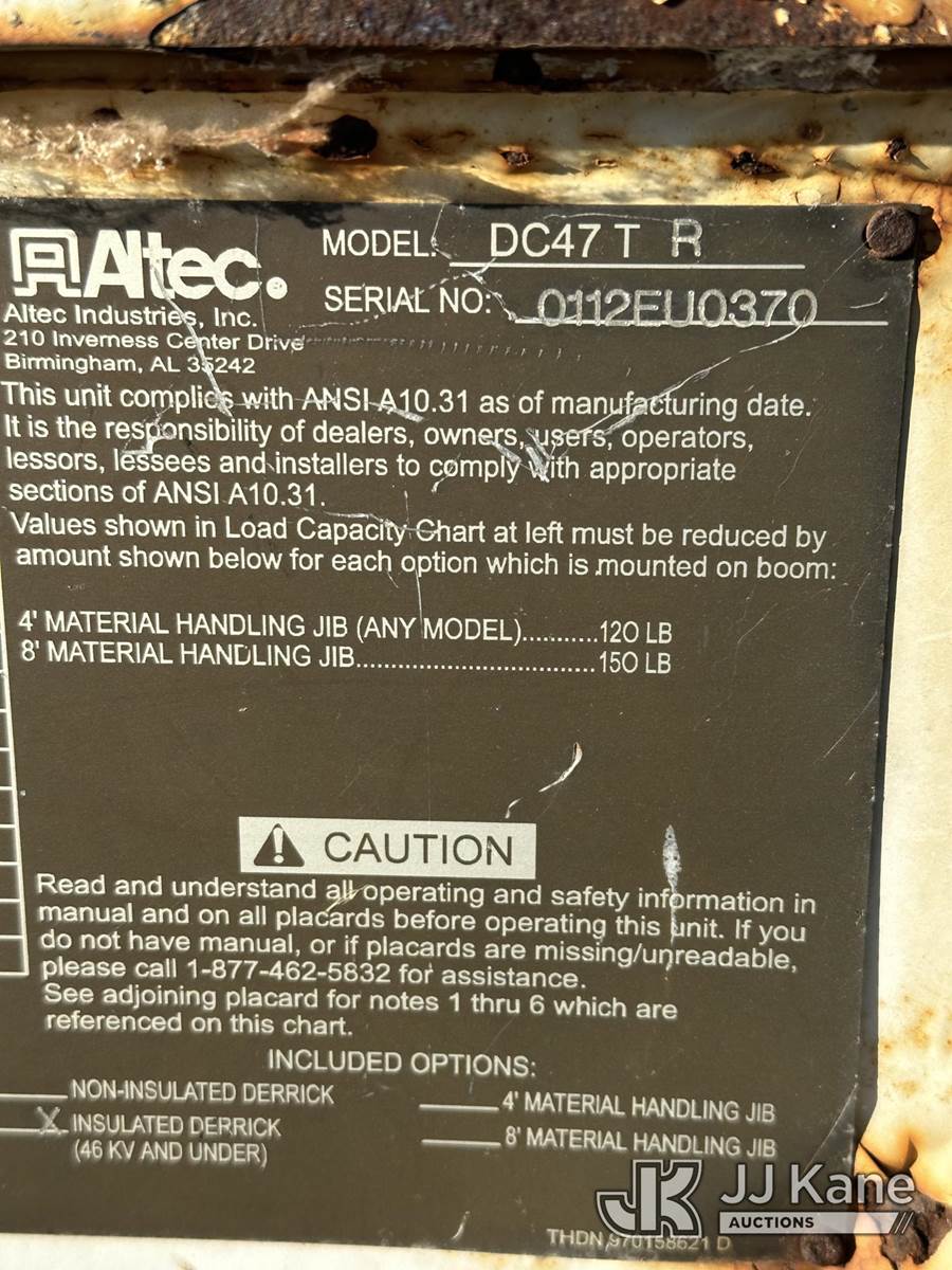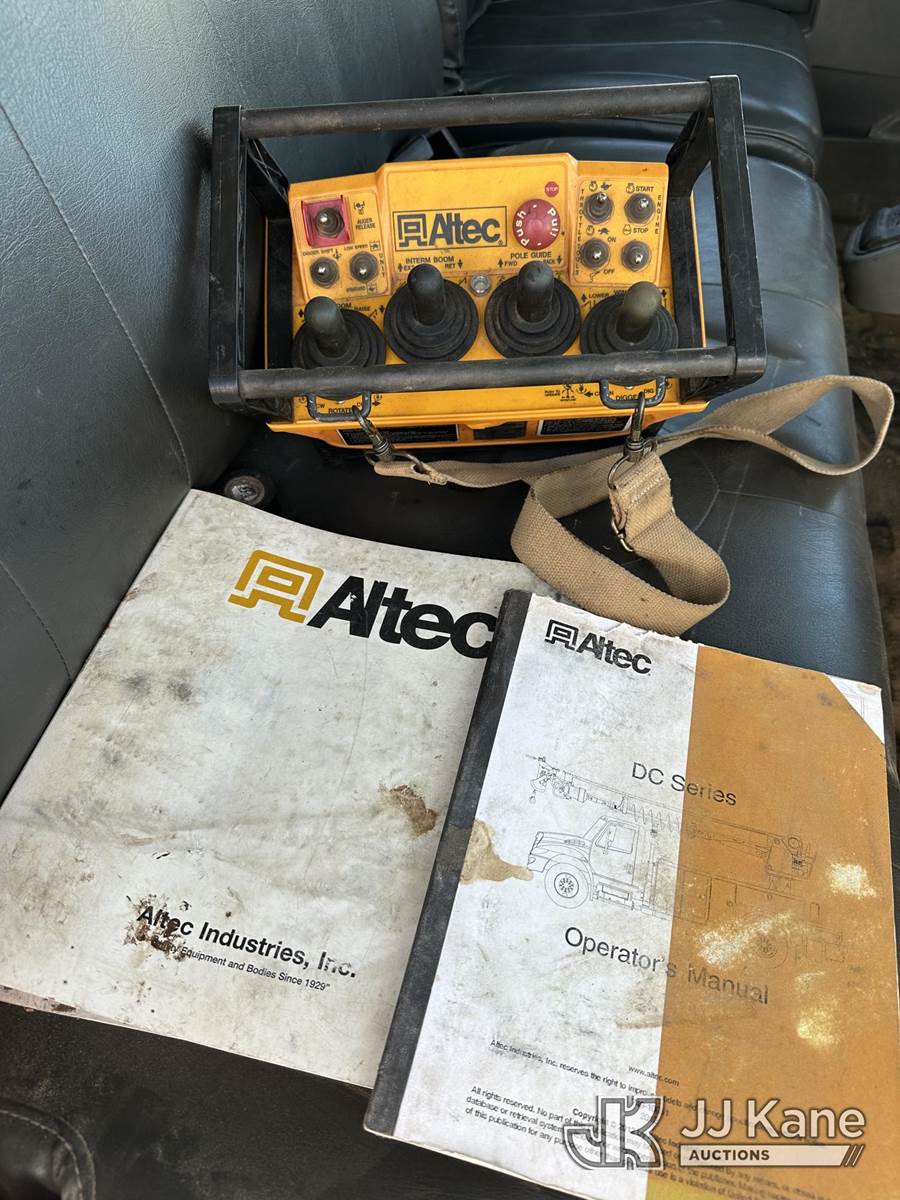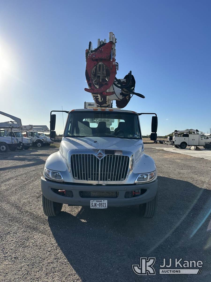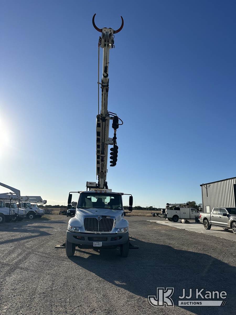 Altec DC47-TR, 23,790 Lb Digger Derrick s/n 0112EU0370, with 47 ft. sheave height, 3 section hyd boom, 2 spd digger, heel winch, pole grabs, remote, riding console & 4 hyd outriggers, rear mounted on 2013 International DuraStar 4300 Utility Truck, MaxxForce diesel, 4X2, Auto, A/C, (114,883 miles) (Runs. Moves. Upper Operates) This is a Titled Item NOTE: This unit is being sold AS IS/WHERE IS via Timed Auction and is located in Corpus Christi, TX. For more information & removal arrangements please contact David Lange @ 817-602-1241. (Manuals provided in cab) (Buyer is responsible for removal. Assistance by consignor or JJ Kane Auctions is not assured.)