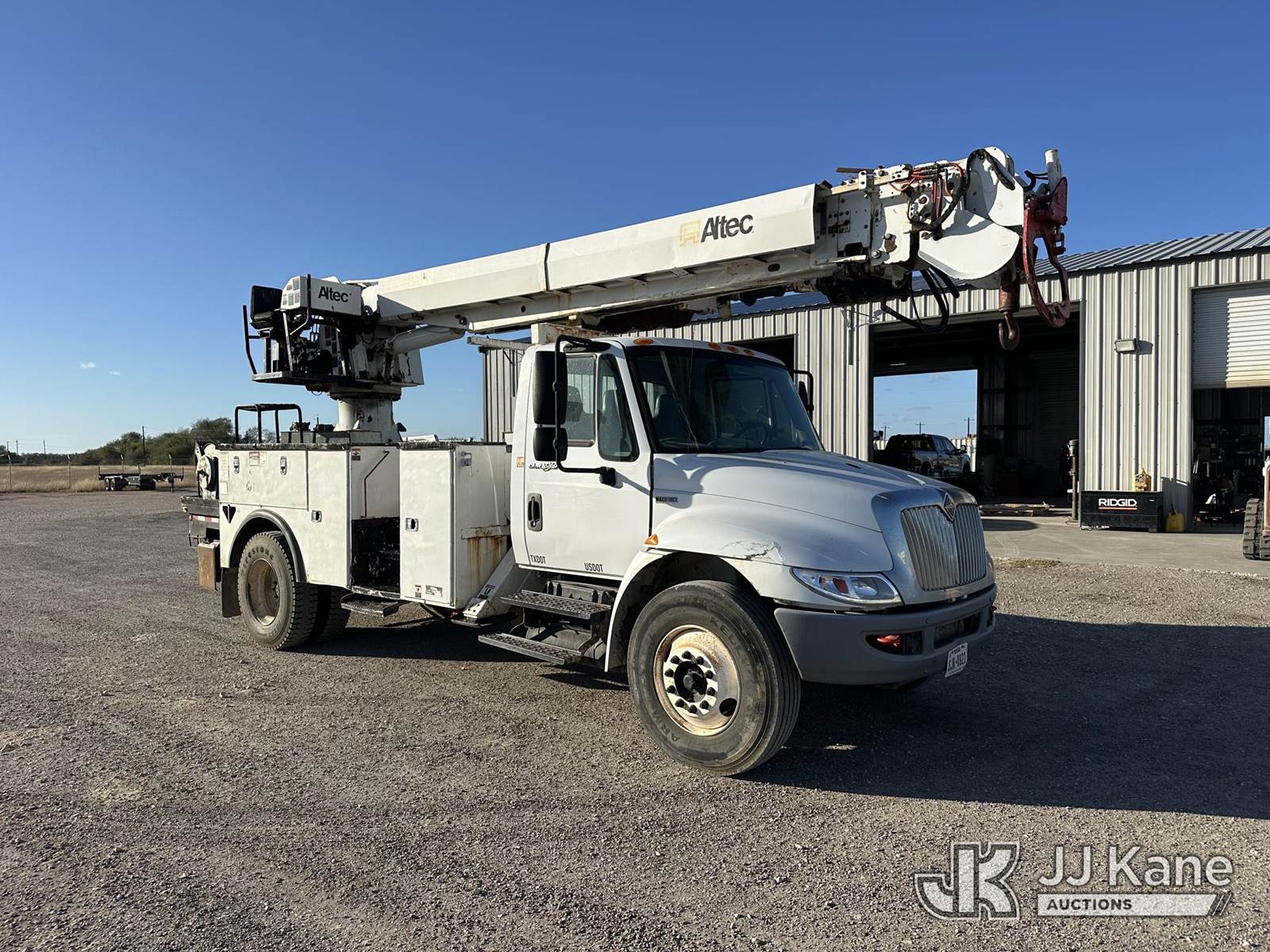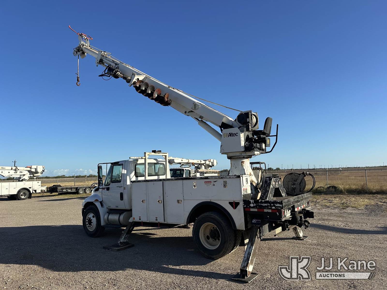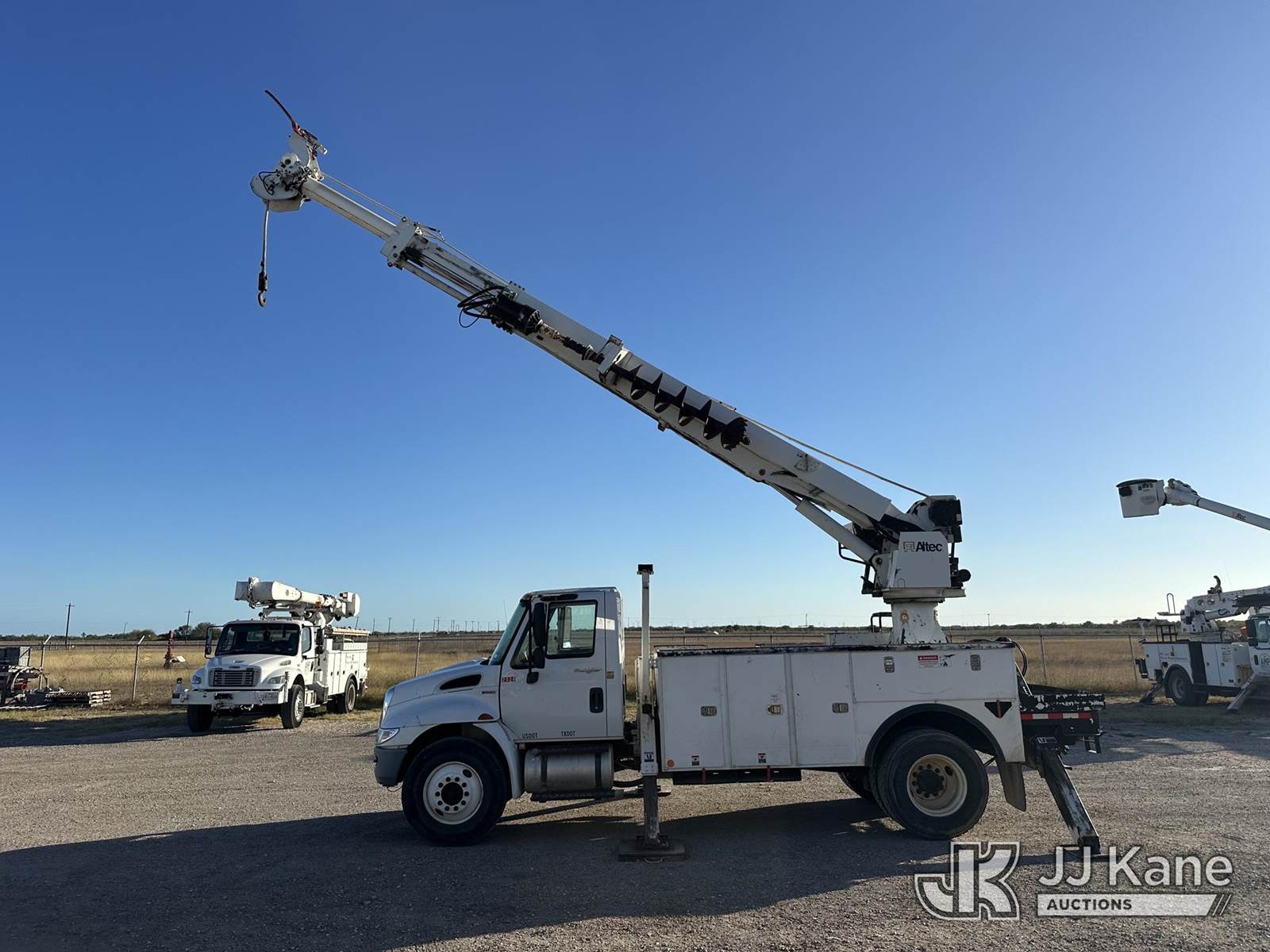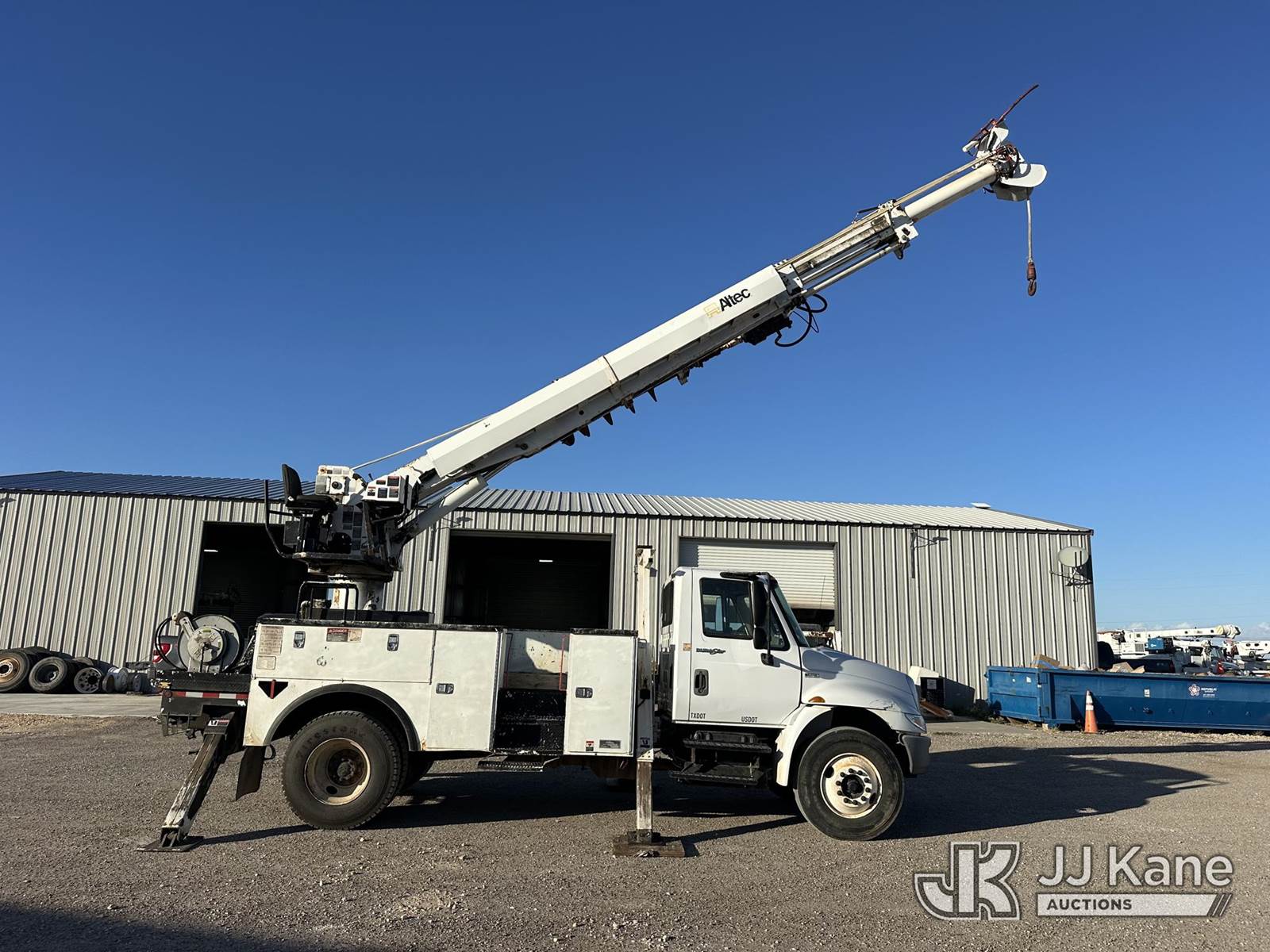 Altec DC47-TR, 23,790 Lb Digger Derrick s/n 0112EU0370, with 47 ft. sheave height, 3 section hyd boom, 2 spd digger, heel winch, pole grabs, remote, riding console & 4 hyd outriggers, rear mounted on 2013 International DuraStar 4300 Utility Truck, MaxxForce diesel, 4X2, Auto, A/C, (114,883 miles) (Runs. Moves. Upper Operates) This is a Titled Item NOTE: This unit is being sold AS IS/WHERE IS via Timed Auction and is located in Corpus Christi, TX. For more information & removal arrangements please contact David Lange @ 817-602-1241. (Manuals provided in cab) (Buyer is responsible for removal. Assistance by consignor or JJ Kane Auctions is not assured.)