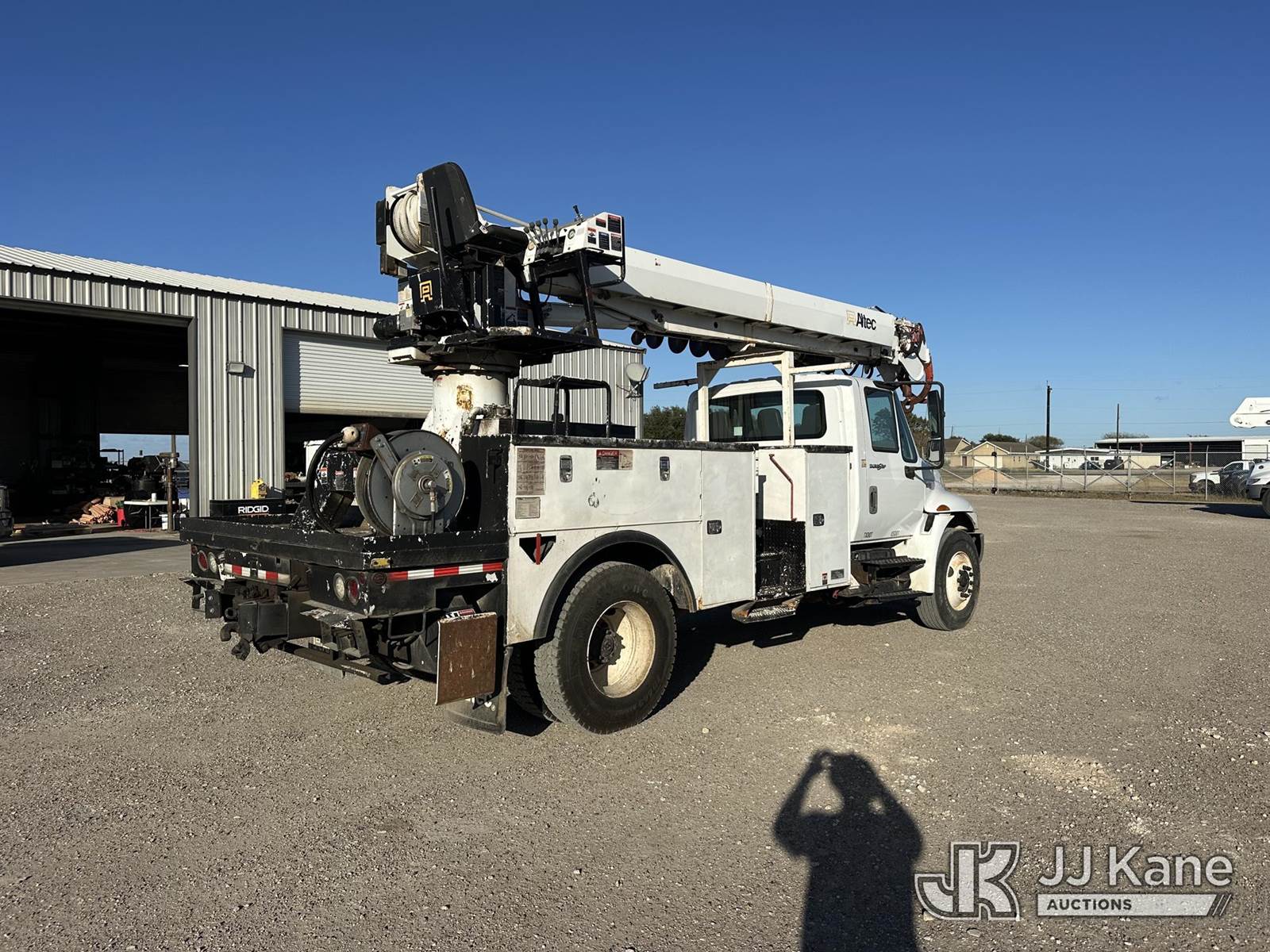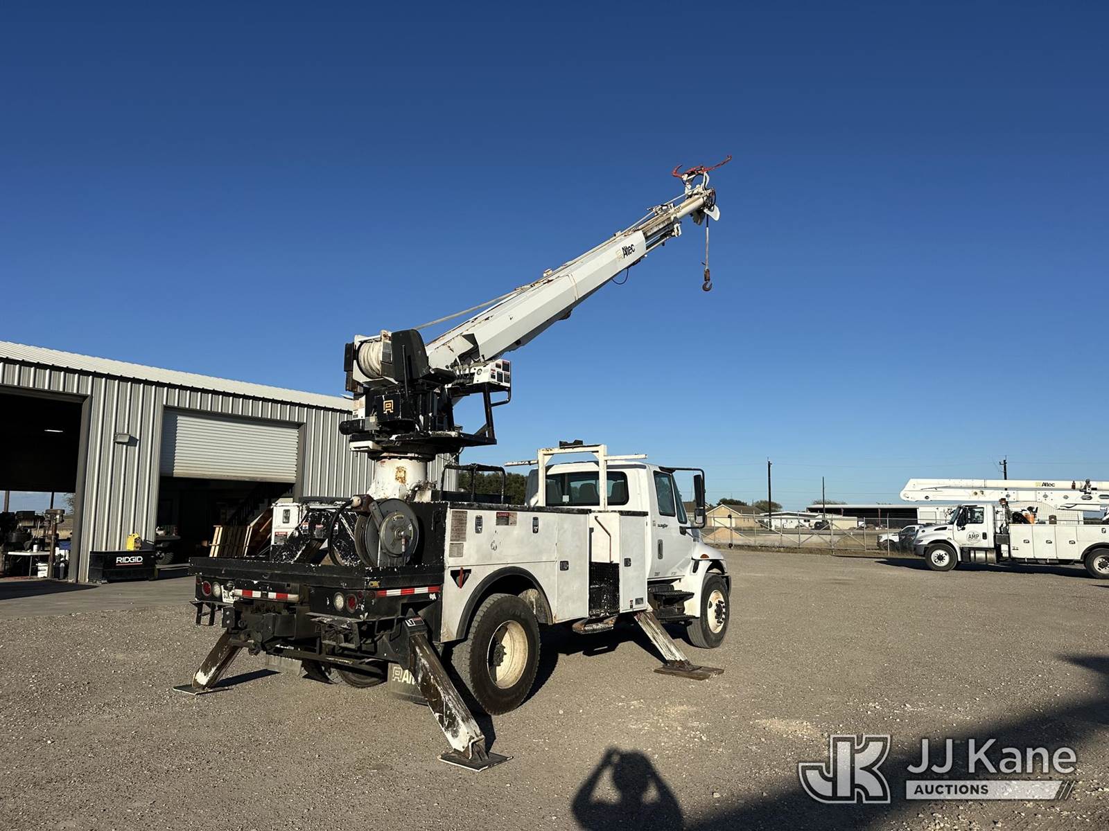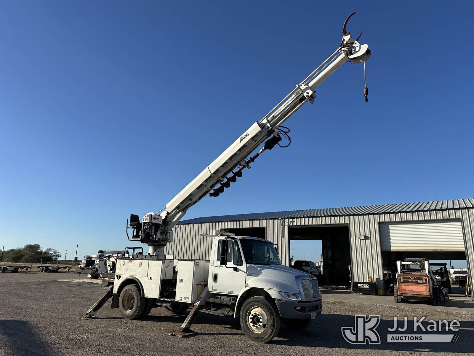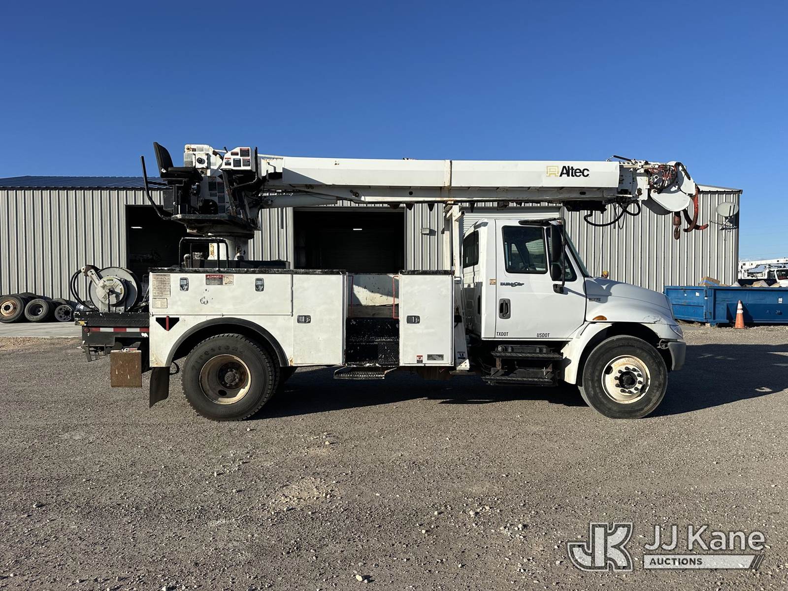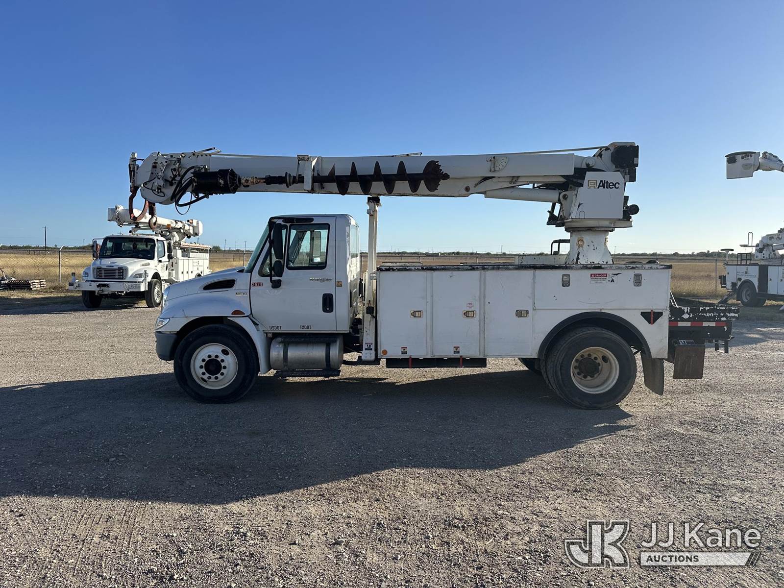 Altec DC47-TR, 23,790 Lb Digger Derrick s/n 0112EU0370, with 47 ft. sheave height, 3 section hyd boom, 2 spd digger, heel winch, pole grabs, remote, riding console & 4 hyd outriggers, rear mounted on 2013 International DuraStar 4300 Utility Truck, MaxxForce diesel, 4X2, Auto, A/C, (114,883 miles) (Runs. Moves. Upper Operates) This is a Titled Item NOTE: This unit is being sold AS IS/WHERE IS via Timed Auction and is located in Corpus Christi, TX. For more information & removal arrangements please contact David Lange @ 817-602-1241. (Manuals provided in cab) (Buyer is responsible for removal. Assistance by consignor or JJ Kane Auctions is not assured.)