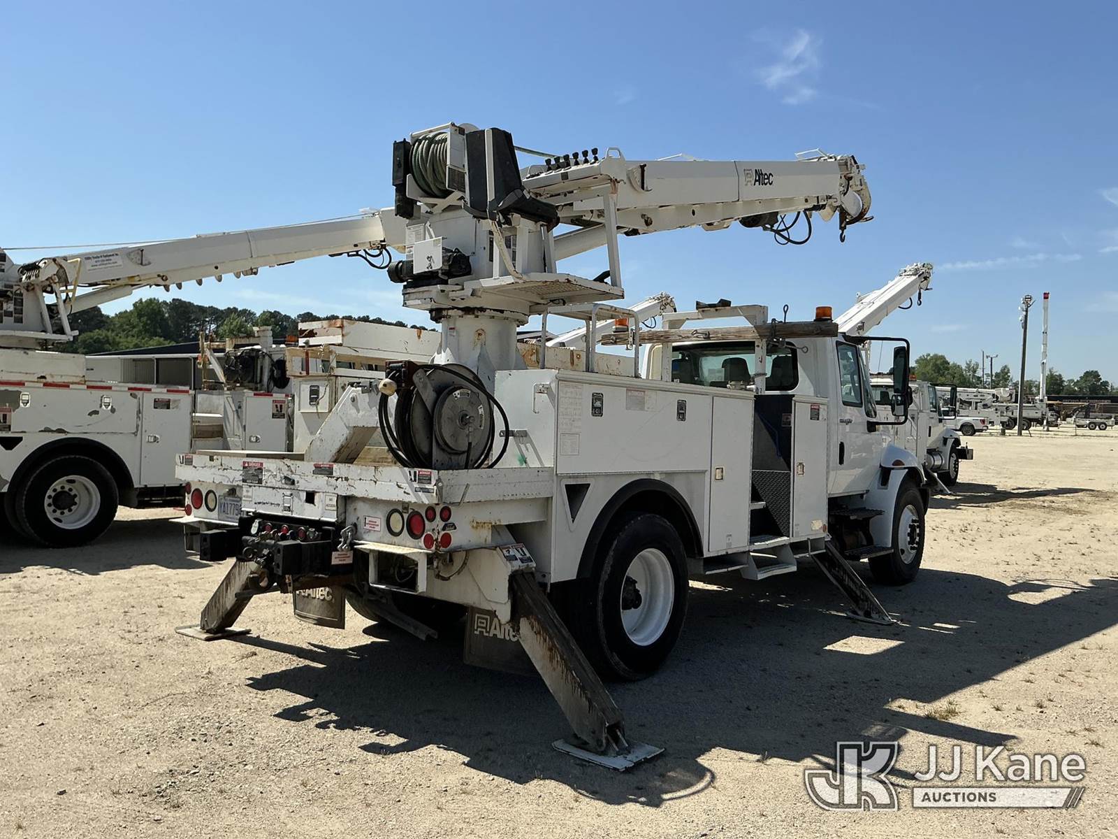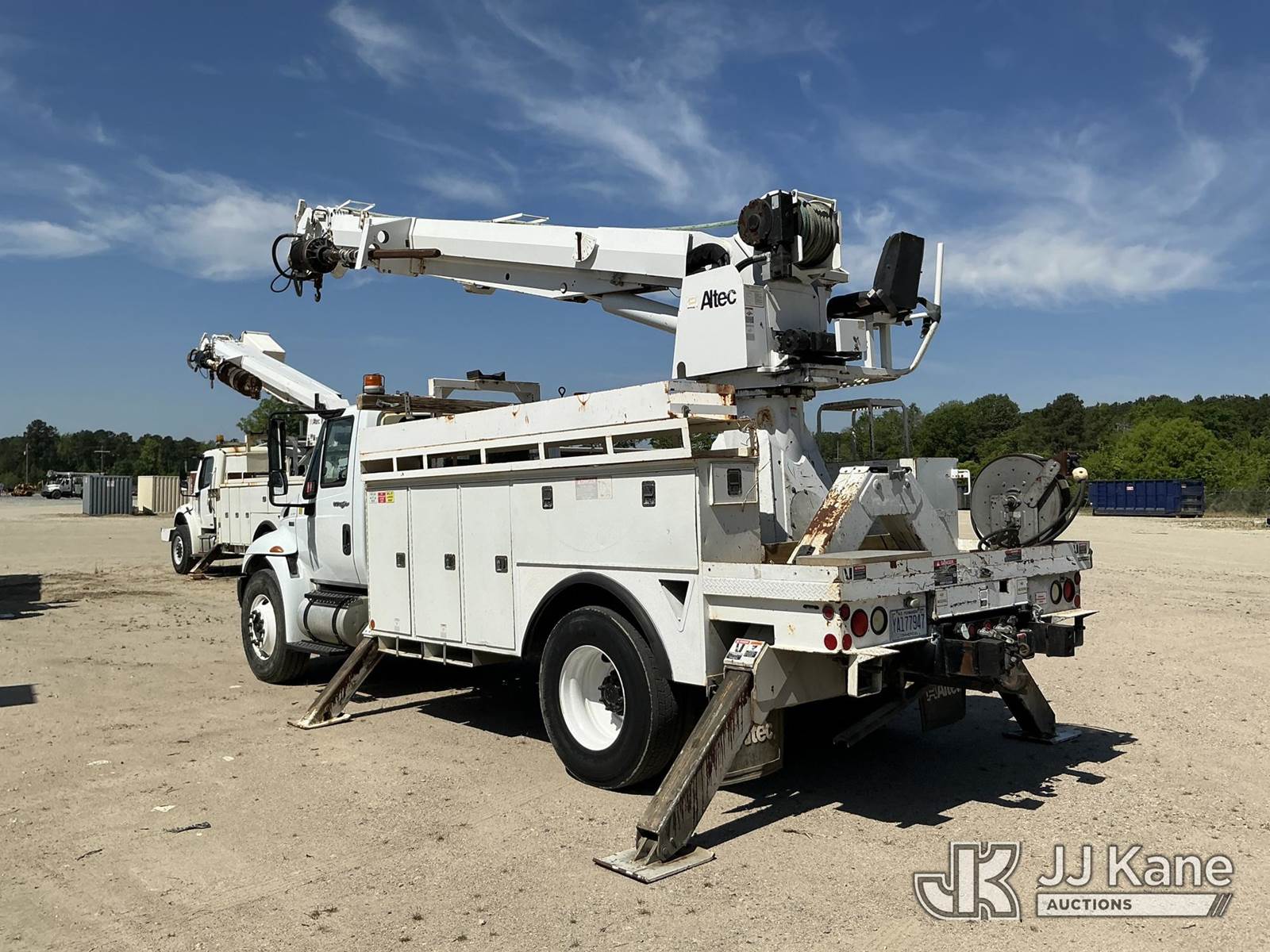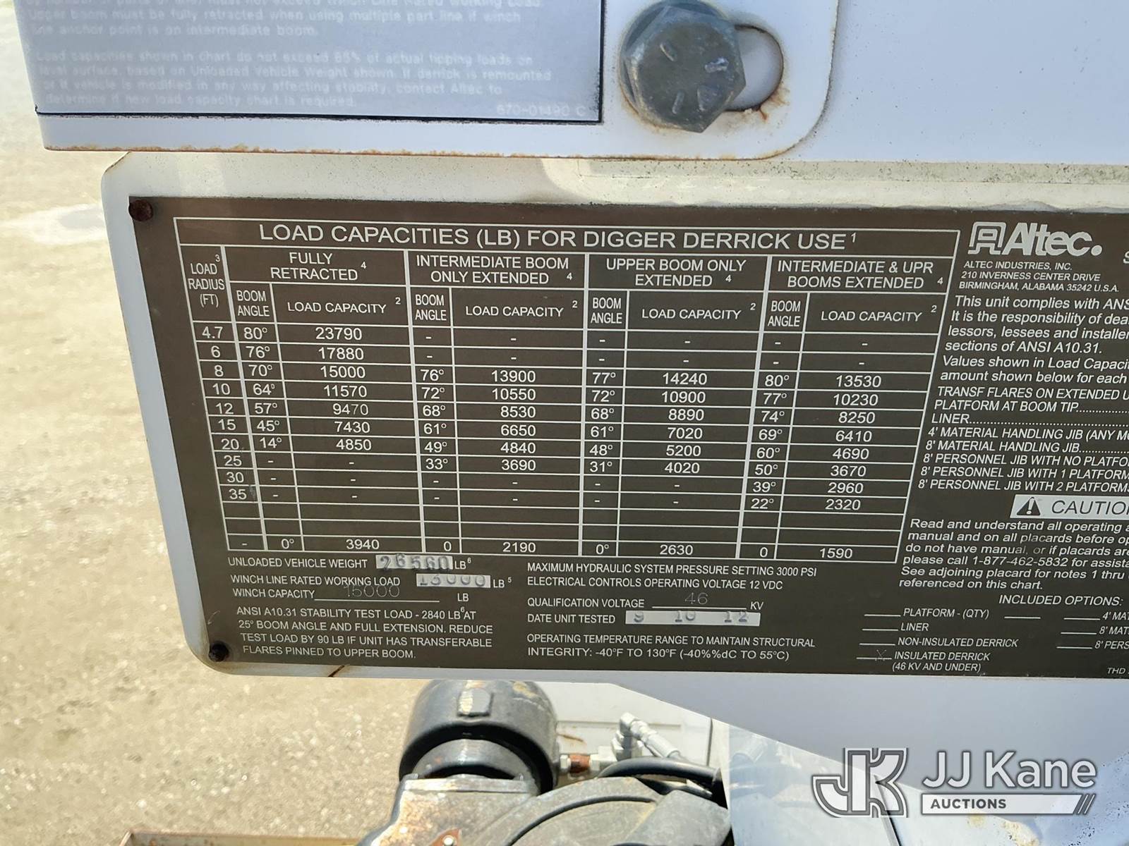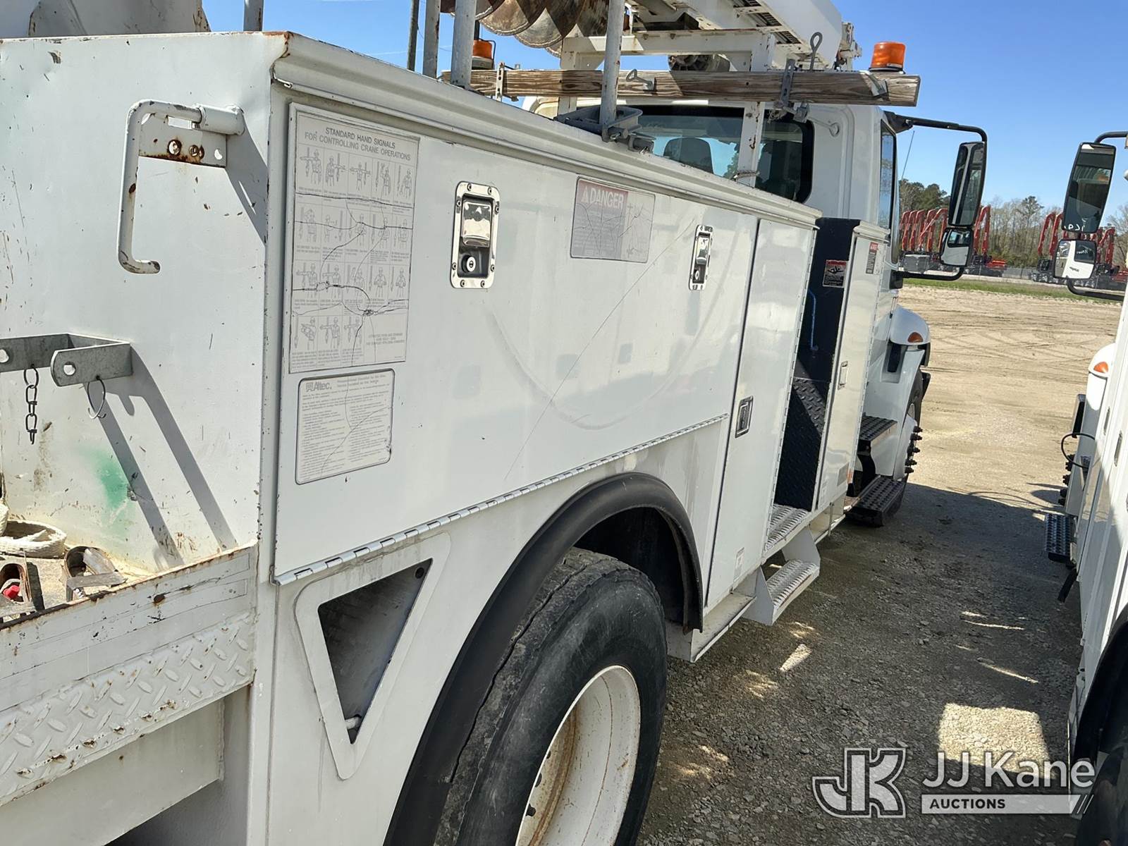 Altec DM47B-TR, 23,790 Lb Digger Derrick s/n 0812FR0261, with 47 ft, sheave height, 3 section hydraulic boom, 2 spd digger, pole grabs, heel winch, riding console & 4 hydraulic outriggers, rear mounted on 2013 International 4300 Utility Truck, MaxxForce 7.6L diesel, Auto, A/C, (97,445 miles) (Runs, Moves, Upper Operates) This is a Titled Item NOTE: This unit is being sold AS IS/WHERE IS via Timed Auction and is located in Fayetteville, NC. For more information & removal arrangements please contact Pete Klimek @ 843-323-6538. (Manuals provided in cab) (Buyer is responsible for removal. Assistance by consignor or JJ Kane Auctions is not assured.)