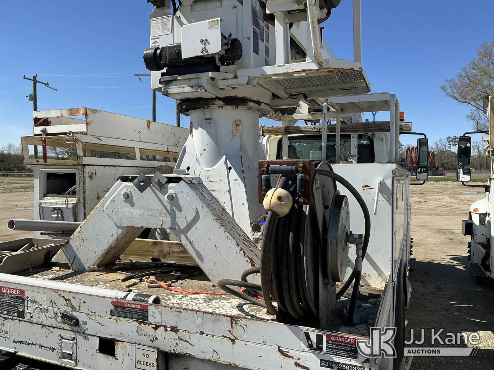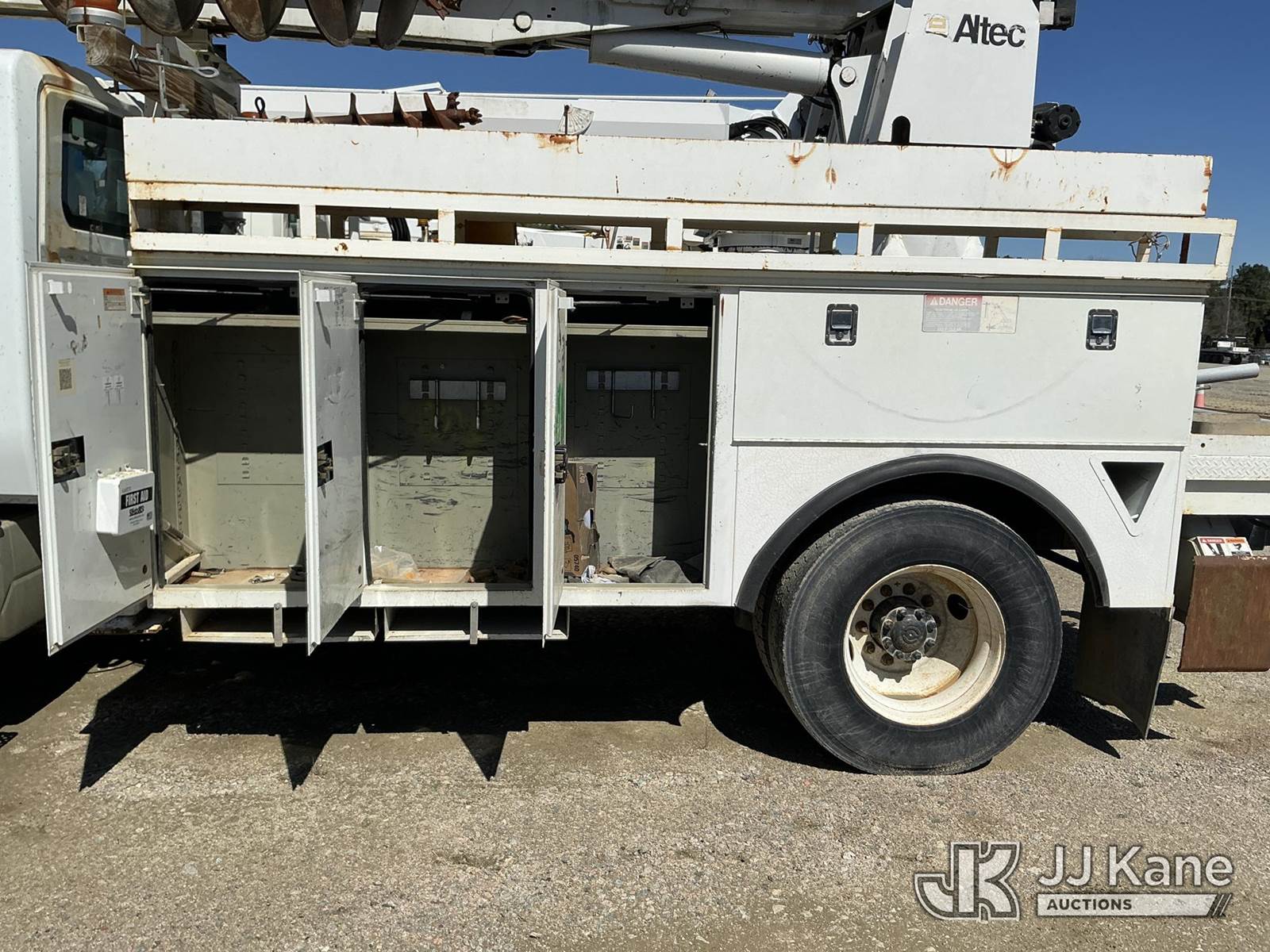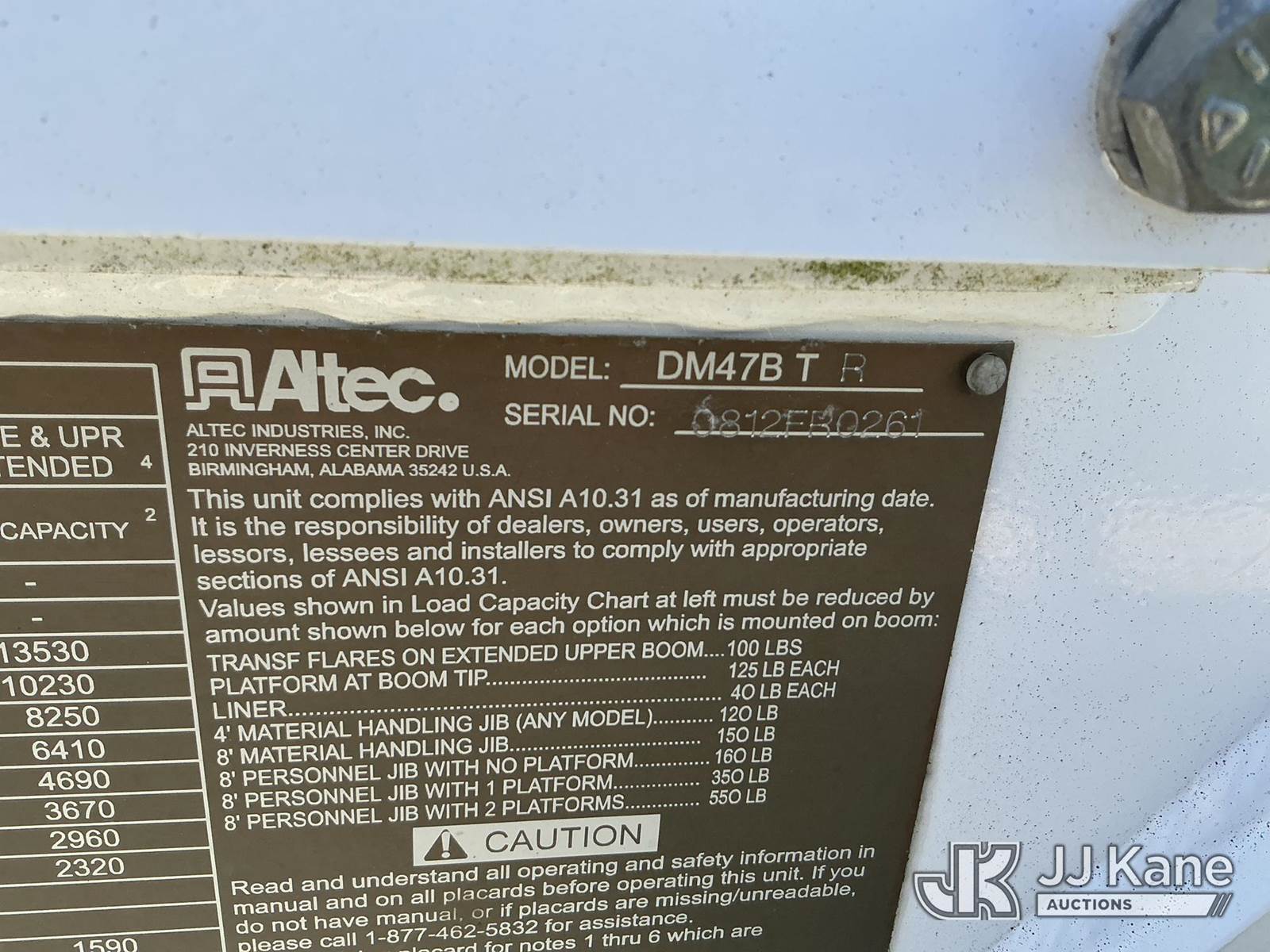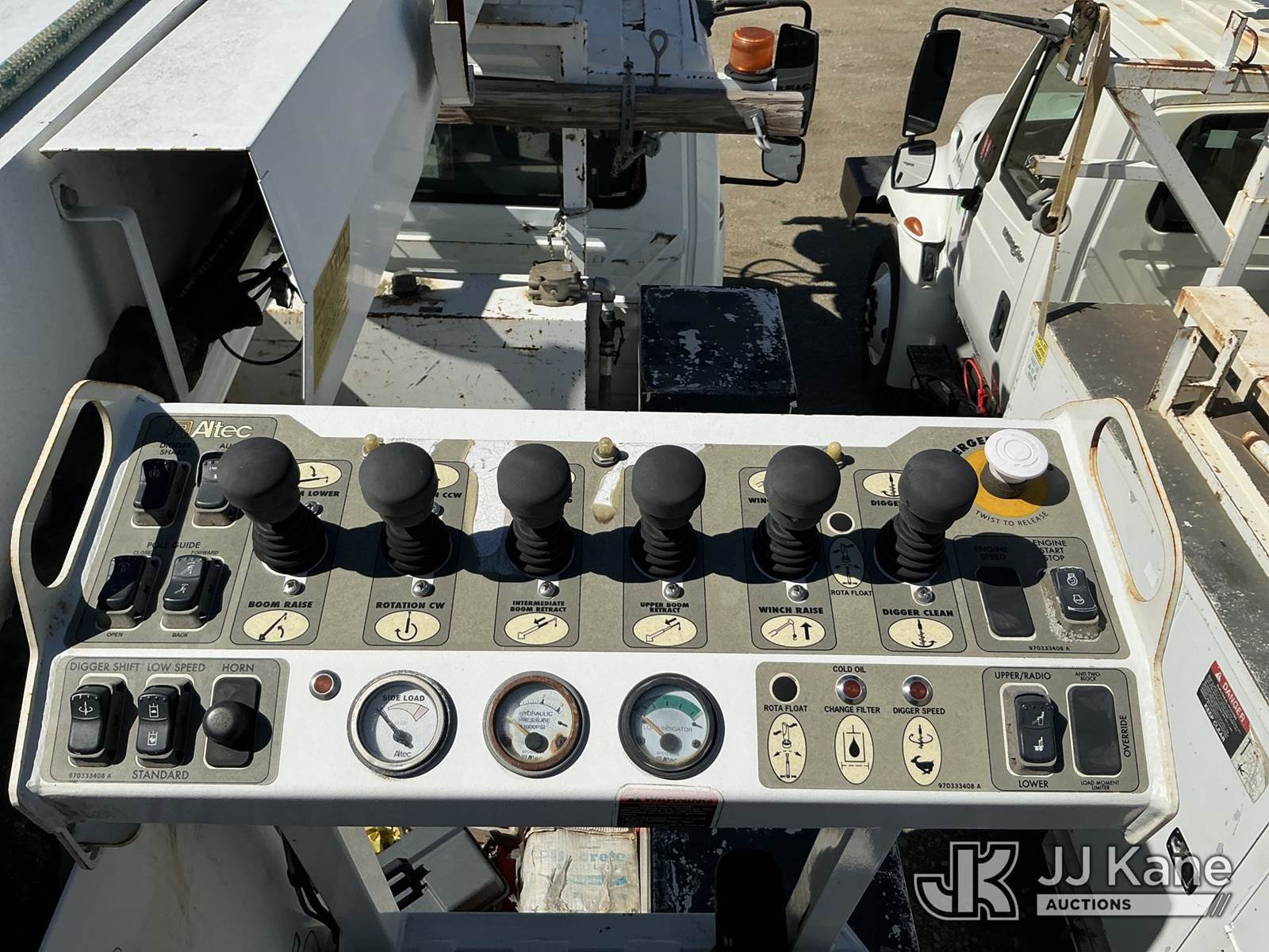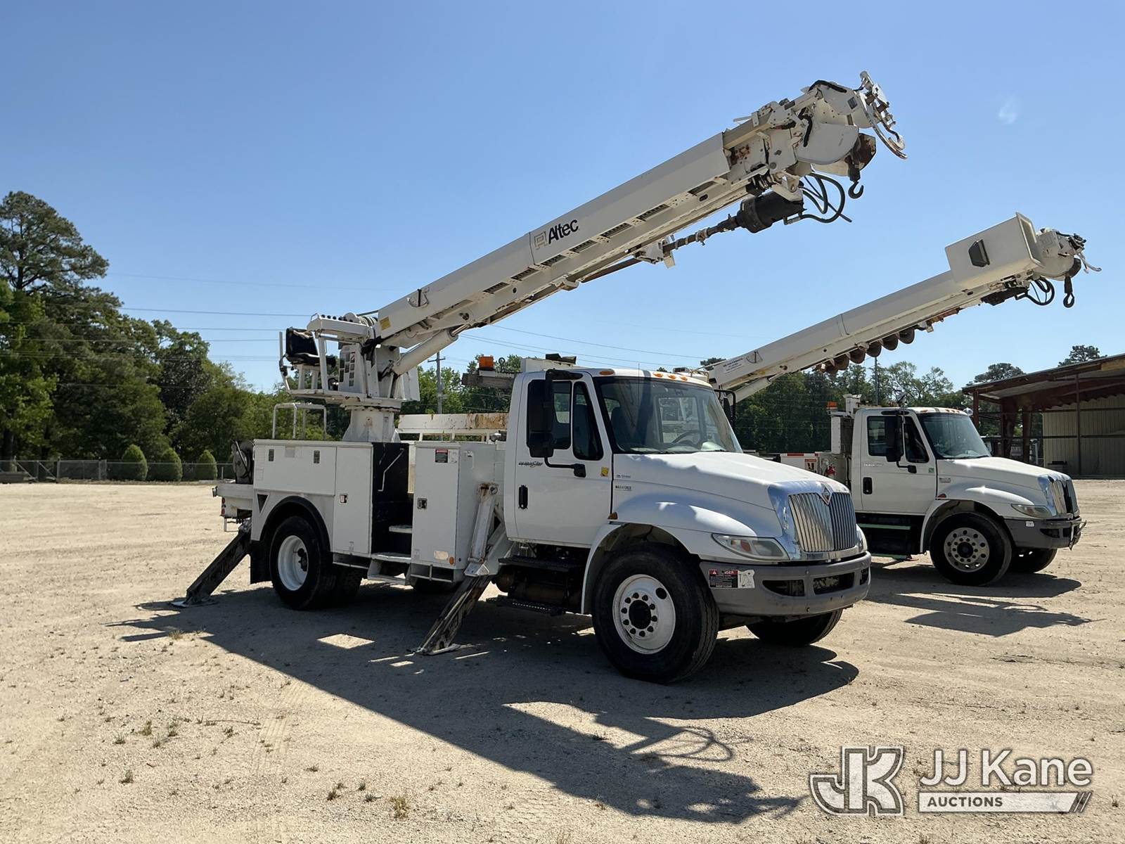 Altec DM47B-TR, 23,790 Lb Digger Derrick s/n 0812FR0261, with 47 ft, sheave height, 3 section hydraulic boom, 2 spd digger, pole grabs, heel winch, riding console & 4 hydraulic outriggers, rear mounted on 2013 International 4300 Utility Truck, MaxxForce 7.6L diesel, Auto, A/C, (97,445 miles) (Runs, Moves, Upper Operates) This is a Titled Item NOTE: This unit is being sold AS IS/WHERE IS via Timed Auction and is located in Fayetteville, NC. For more information & removal arrangements please contact Pete Klimek @ 843-323-6538. (Manuals provided in cab) (Buyer is responsible for removal. Assistance by consignor or JJ Kane Auctions is not assured.)