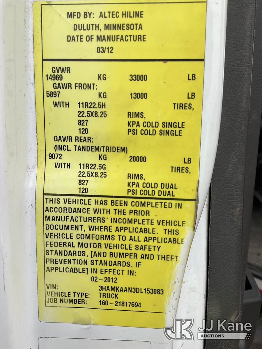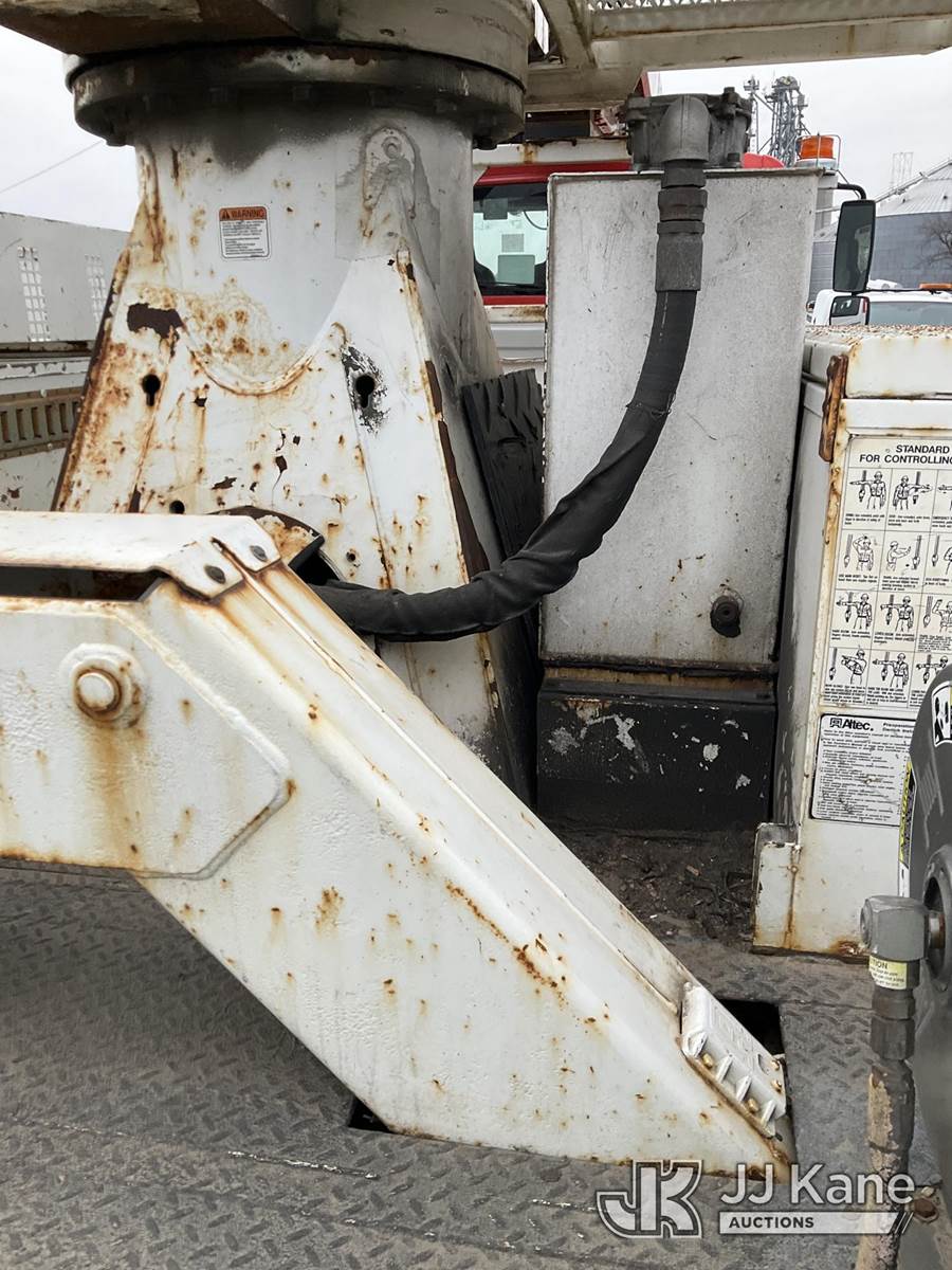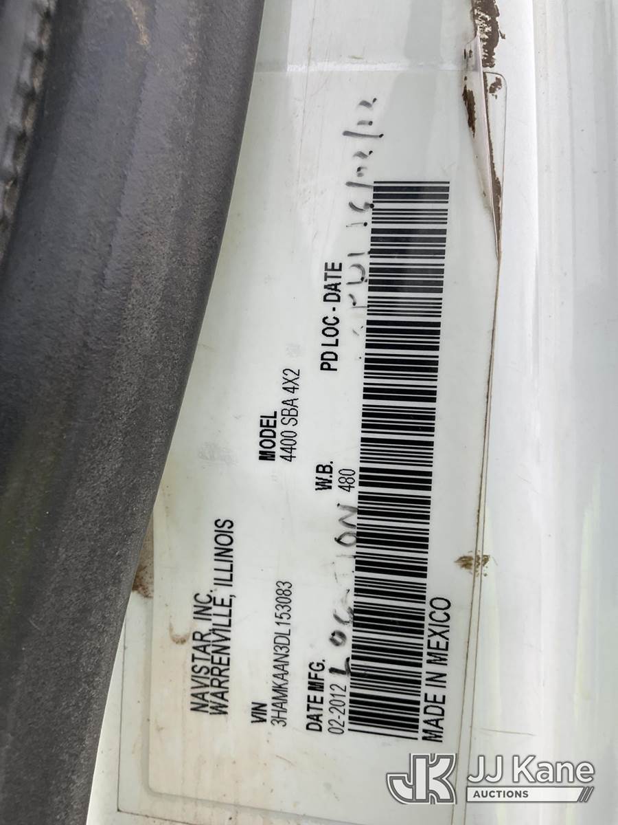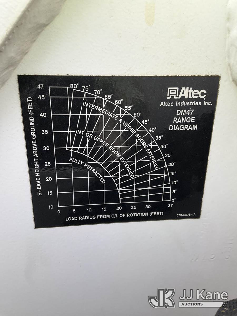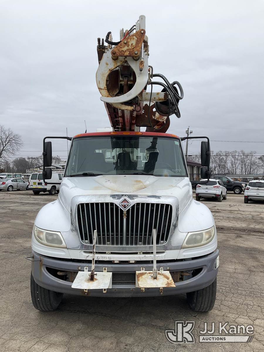 Altec DM47T, 23,790 Lb Digger Derrick s/n 0212DV5587, with 47 ft. sheave height, 3 section hyd boom, 2-spd digger, pole guides, heel winch, wireless remote & riding console, rear mounted on 2013 International DuraStar 4400 Utility Truck, MaxxForce Diesel, 4X2, Auto, A/C, (107,993 miles) (Runs, Moves & Upper Operates)(Damage on Passenger Door, Service Body Rusty)( The manufacturer has notified JJ Kane that this equipment is subject to an open recall. CSN 568 Auger Extension Shaft Hub Inspection CSN 586 Winch Motor Mounting Capscrew Inspection CSN 713A Reinforcement Plate Installation CSN 719 Slope Indicator Modification The equipment should not be operated until this is addressed. Buyer is responsible for reviewing the recall notice and contacting the manufacturer to schedule the recommended corrective actions. Associated costs may be covered by the manufacturer in some cases.) (Reads 10,395 hours) This is a Titled Item NOTE: This unit is being sold AS IS/WHERE IS via Timed Auction and is located in South Beloit, IL. Inspection & preview days for this unit are the 2 business days prior to the first day of items closing for this auction, item is located at 14354 Dearborn Ave South Beloit, IL and hours of operations are 8a-4p. For pre-sale questions, please contact Derek Eklund at (608) 904-0618 or (derek.eklund@jjkane.com). (Manuals provided in cab) (Buyer is responsible for removal. Assistance by consignor or JJ Kane Auctions is not assured.)