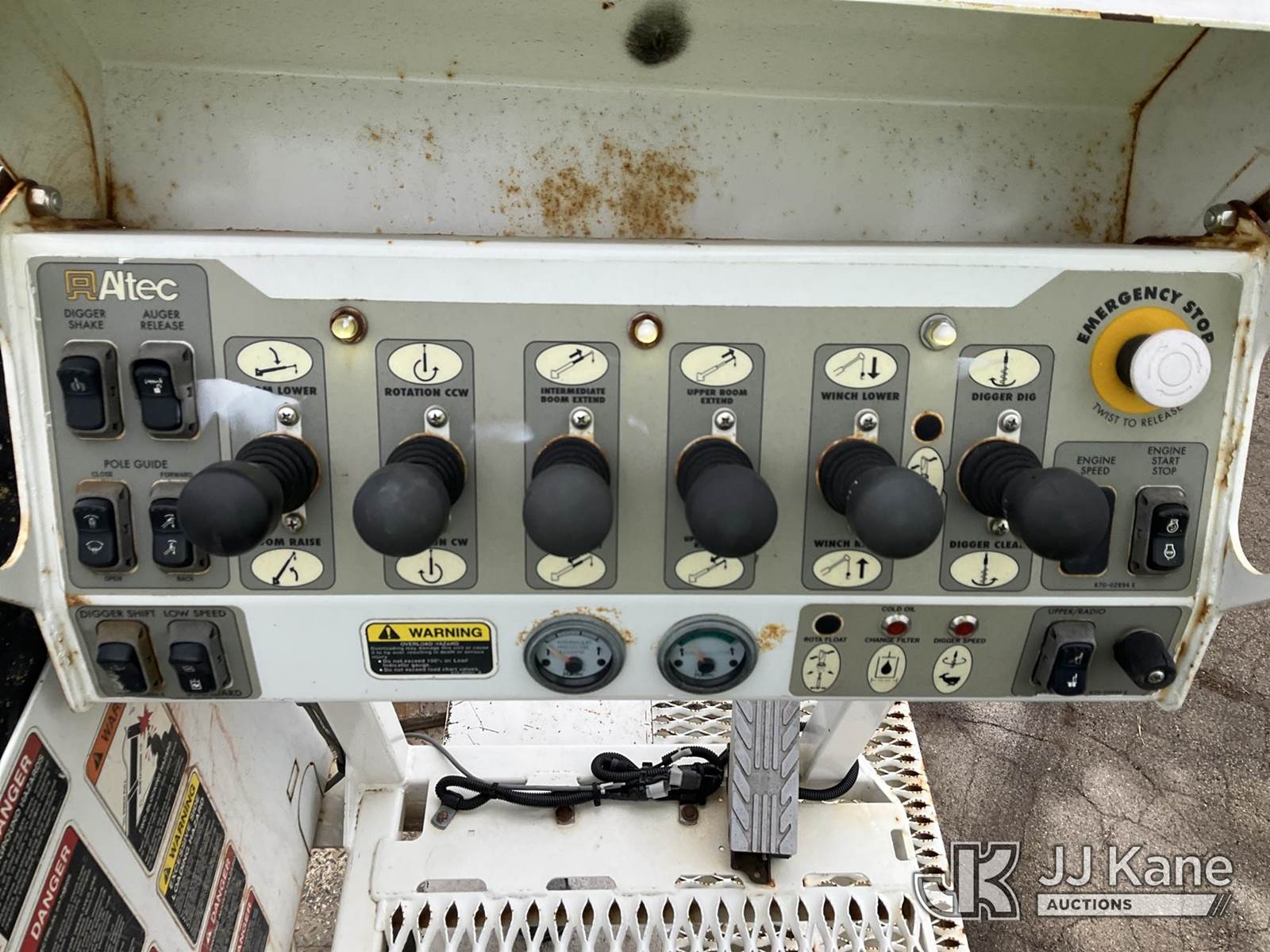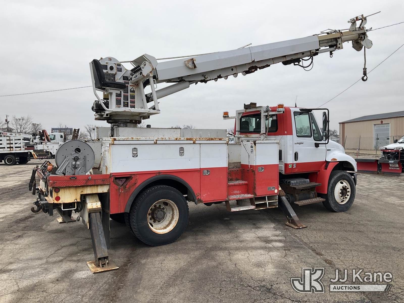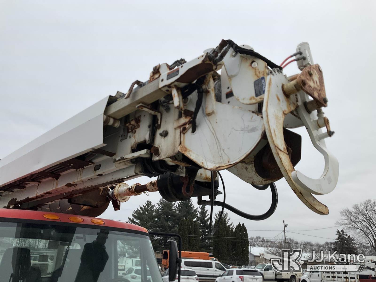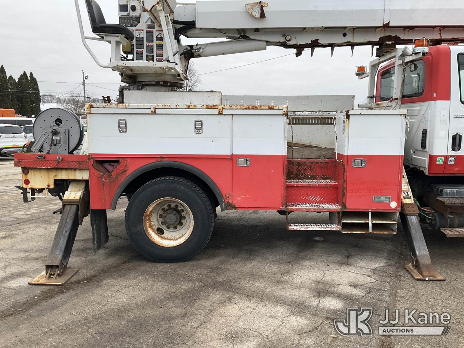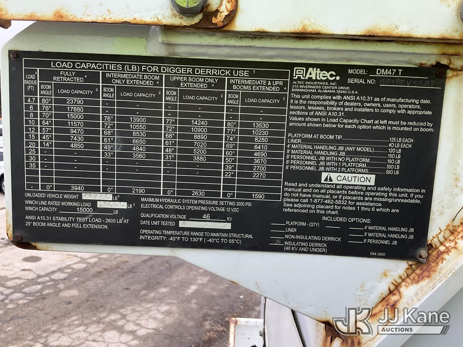 Altec DM47T, 23,790 Lb Digger Derrick s/n 0212DV5587, with 47 ft. sheave height, 3 section hyd boom, 2-spd digger, pole guides, heel winch, wireless remote & riding console, rear mounted on 2013 International DuraStar 4400 Utility Truck, MaxxForce Diesel, 4X2, Auto, A/C, (107,993 miles) (Runs, Moves & Upper Operates)(Damage on Passenger Door, Service Body Rusty)( The manufacturer has notified JJ Kane that this equipment is subject to an open recall. CSN 568 Auger Extension Shaft Hub Inspection CSN 586 Winch Motor Mounting Capscrew Inspection CSN 713A Reinforcement Plate Installation CSN 719 Slope Indicator Modification The equipment should not be operated until this is addressed. Buyer is responsible for reviewing the recall notice and contacting the manufacturer to schedule the recommended corrective actions. Associated costs may be covered by the manufacturer in some cases.) (Reads 10,395 hours) This is a Titled Item NOTE: This unit is being sold AS IS/WHERE IS via Timed Auction and is located in South Beloit, IL. Inspection & preview days for this unit are the 2 business days prior to the first day of items closing for this auction, item is located at 14354 Dearborn Ave South Beloit, IL and hours of operations are 8a-4p. For pre-sale questions, please contact Derek Eklund at (608) 904-0618 or (derek.eklund@jjkane.com). (Manuals provided in cab) (Buyer is responsible for removal. Assistance by consignor or JJ Kane Auctions is not assured.)