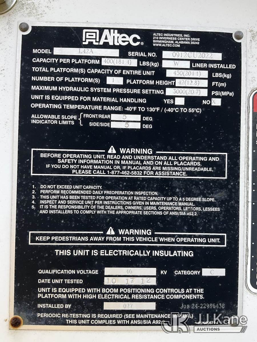Altec L42, 47 ft, Over-Center Bucket Truck s/n 0912CU2022, with single-man bucket, center mounted on 2013 Freightliner M2 106 Utility Truck, 6.7L L6 diesel, 4X2, Auto, A/C, (162,323 miles) (Duke Unit) (Runs, Moves, Upper Operates) This is a Titled Item NOTE: This unit is being sold AS IS/WHERE IS via Timed Auction and is located in Ocala, FL. Inspection & preview days for this unit are by appointment only; please contact us at contact@jjkane.com or 84-Go-JJKane for more details. For more information & removal arrangements please contact Mike Lessard @ (352) 629-6677. (Manuals provided in cab) (Buyer is responsible for removal. Assistance by consignor or JJ Kane Auctions is not assured.)