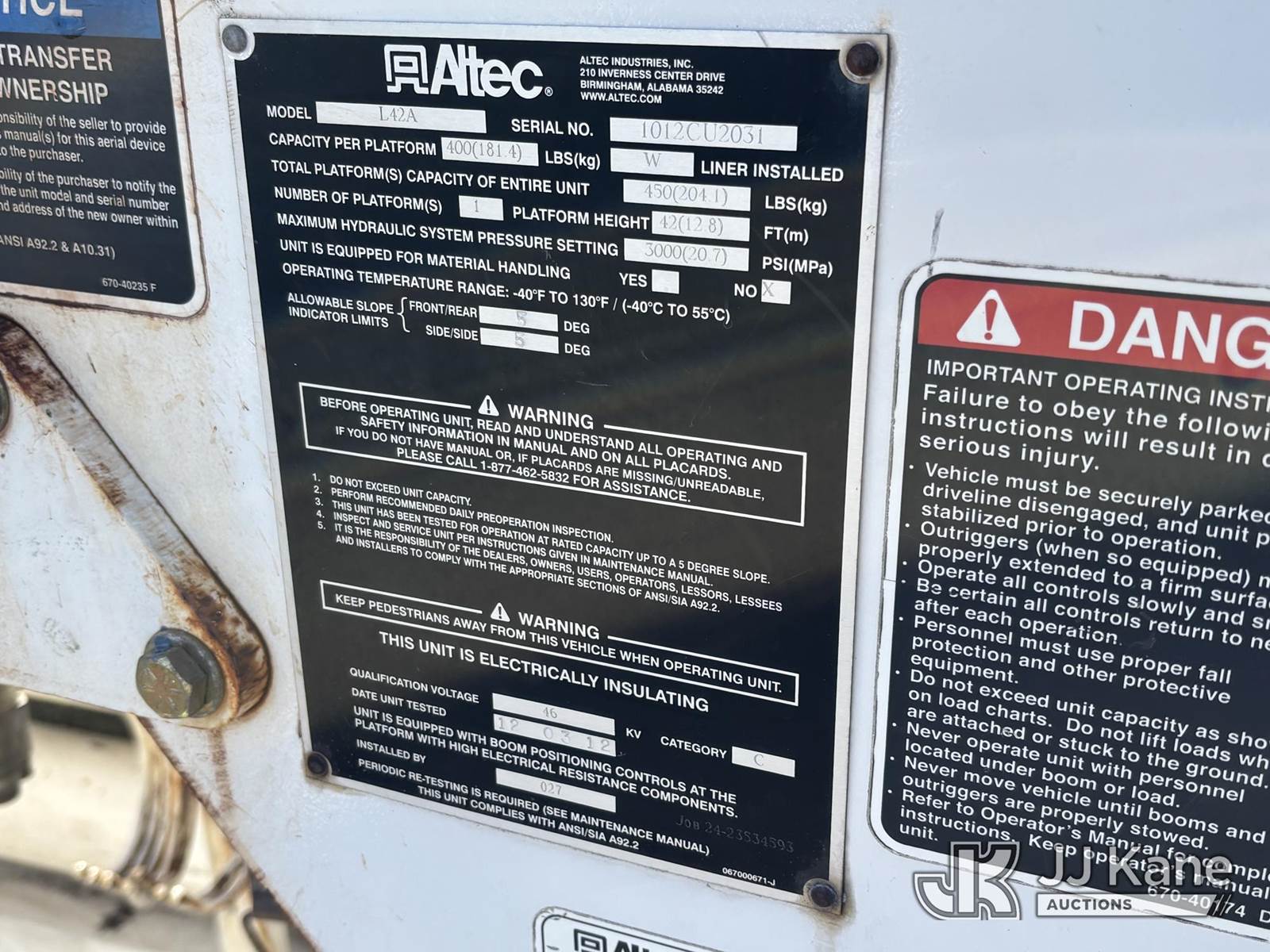 Altec L42A, 47 ft, Over-Center Bucket Truck s/n 1012CU2031, with single-man bucket, center mounted on 2013 Freightliner M2 106 Utility Truck, 6.7L Auto, diesel, A/C, (134,361 miles) (Runs Moves & Upper Operates, Body & Rust Damage) This is a Titled Item NOTE: This unit is being sold AS IS/WHERE IS via Timed Auction and is located in Plymouth Meeting, PA. Inspection & preview days for this unit are the 2 business days prior to the first day of items closing for this auction, item is located at 1402 Conshohocken Rd Plymouth Meeting, PA 19462 and hours of operations are 8a-4p. For pre-sale questions, please contact Bruce Thomas @ (267) 887-0392 or bruce.thomas.jr@jjkane.com. (Manuals provided in cab) (Buyer is responsible for removal. Assistance by consignor or JJ Kane Auctions is not assured.)