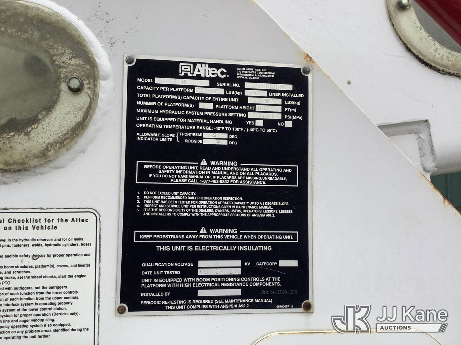 Altec L44E, 49 ft, Over-Center Articulating Bucket Truck s/n 0712BQ0129, with single-man bucket, mounted on 2013 International 4400 Utility Truck, 7.6L L6 Diesel, Automatic, A/C, (167,991 miles) (Runs, Moves & Operates, Hard Start) (Removal is by Appointment Only, Buyer MUST make a appointment prior to picking up, Buyer/Transporter Must have PAID IN FULL RELEASE. No onsite assistance available, Please Come prepared.) This is a Titled Item NOTE: This unit is being sold AS IS/WHERE IS via Timed Auction and is located in Harmans, MD. Inspection & preview days for this unit are by appointment only; please contact us at contact@jjkane.com or 84-Go-JJKane for more details. For pre-sale questions, please contact the on-site office @ (443) 557-0025 or Kevin.Waggoner@JJKane.com. (Missing manuals, See Auction Company for Manufacturers Information to obtain manuals) (Buyer is responsible for removal. Assistance by consignor or JJ Kane Auctions is not assured.)