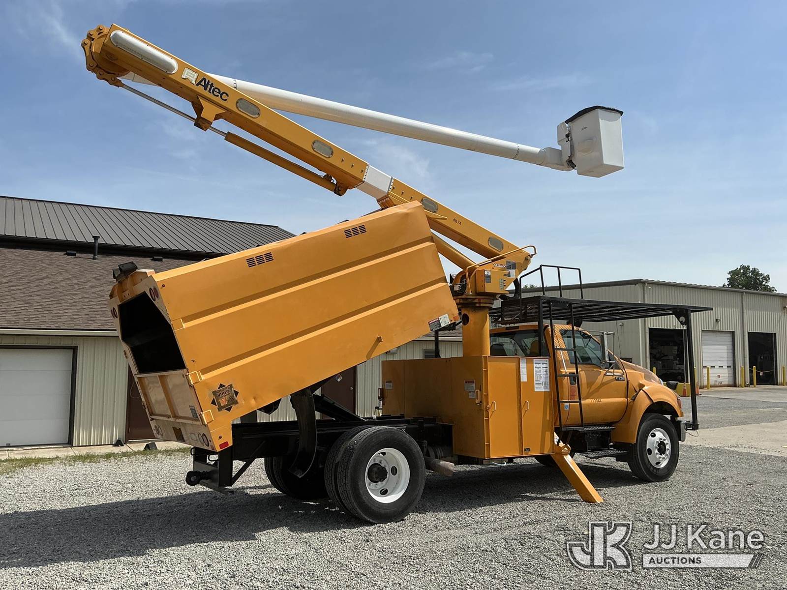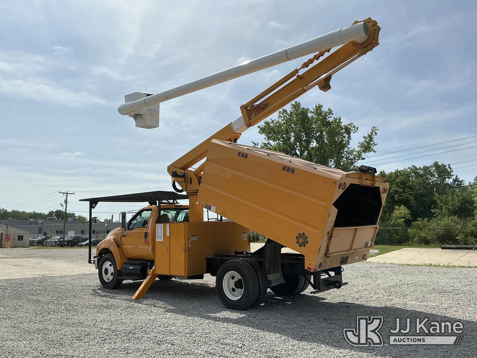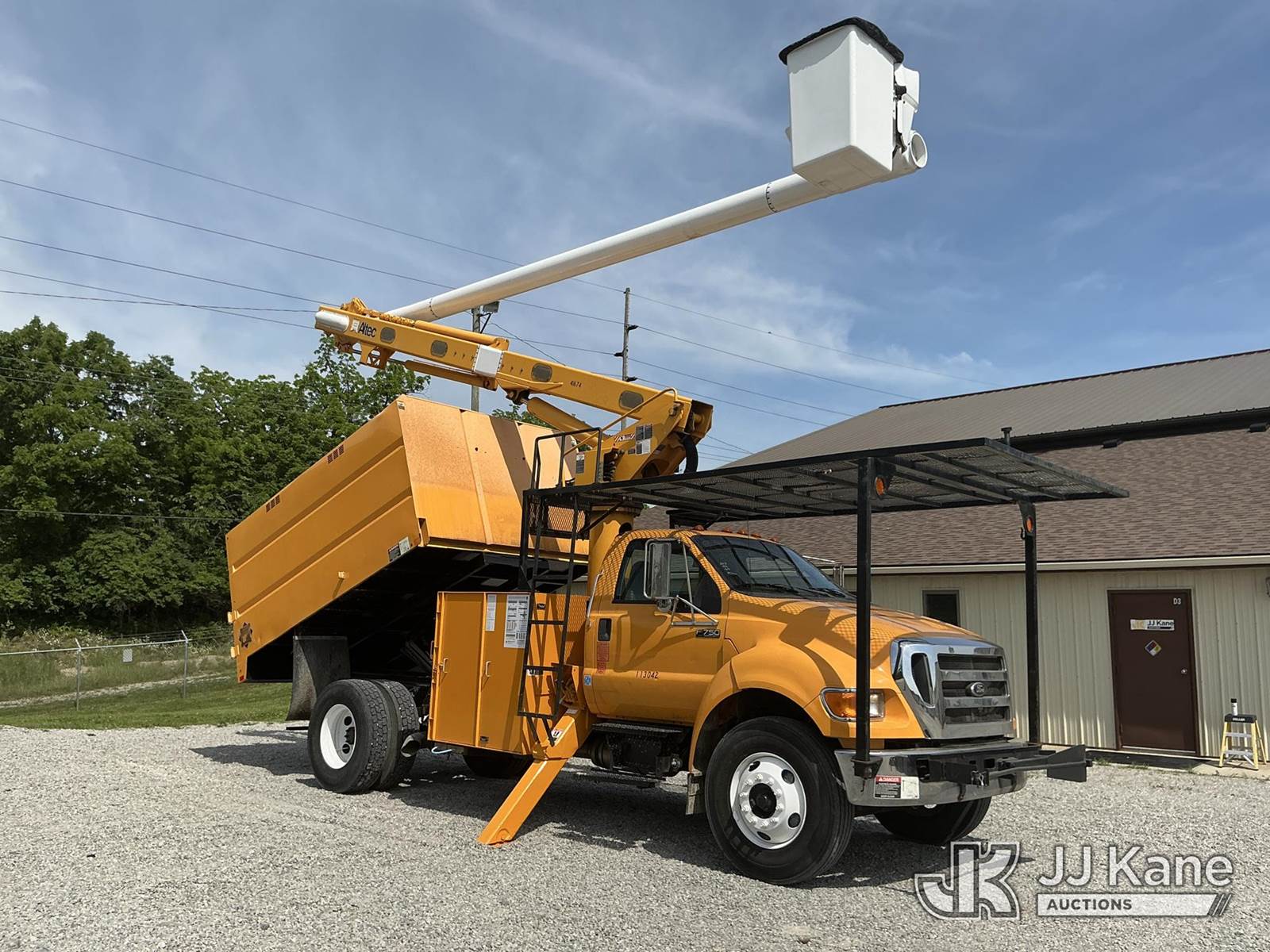 Altec LR756, 61 ft, Over-Center Bucket Truck s/n 0514FF2418, with single-man bucket, mounted behind cab on 2013 Ford F750 Chipper Dump Truck, Cummins 6.7L Auto, diesel, with 11 ft. body, (90,565 miles) (Runs & Moves) (Upper Condition Unknown, Body/Paint Damage) (Sellers Red Tag States: Rotation Gear Out, DO NOT OPERATE, Boom Damage) (**Dealer Only** Seller states this item has been removed from service due to the listed safety repairs not being completed. The safety items below must be completed by an approved OEM facility before the unit can return to service: ROTATION GEARBOX DAMAGED; REQUIRES ANSI INSPECTION FOR ANY ADDITIONAL DAMAGE AND REQUIRED REPAIRS; COMPLETE ANY REQUIRED TESTING AFTER REPAIRS ARE COMPLETED) (Bidding Restricted to Licensed Vehicle Dealers Only), This is a Titled Item NOTE: This unit is being sold AS IS/WHERE IS via Timed Auction and is located in Verona, KY. Inspection & preview days for this unit are the 2 business days prior to the first day of items closing for this auction, item is located at 2841 Verona-Mudlick Rd Ste B Verona, KY 41092 and hours of operations are 8a-4p. For pre-sale questions, please contact Office Staff @ (502) 612-5080. Auctioneer Michael Whitebread / License # 256617. (Manuals provided in cab) (Buyer is responsible for removal. Assistance by consignor or JJ Kane Auctioneers is not assured.)