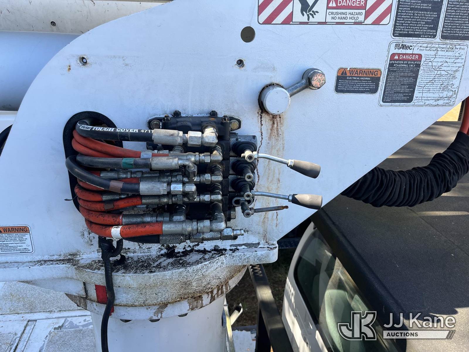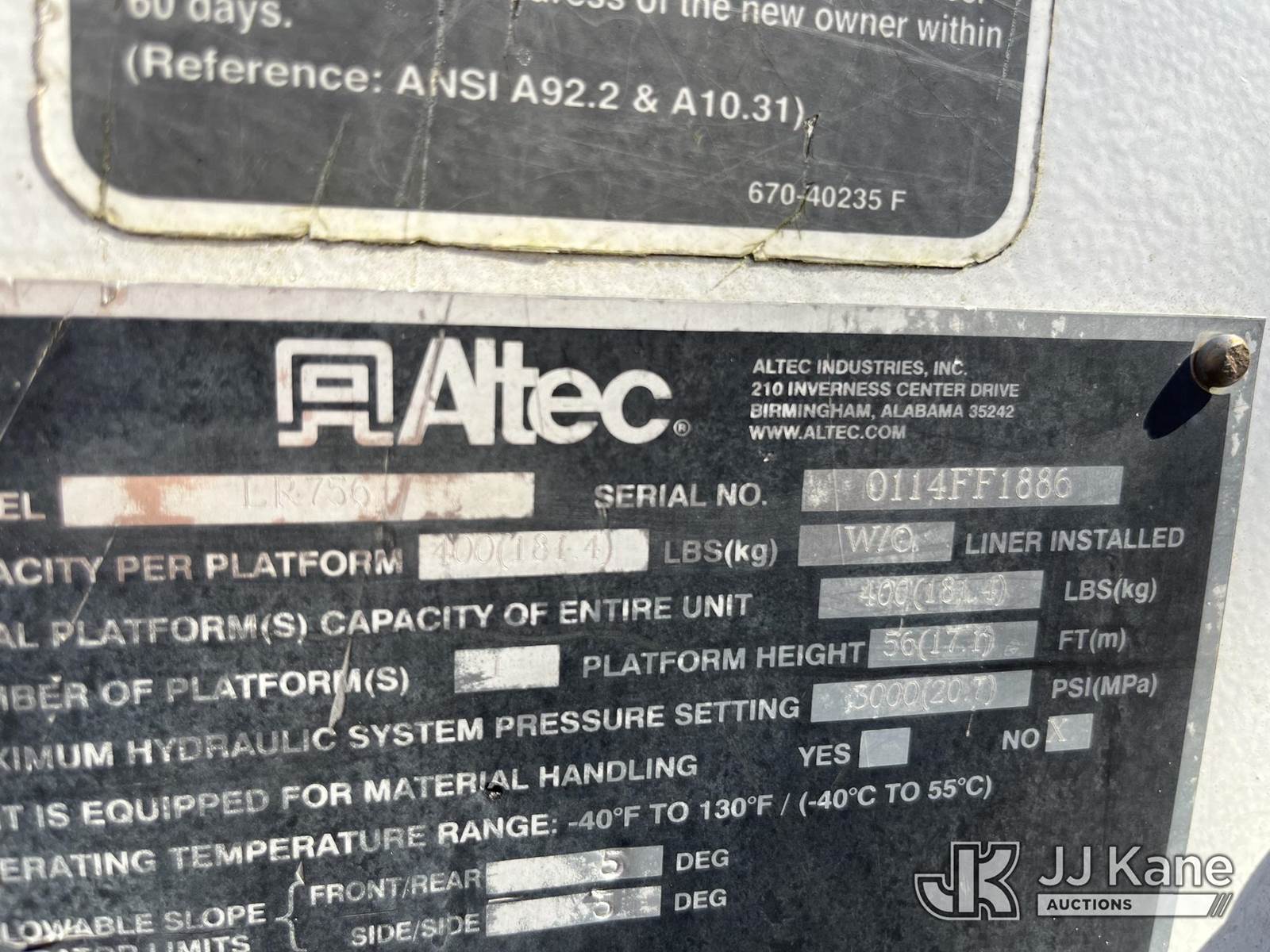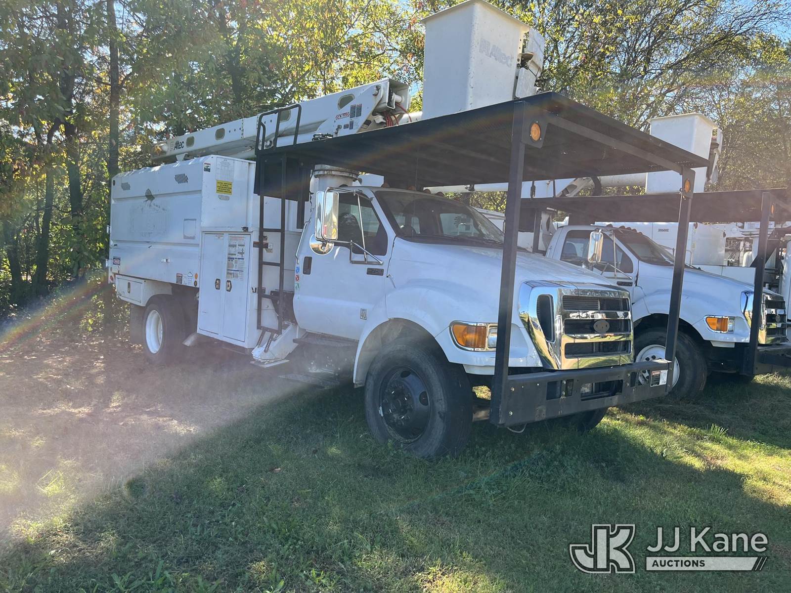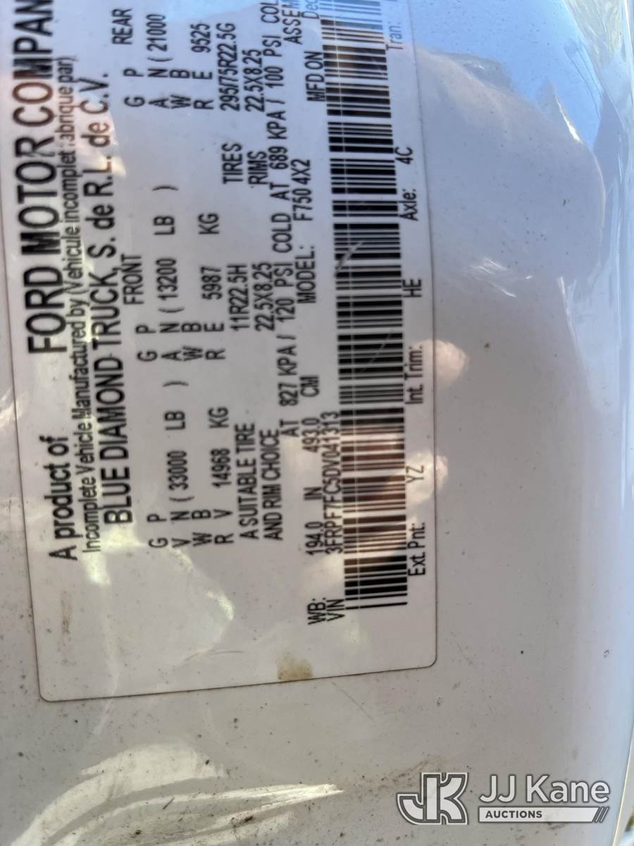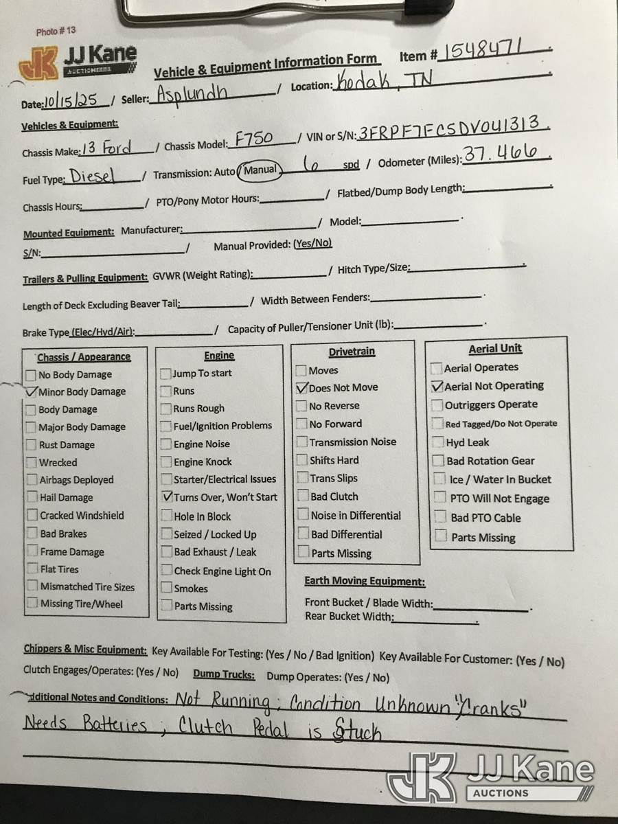 Altec LR756, 61 ft, Over-Center Bucket Truck s/n 0114FF1886, with single-man bucket, two hyd. outriggers, mounted behind cab on 2013 Ford F-750 Regular Cab 2WD DRW Chipper Dump Truck, 6.7L L6 DIESEL 6-spd, 4X2, diesel, (37,466 miles) needs brake booster and transmission, tires, batteries, etc (Not Running, Condition Unknown, Cranks, Upper Condition Unknown, Needs Batteries) (Seller States: Needs Brake Booster & Transmission, Tires, Batteries, Etc.) This is a Titled Item NOTE: This unit is being sold AS IS/WHERE IS via Timed Auction and is located in Kodak, TN. Inspection & preview days for this unit are by appointment only; please contact us at contact@jjkane.com or 84-Go-JJKane for more details. (Missing manuals, See Auction Company for Manufacturers Information to obtain manuals) (Buyer is responsible for removal. Assistance by consignor or JJ Kane Auctioneers is not assured.)