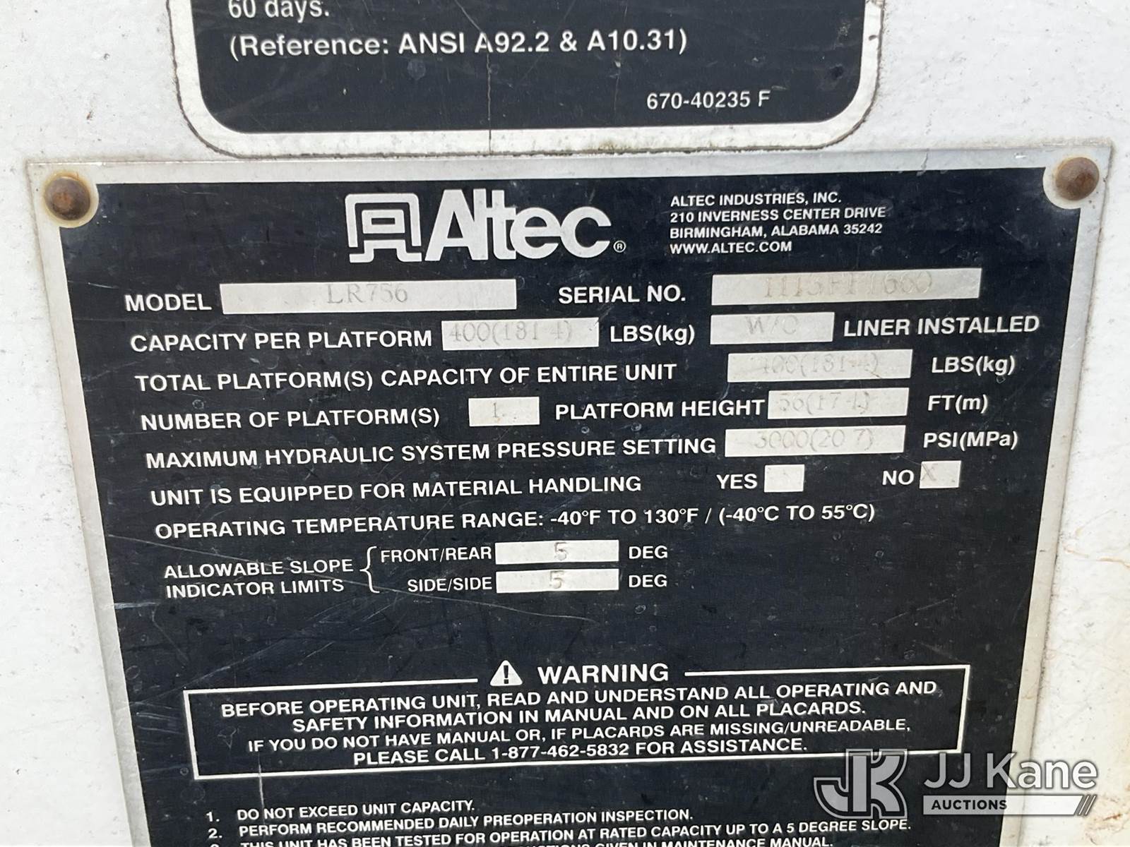 Altec LR756, 61 ft, Over-Center Bucket Truck s/n 1113FF1660, with Single-Man Bucket, mounted behind cab on 2013 Ford F-750 Chipper Dump Truck, 6.7L L6 DIESEL 4X2, manual, A/C, (116,973 miles) Needs Engine & ABS Module (Runs, Moves & Upper Operates) (Check Engine Light On, Seller States: Needs Engine & ABS Module) This is a Titled Item NOTE: This unit is being sold AS IS/WHERE IS via Timed Auction and is located in Waxahachie, TX. Inspection & preview days for this unit are the 2 business days prior to the first day of items closing for this auction, item is located at 999 Solon Rd Waxahachie, TX 75165 and hours of operations are 8a-4p. For pre-sale questions, please contact Alex Bayless @ (469) 550-4938. (Manuals provided in cab) (Buyer is responsible for removal. Assistance by consignor or JJ Kane Auctions is not assured.)